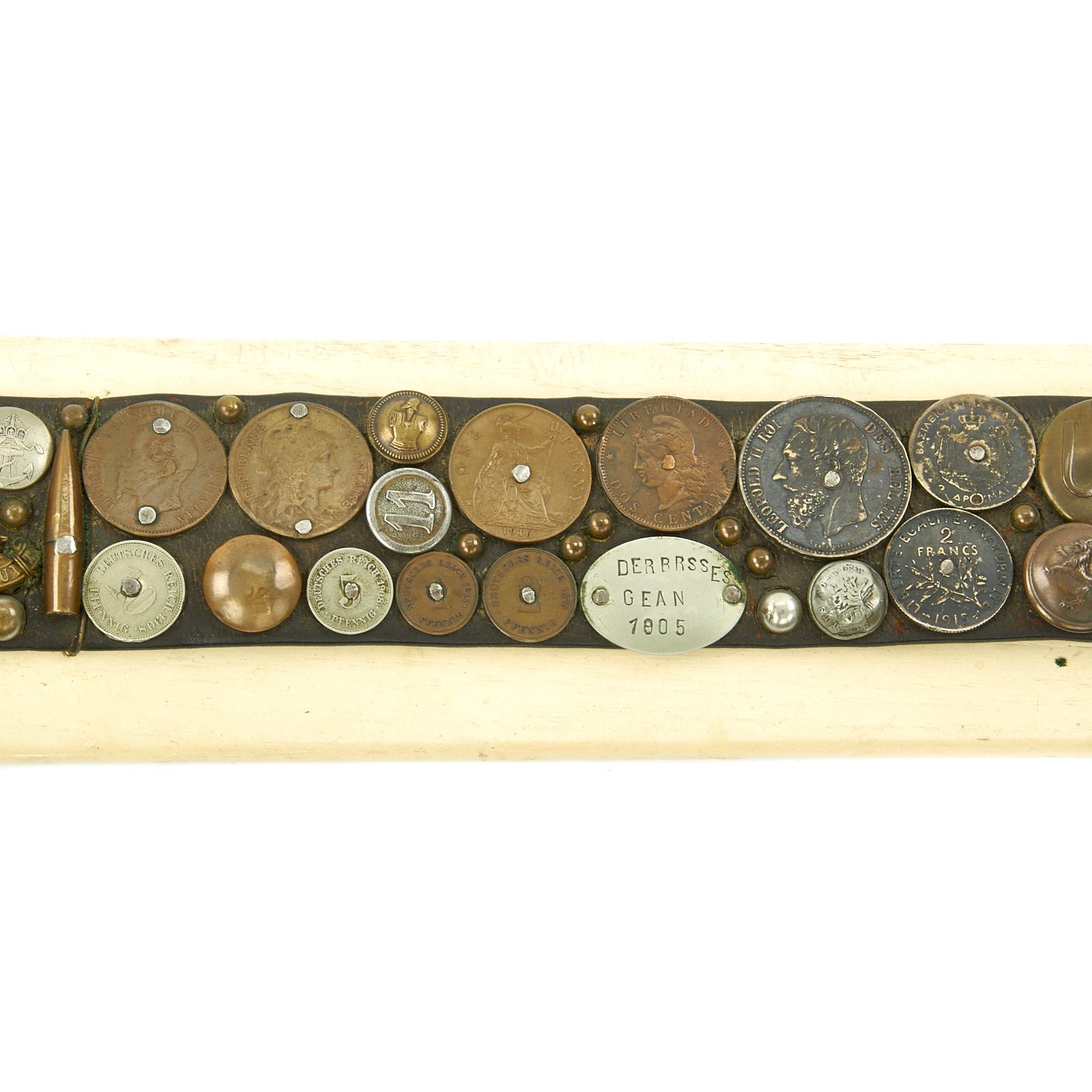 This incredible belt is mounted on a white back board and measures 35 inches by 2.5 inches wide. It features over 40 buttons, badges, coins and pins from both Allied and Axis nations. It is one of the most stunning examples of a hate belt we've ever seen.