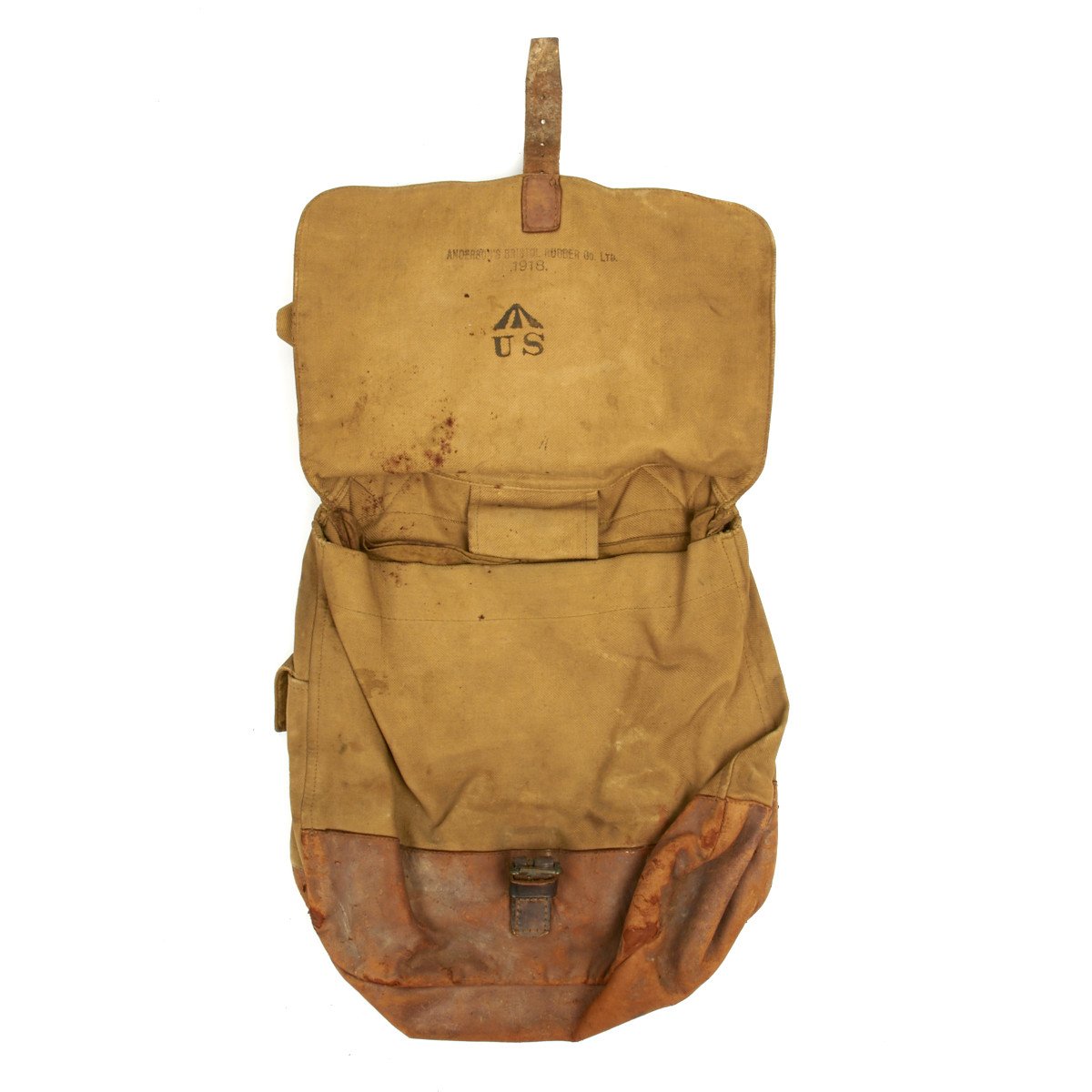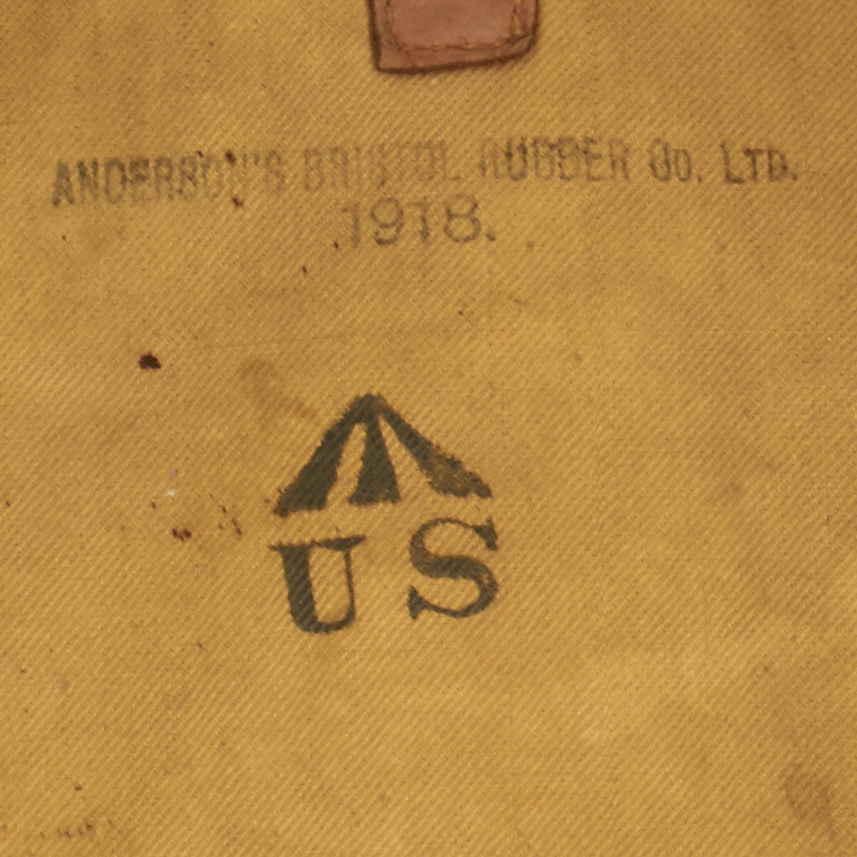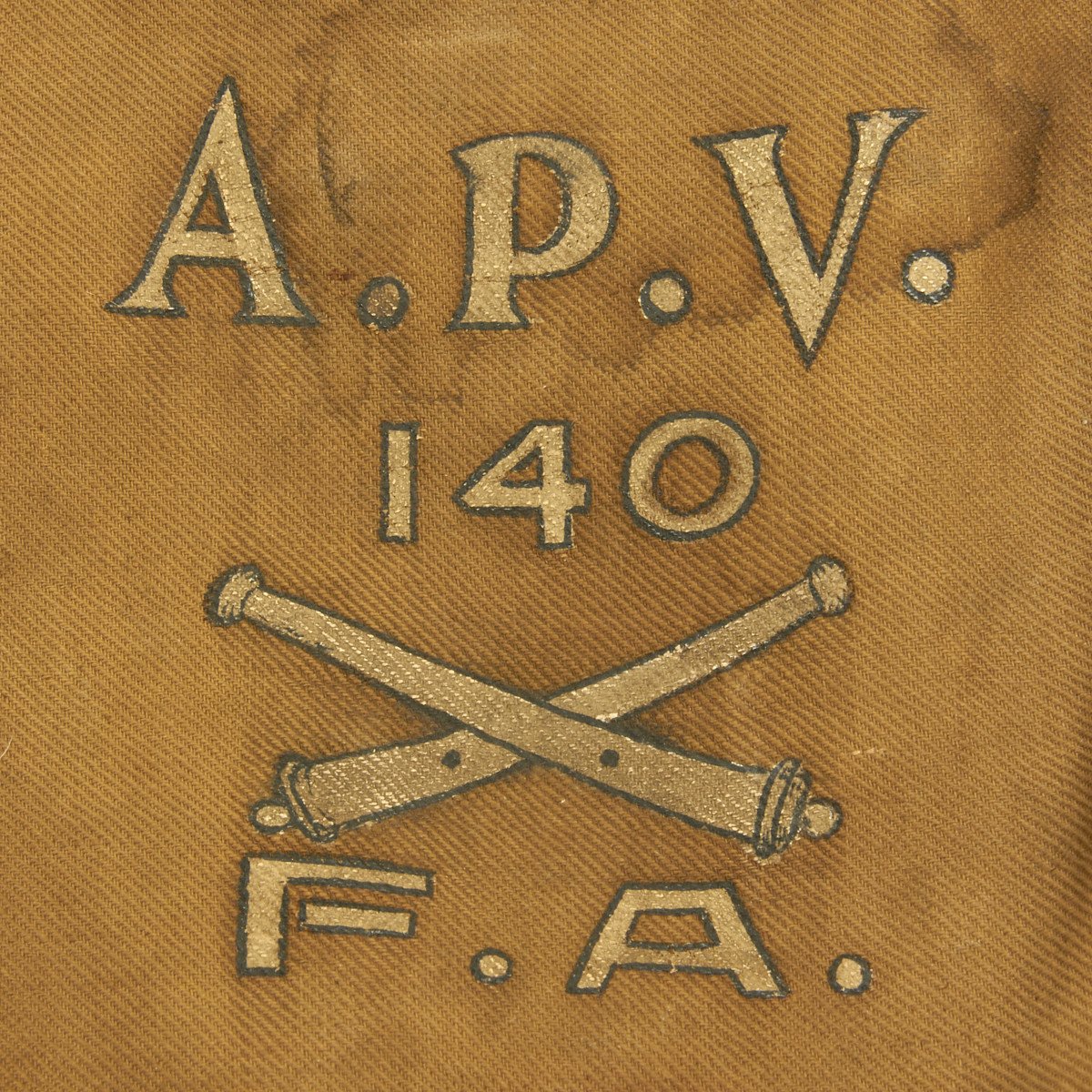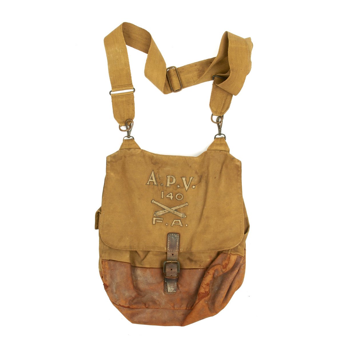 Hand painted satchel bread bad that reads: A.P.V 140 FA with crossed cannons.