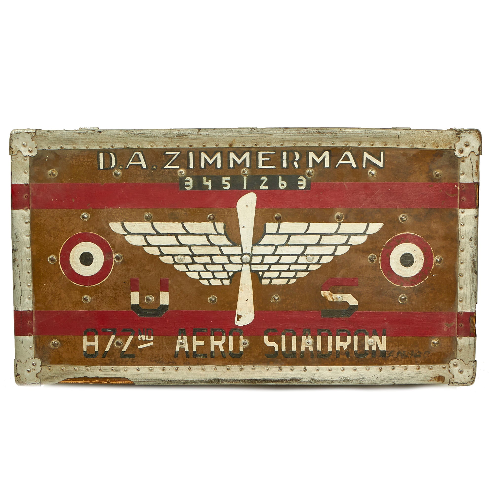 Original Item: One-Of-A-Kind. This is a fantastic example of a WWI era personalized, named and painted wood footlocker. The footlocker belonged to “D.A. Zimmerman”, a mechanic (assumed) with the 872nd Aero (repair) Squadron. We have not found any other 872nd Aero Squadron aside from the Repair Squadron. The paint is retained very well and the detail in the design is quite lovely. A perfect central focal point to build a WWI Air Service display around!
