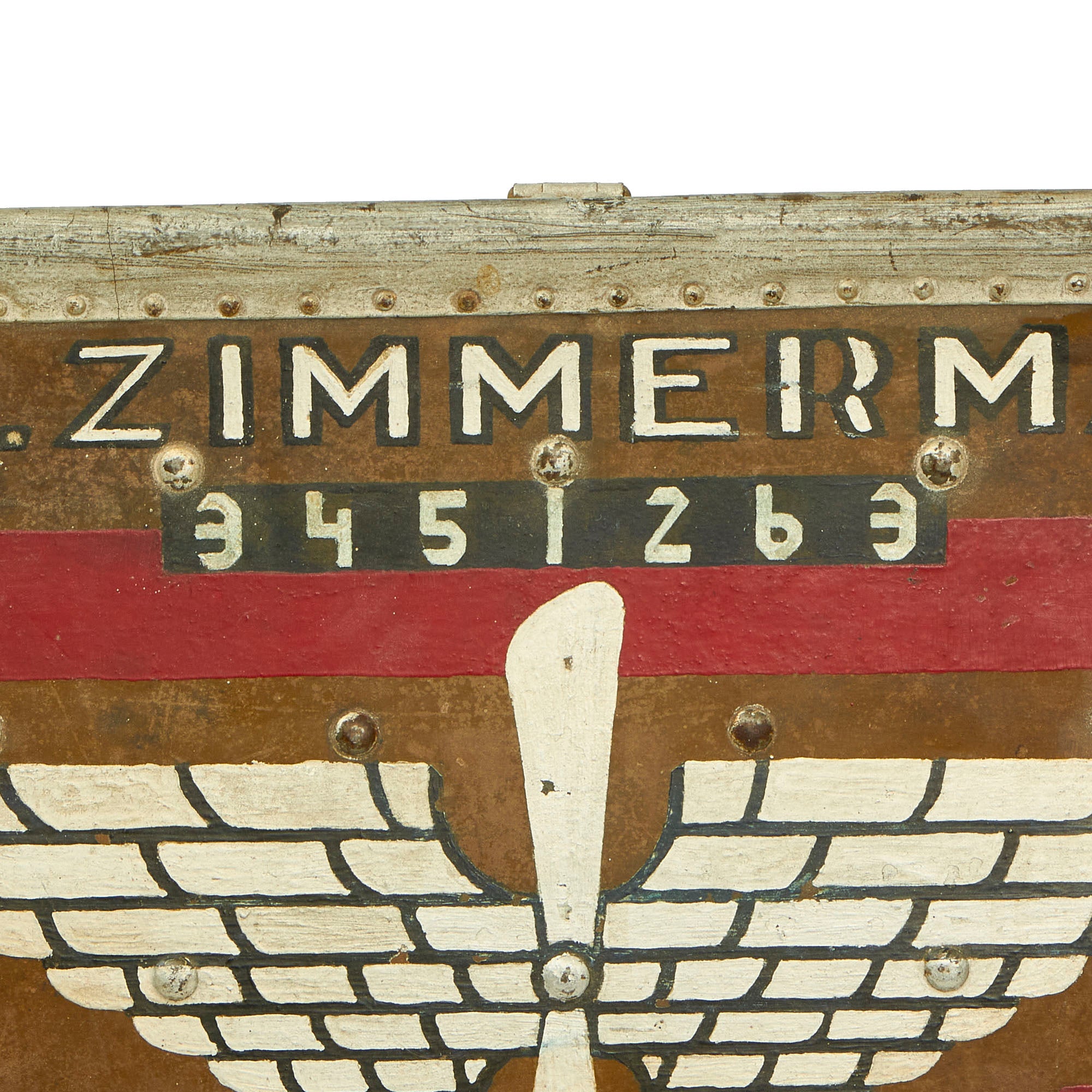 The top lid of the footlocker is beautifully painted with US Air Service roundels and “wings”. The name D.A. ZIMMERMAN is painted on the front with his service number 3451263 painted beneath and 872nd AERO SQUADRON present at the bottom. Both leather carry handles are retained on each side and only one small insert is present on the interior. The interior lid has multiple names and their respective homes written in purple laundry marking, making some excellent research opportunities. Measures 31" x 17" x 13".