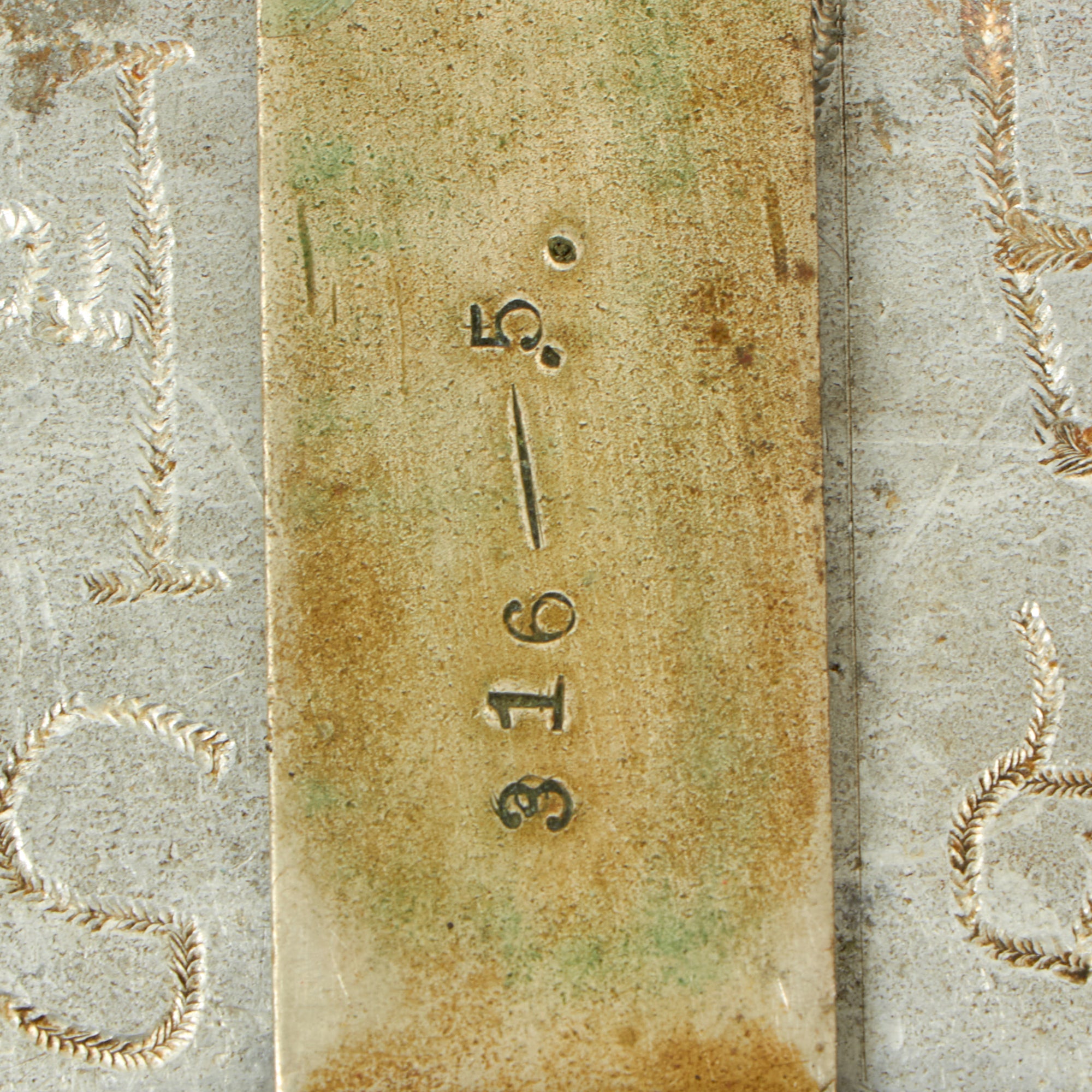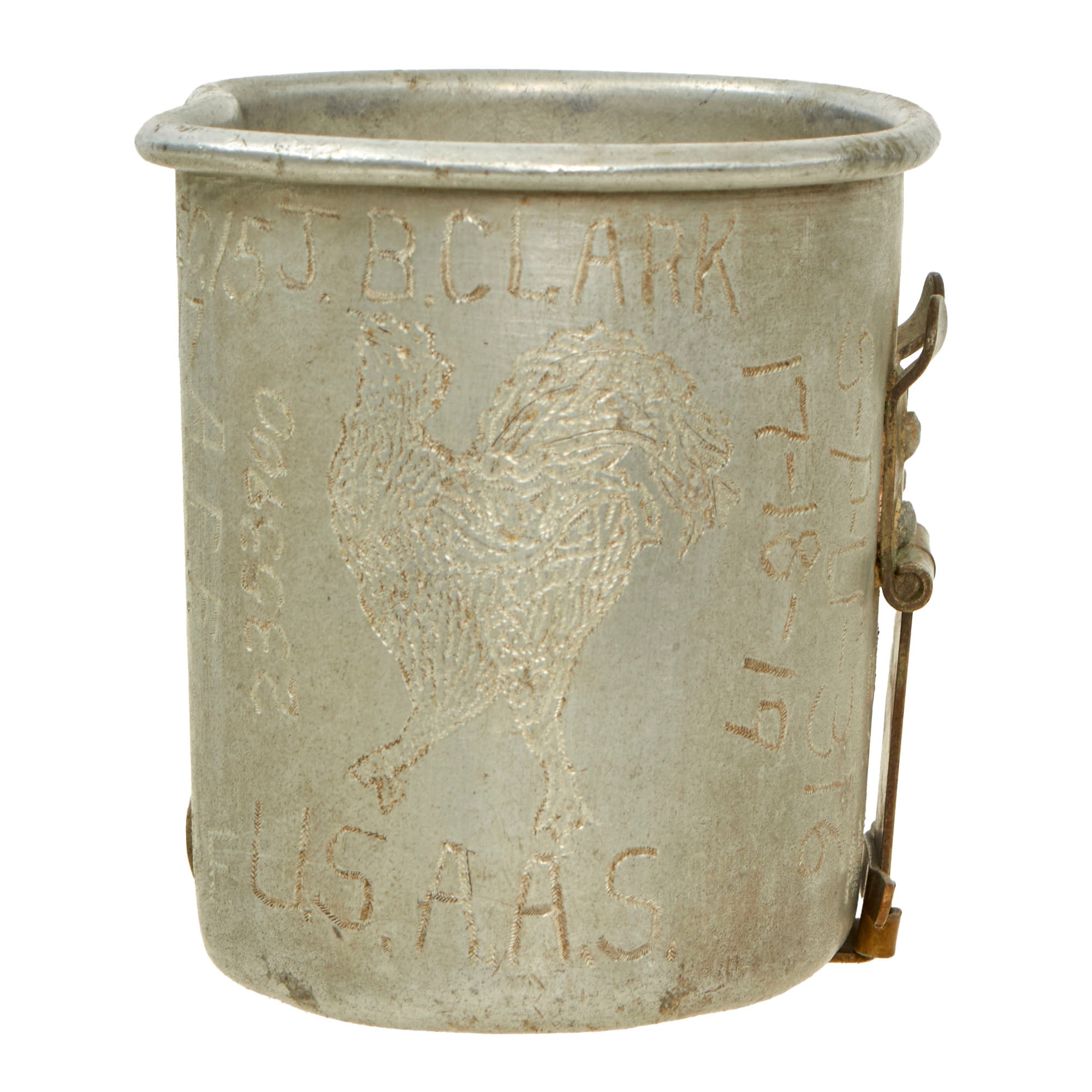 The canteen cup is entirely covered in Clark’s travel diary, and on the side he engraved the Gaalic Rooster with U.S.A.A.S. under it, for the United States Army Ambulance Service. Clark likely spent time serving with an Ambulance unit while in France. The different locations engraved include AIX-LES-BAINS, CHAUMONT H.Q., N.N.VA, FERRIERE, REIMS, LAON, LYONS, AULNOIS, VERSAILLES, EPERNAY, BELLFORT, BEAUVAIS, LE MANS, BRESLES, LA FERTE MILON, CHALONS S/MARNE, ST. NAZAIRE, ANGERS SEMILLY, MANTE, BREST, PARIS, AGONY, MADAWASKA, DEC. 15 1917. The handle of the cup is stamped 316-.5. For his unit, SPU 316.
