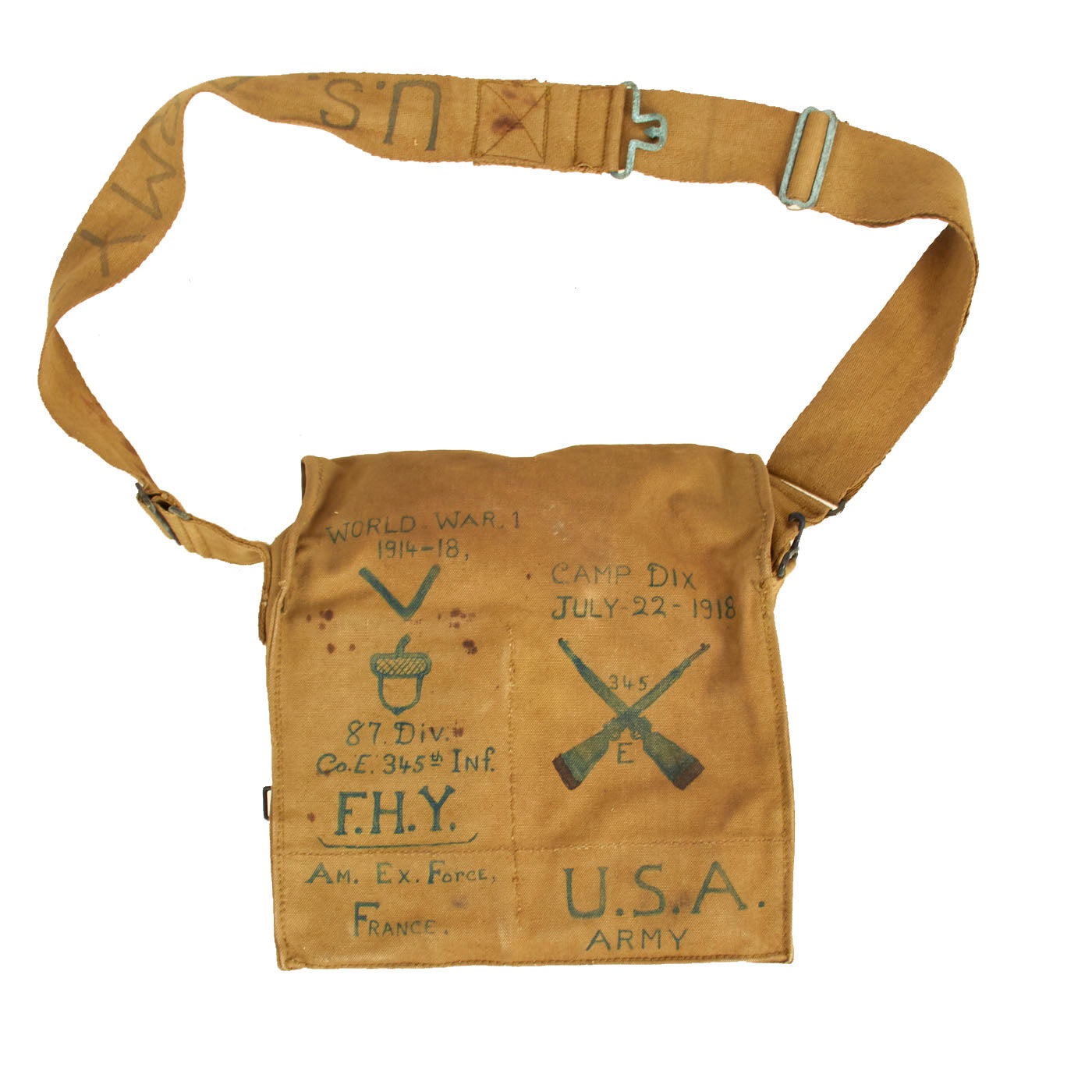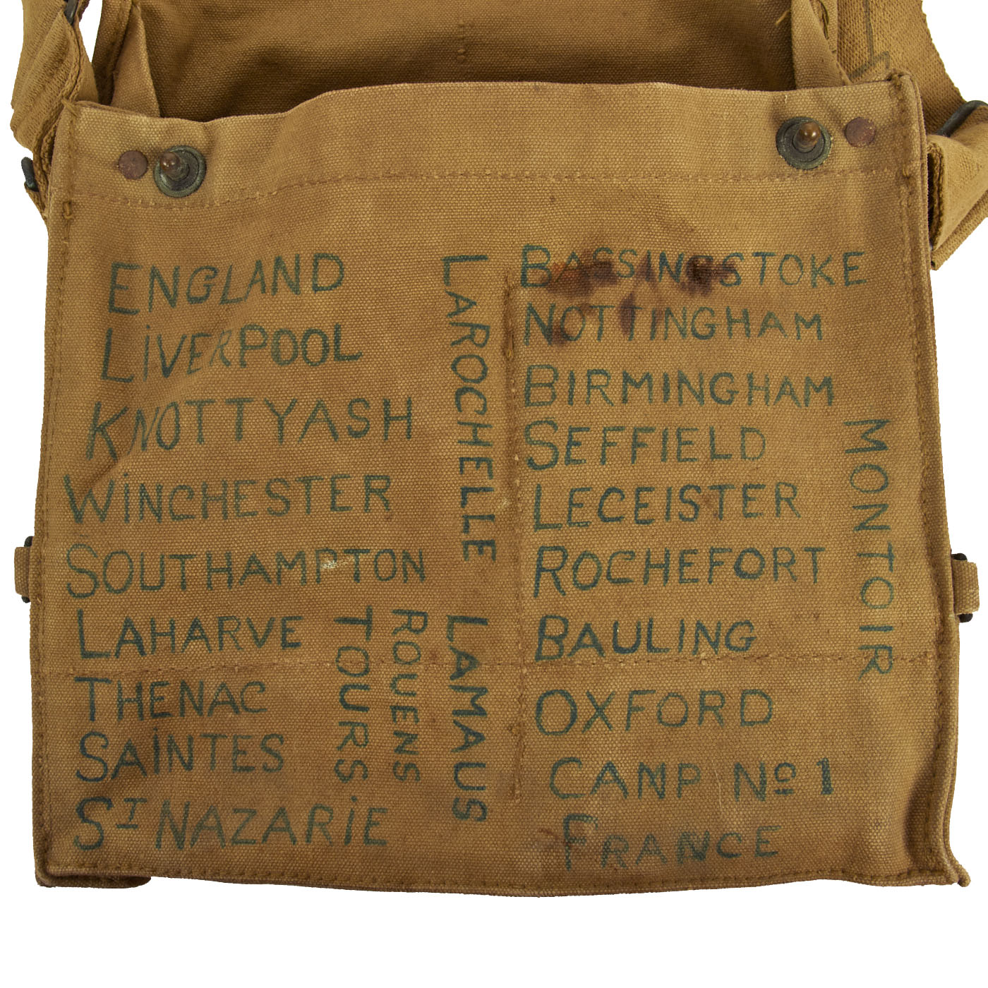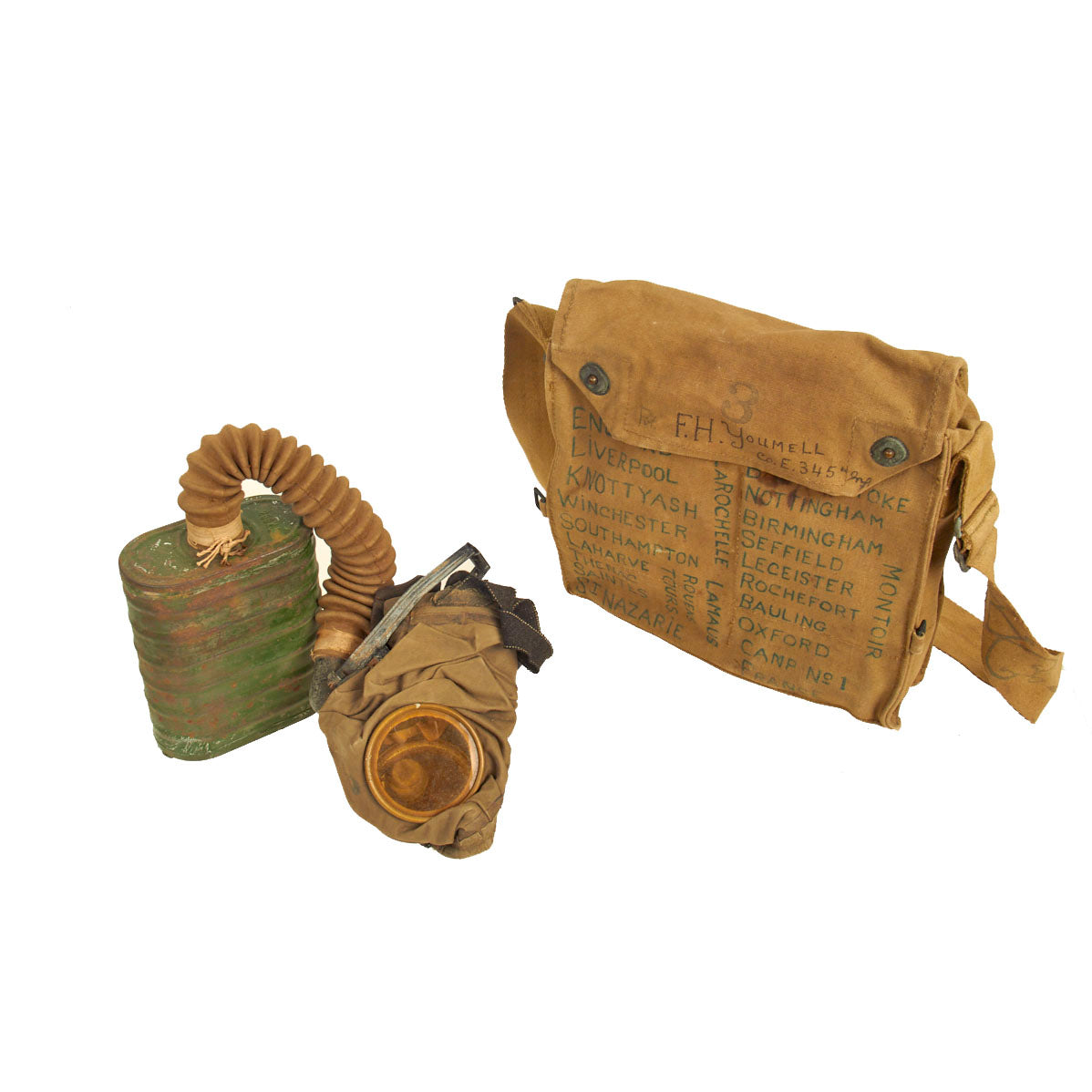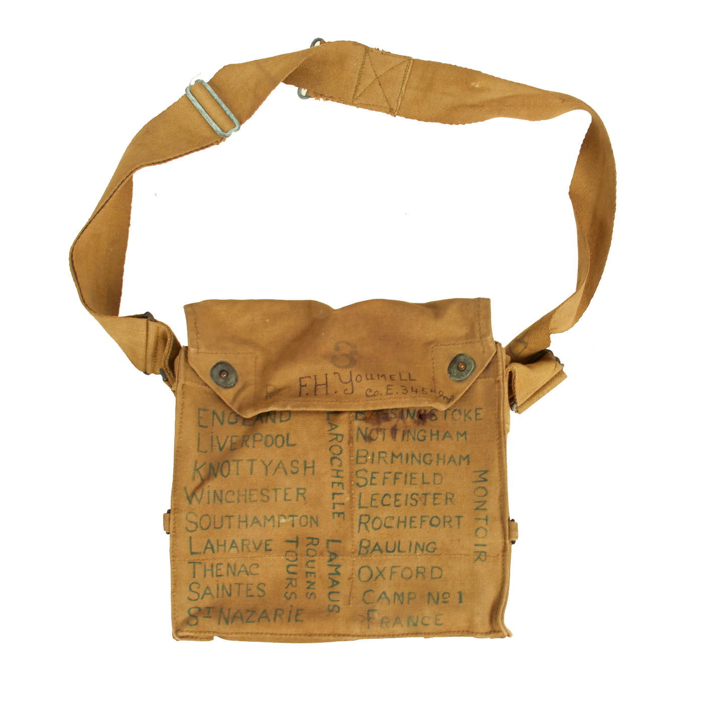 The front side of the gas mask satchel has the name F.H. YOUMELL and what appears to be a list of locations in chronological order of travel: ENGLAND, LIVERPOOL, KNOTTY ASH, WINCHESTER, SOUTHAMPTON, LE HAVRE, THENAC, SAINTES, ST NAZAIRE, LA ROCHELLE, LAMAUS, ROUENS, TOURS, BASINGSTOKE, NOTTINGHAM, BIRMINGHAM, SHEFFIELD, LECEISTER, ROCHEFORT, BAULING, OXFORD, CAMP NO 1, FRANCE and MONTOIR.