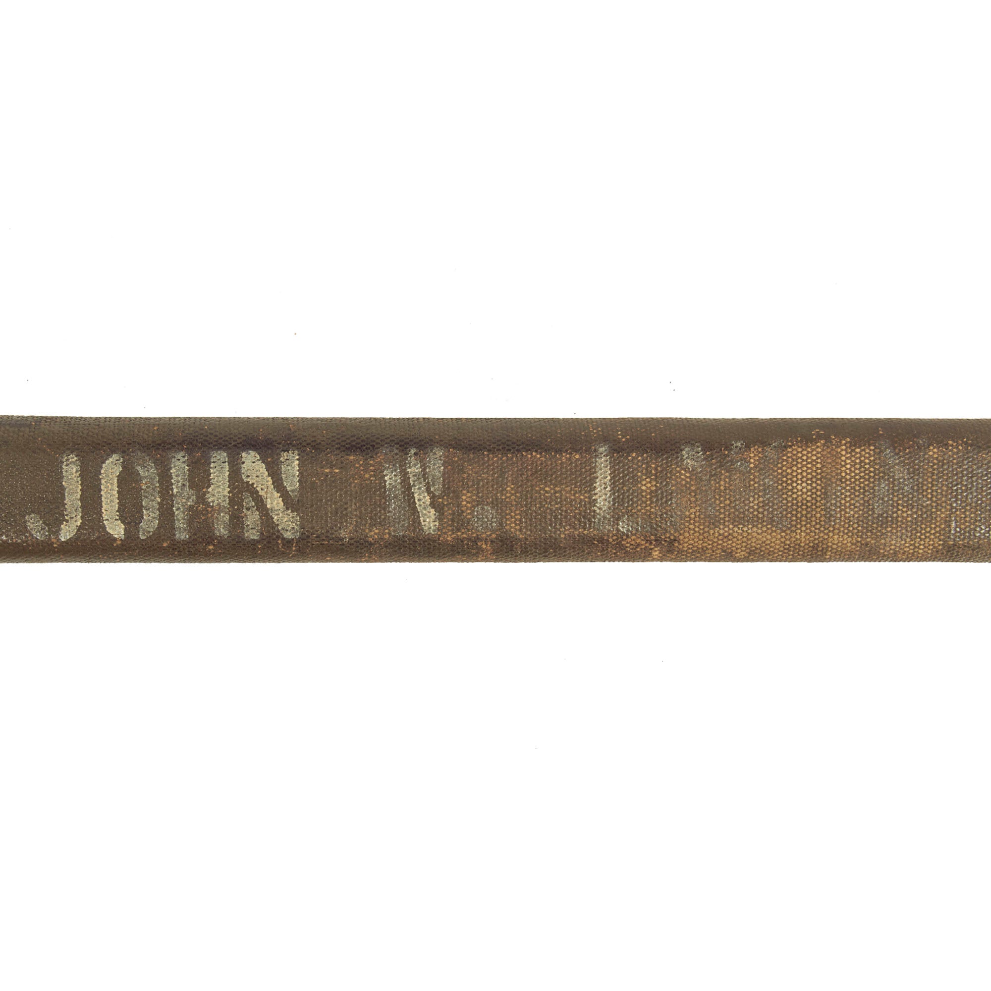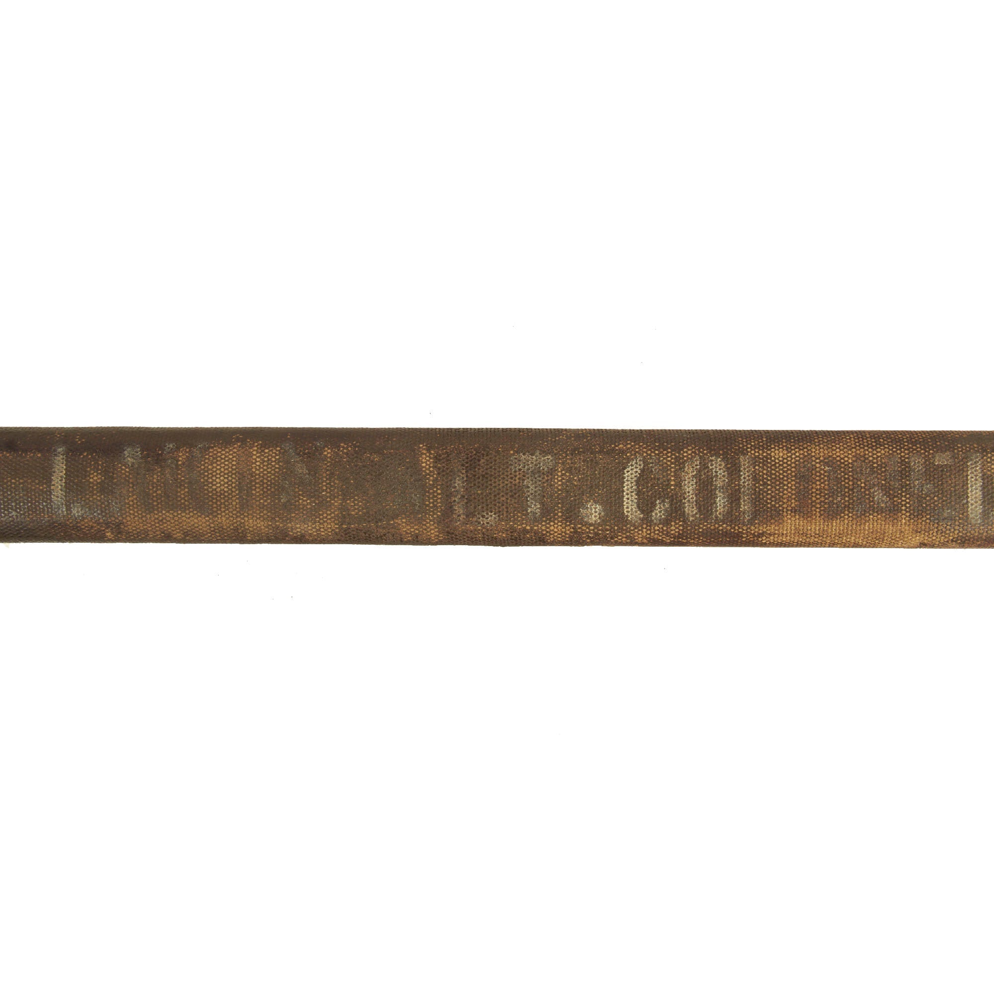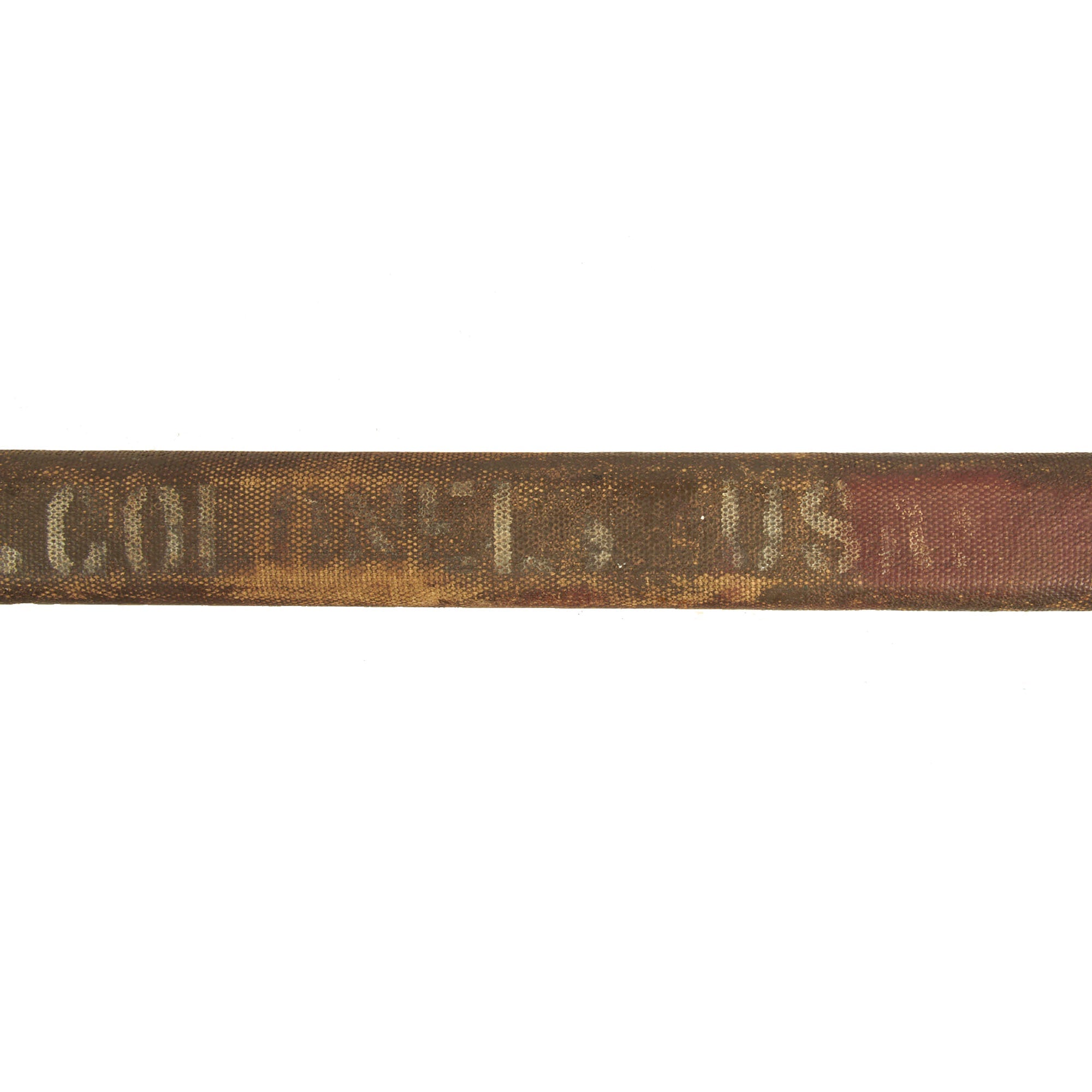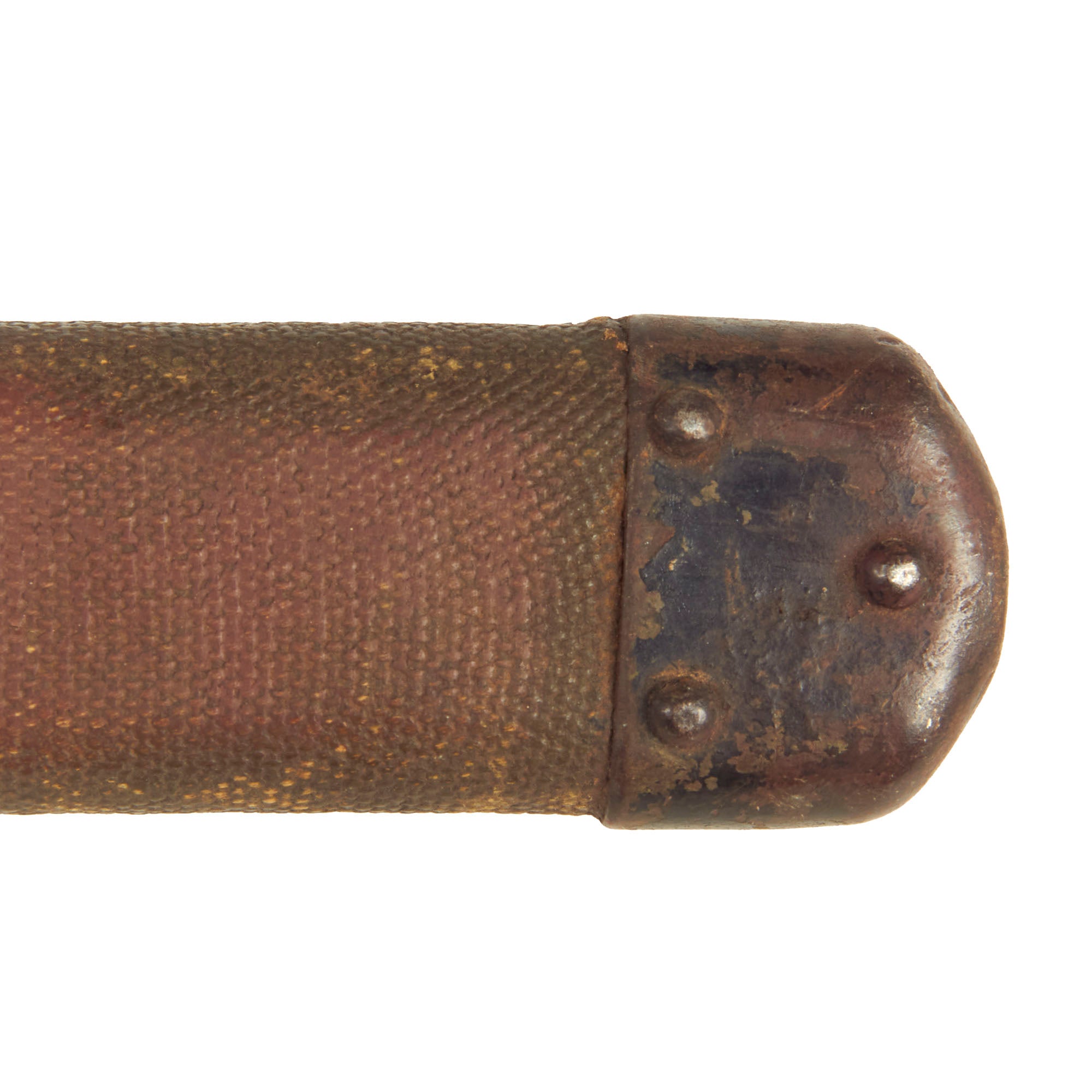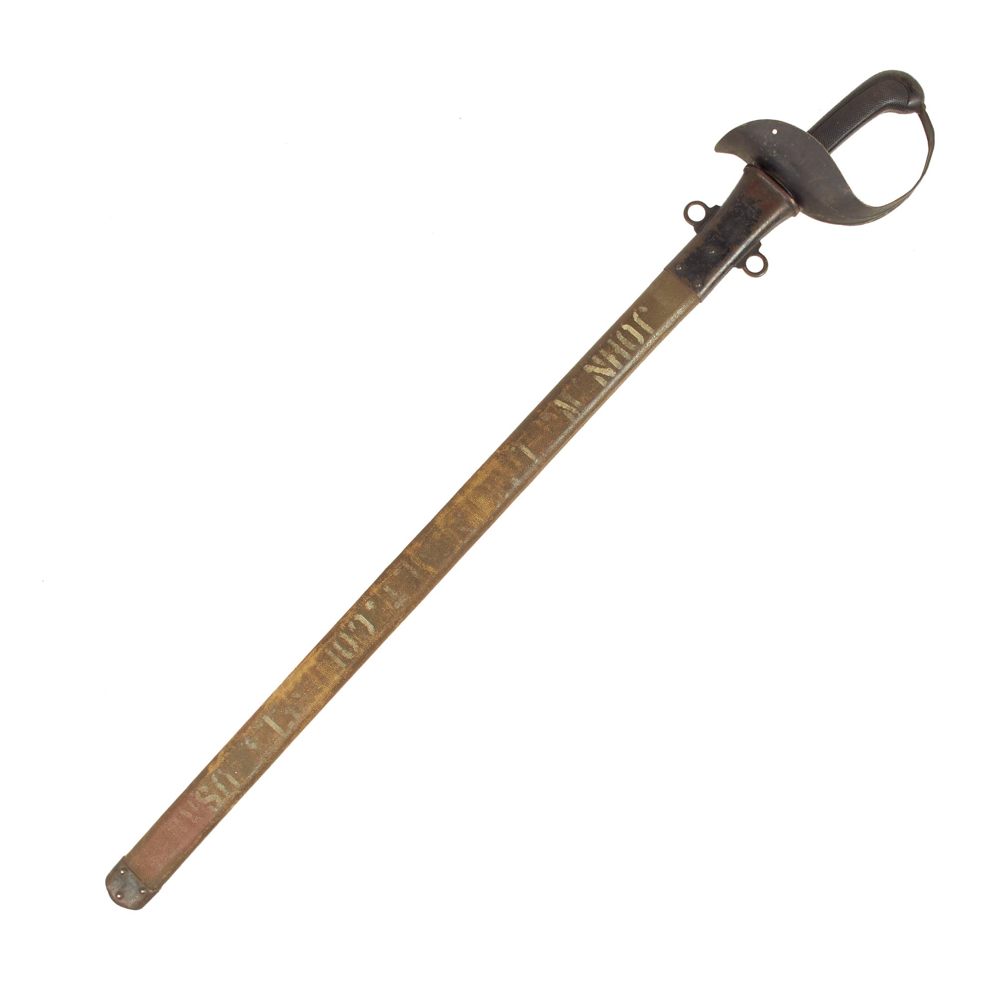 Blade condition is very good, with a wonderful patina, and only a few nicks on the edge. There are a few areas of light pitting and staining, however the vast majority is still a lovely bright steel. The canvas on the scabbard is intact with light staining from age, and no major wear or damage. There is a faded name on the canvas and we can make out was appears to be JOHN W. LAKIN LT. COL. USA. We have not been able to find any service information and the last name could be different from what we can read. The heavy steel guard is in great shape, as is the grip, which shows only light dents, though the paint is somewhat worn.