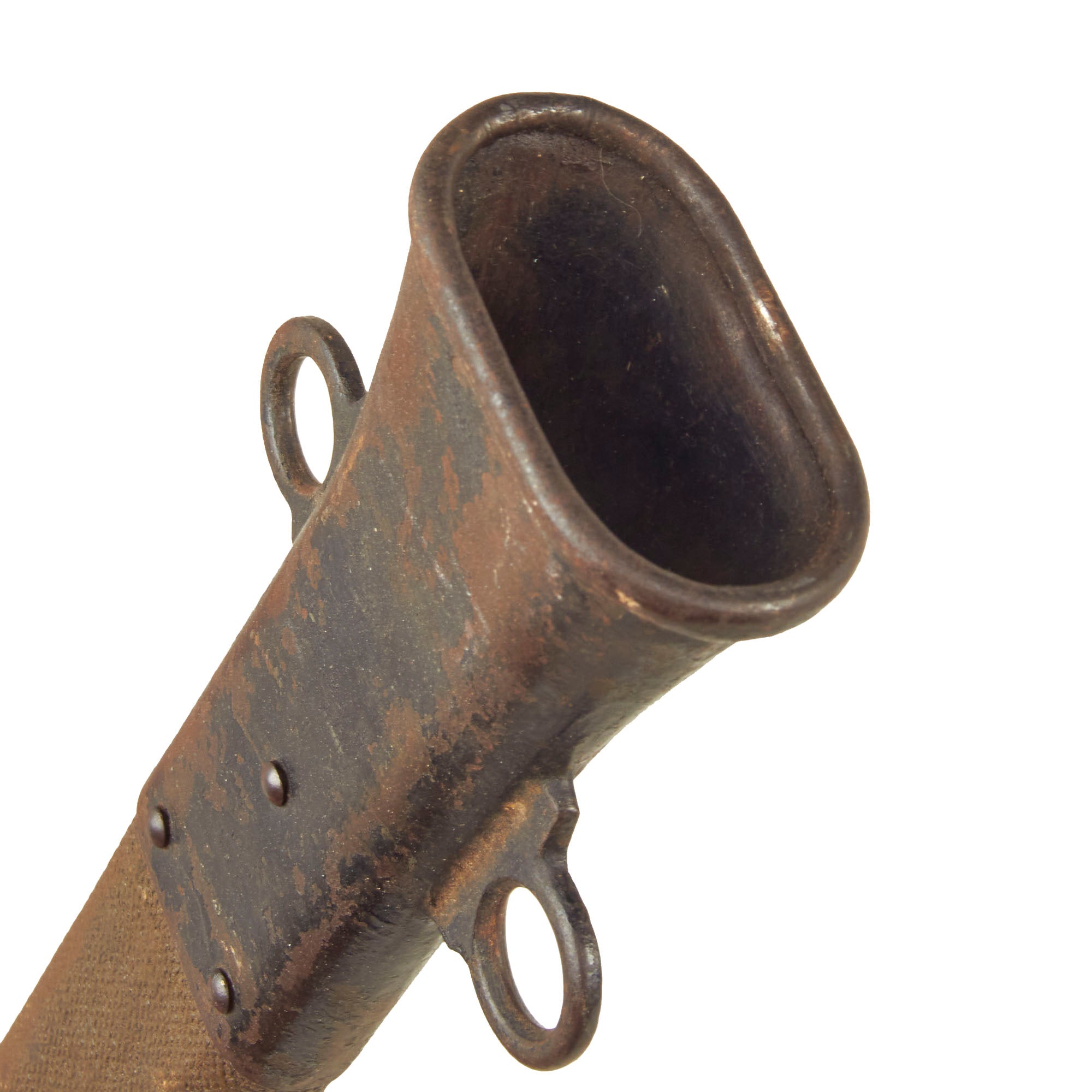The scabbard has a wooden body covered in khaki canvas with a large wide steel throat and a plain drag both of which are darkened like the grip. Canvas covering is in excellent condition. One area is about 6.00 inches up from the drag and meas. approx. 2.00 inches long. The other is on the opposite side about 9.00 inches below the throat and measures. approx. 3.00 inches.