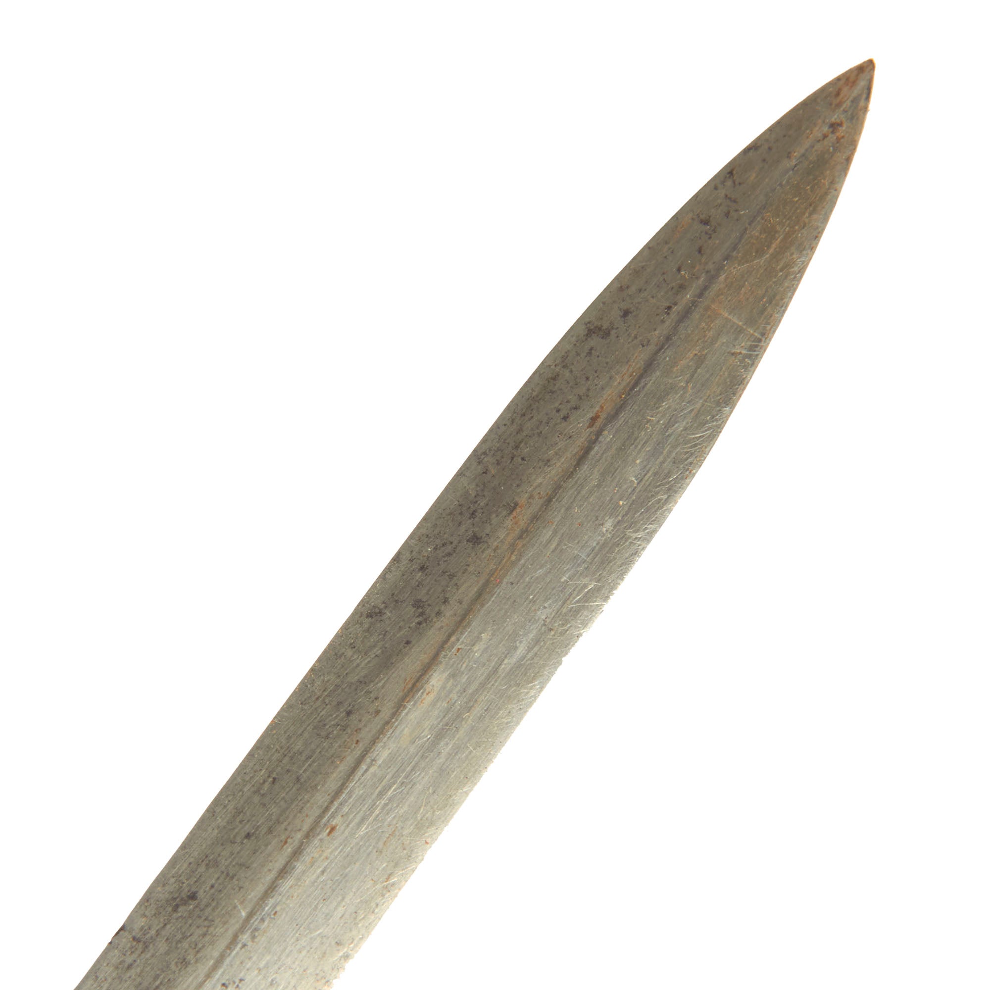 This sword features a 35 inch long blade that tapers toward the point with a deep central fuller running from the ricasso to within approx. 5.00 inches of the point. The blade is double-edged and in good condition with some mottling to be seen. Edges are free of nicks.
