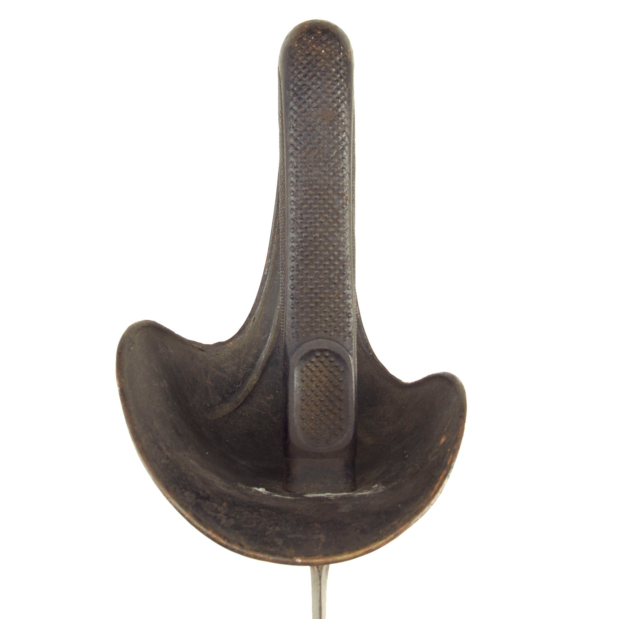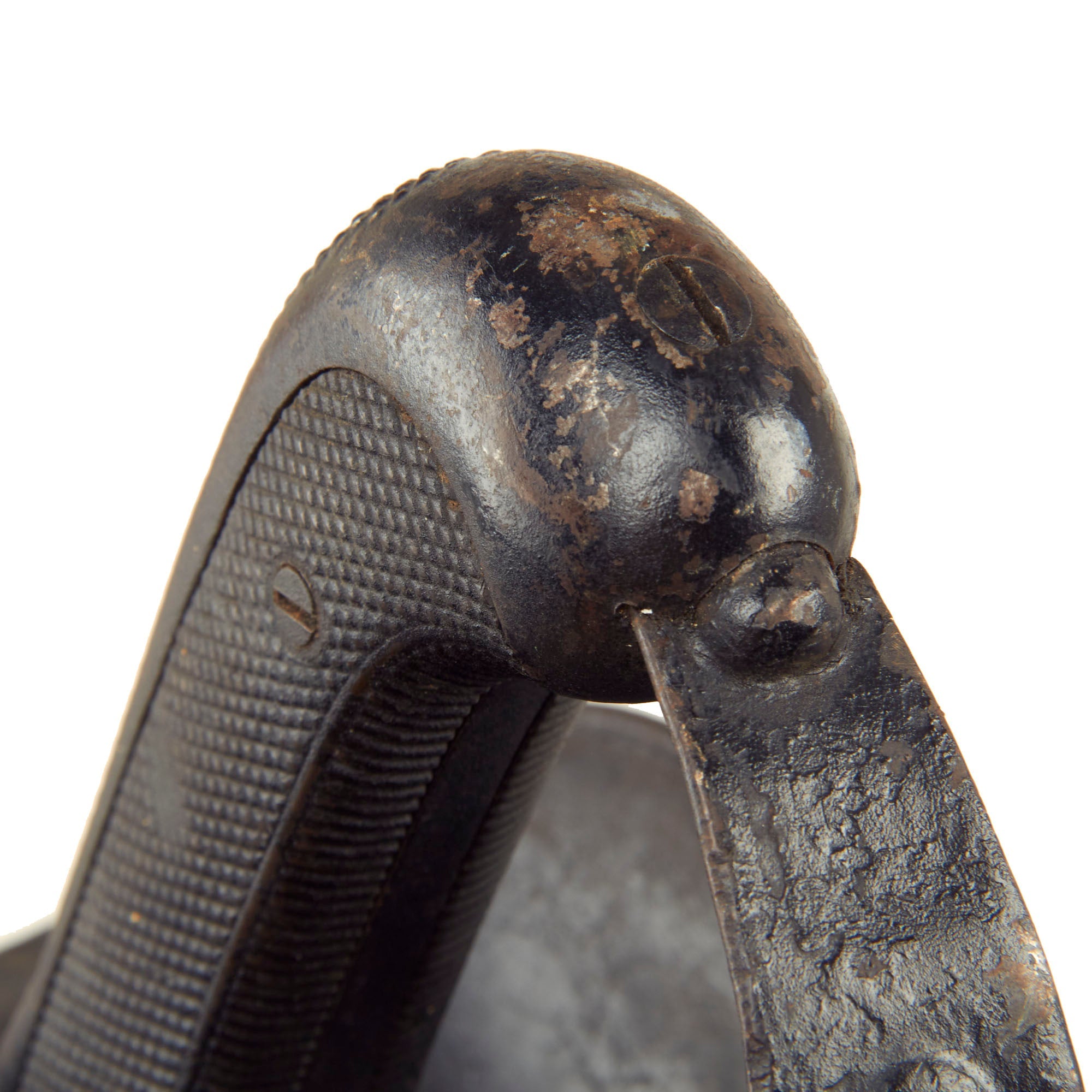 - It has a blued steel (some were nickel plated) "cup-hilt" and a black composition grip.