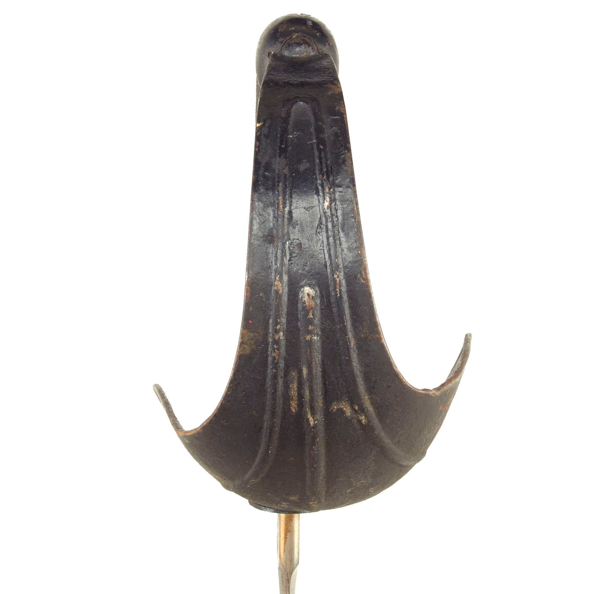 The grip is made of steel with a crosshatched surface for better grip. The top of the grip just behind the guard has a recessed area for resting the thumb. The pommel is smooth and convex. There is a screw through the pommel cap and two lateral screws holding the grip together. The guard is made of a single heavy sheet of steel molded into a full basket with three ridges in the area of the knucklebow. Both the grip and the guard are blackened. All is in excellent condition.