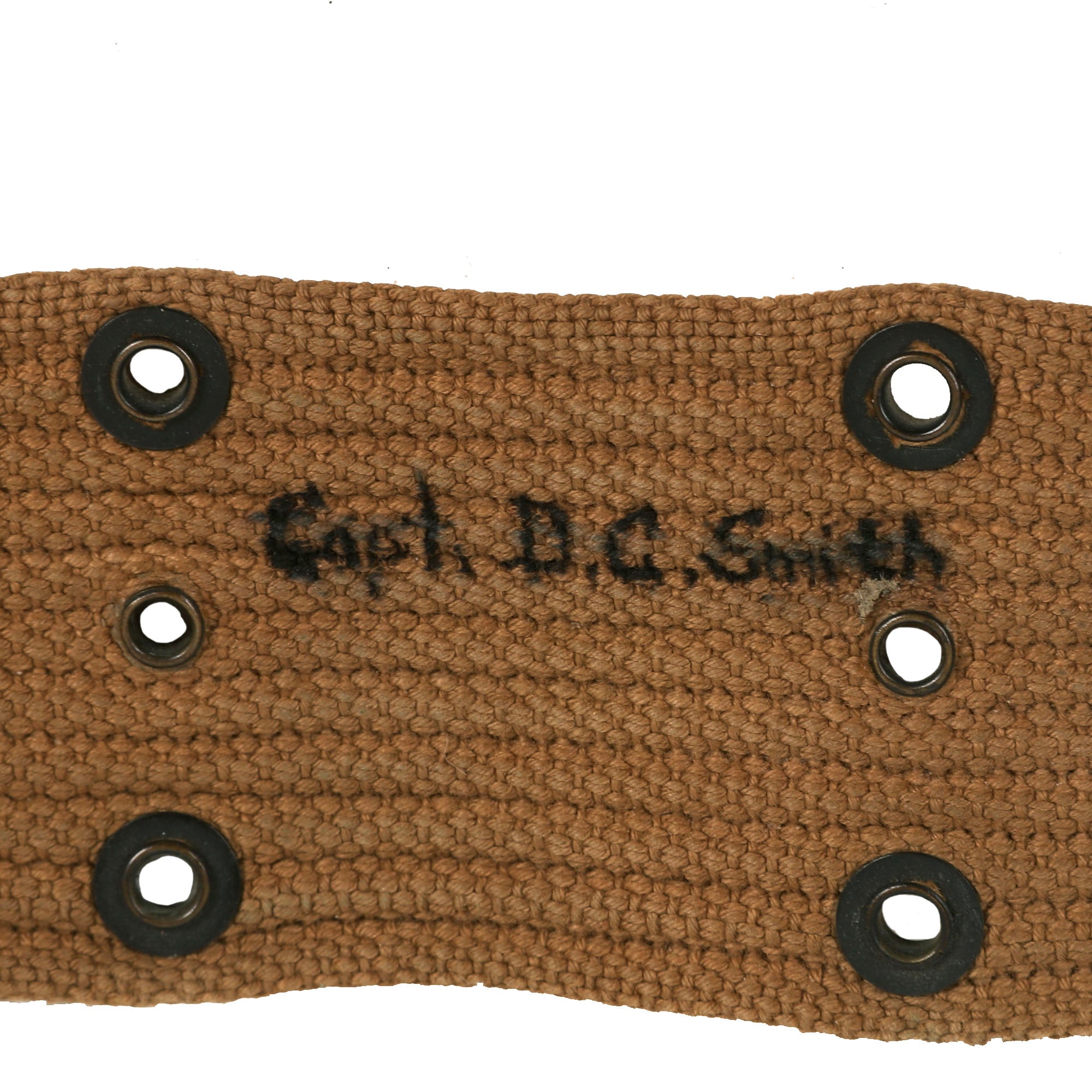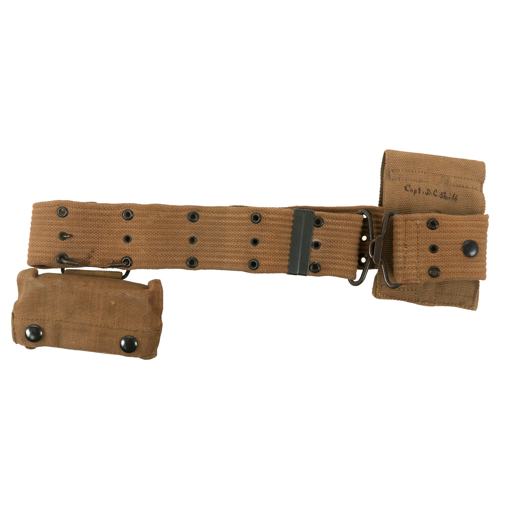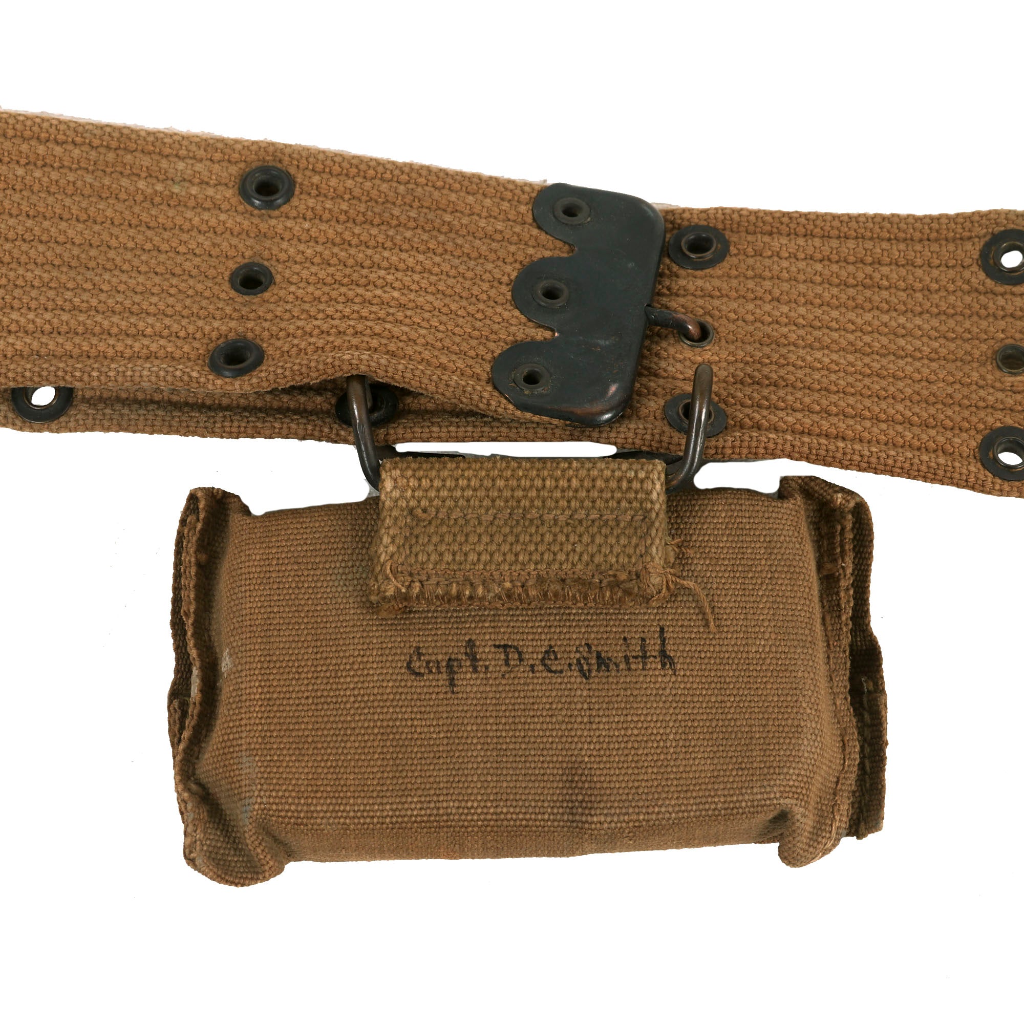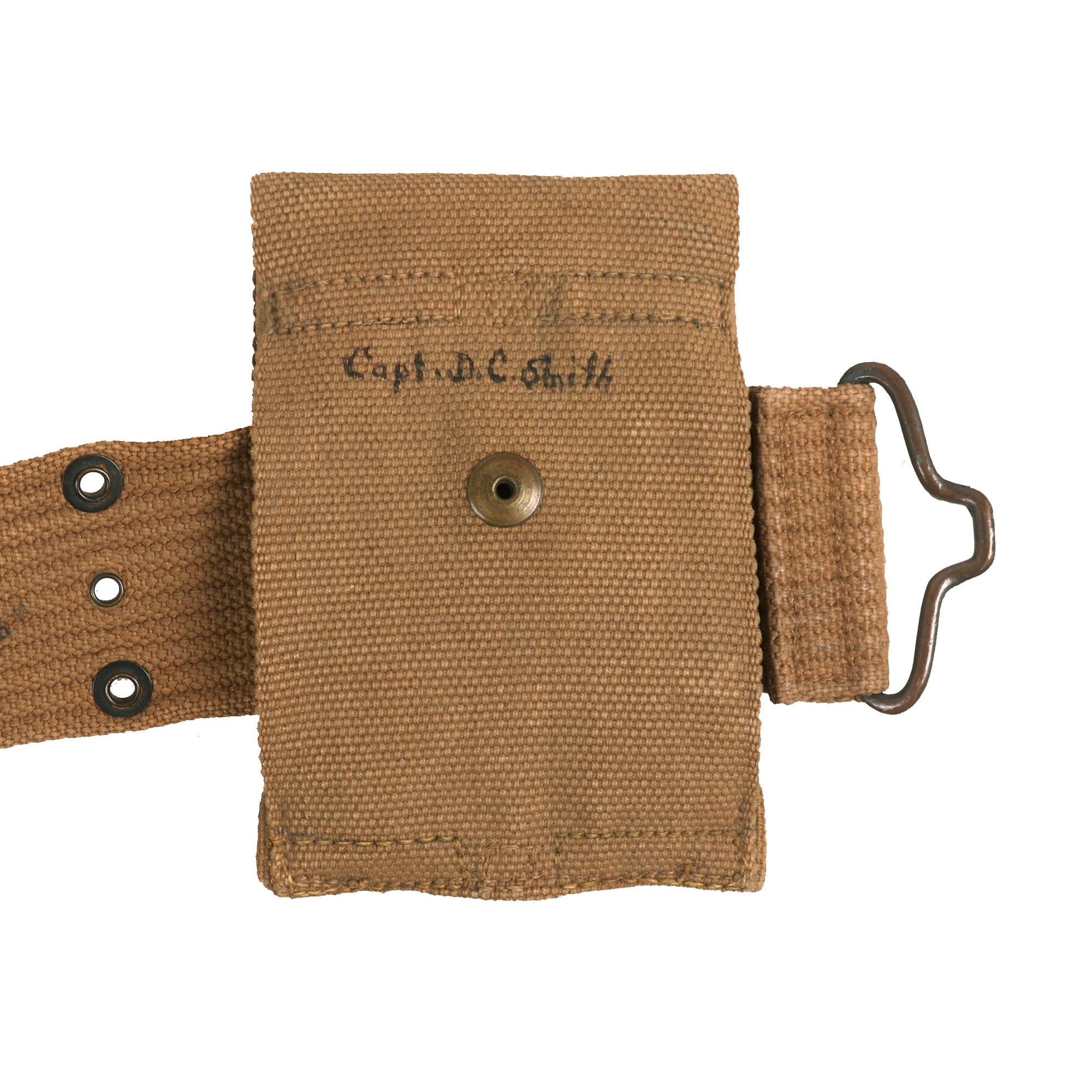 Original Item. Only One Available. This tremendous pistol belt rig is named to Captain Dudley C. Smith, Commander of Company F, 815th Pioneer Infantry Regiment. The rig includes the M1910 Pistol Belt, M1911 Magazine Pouch with two original two-tone magazines, and a first aid bandage pouch with an original December 1917 contract bandage.