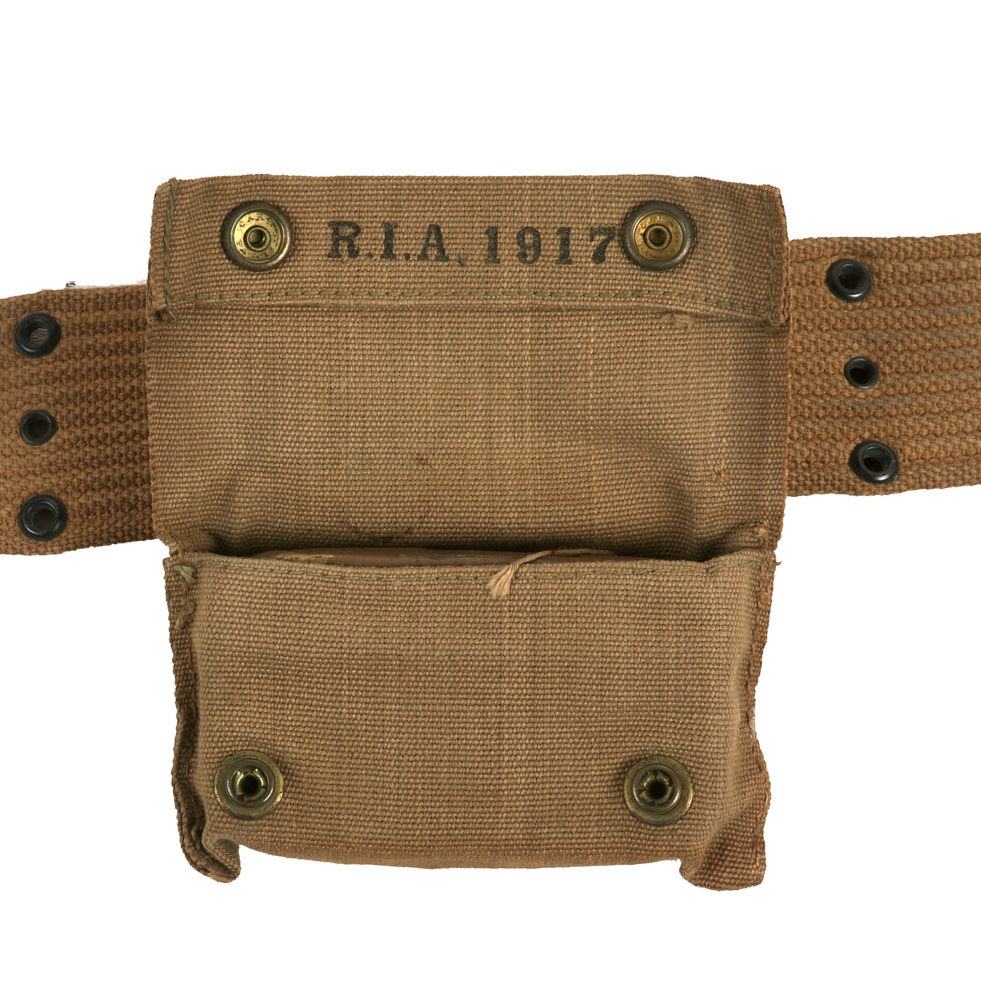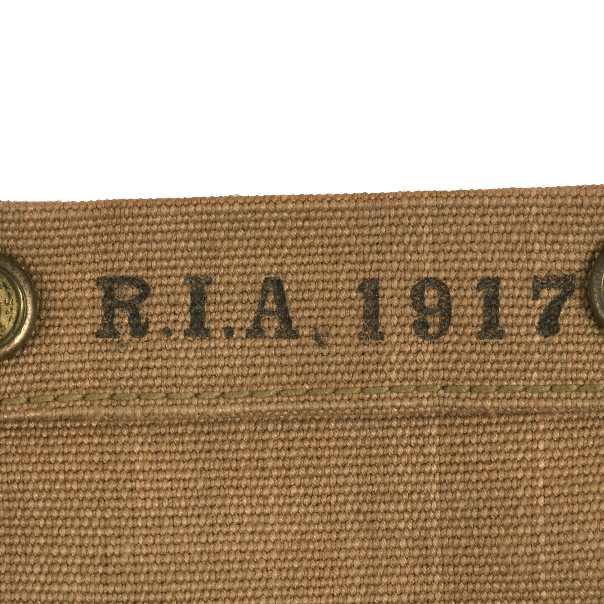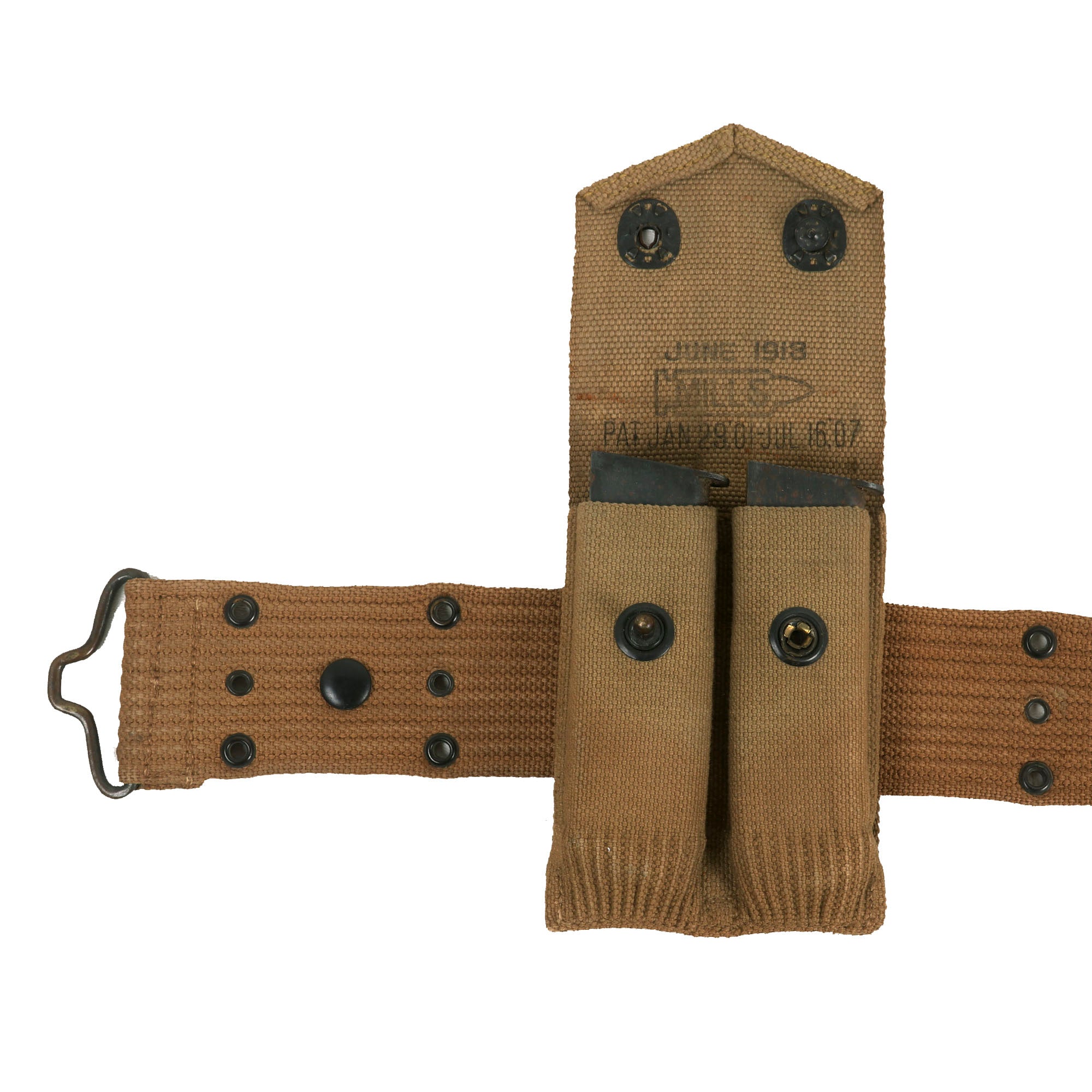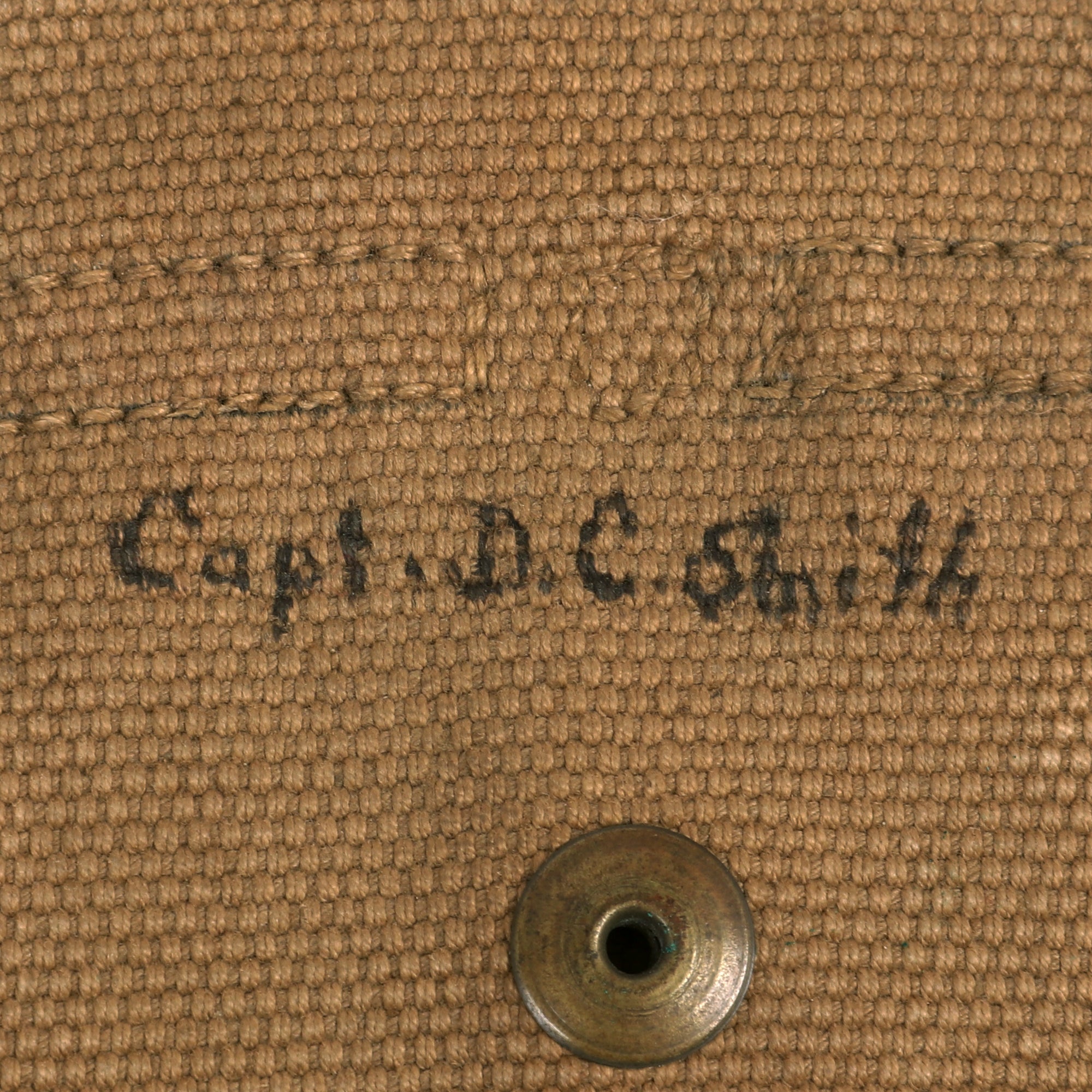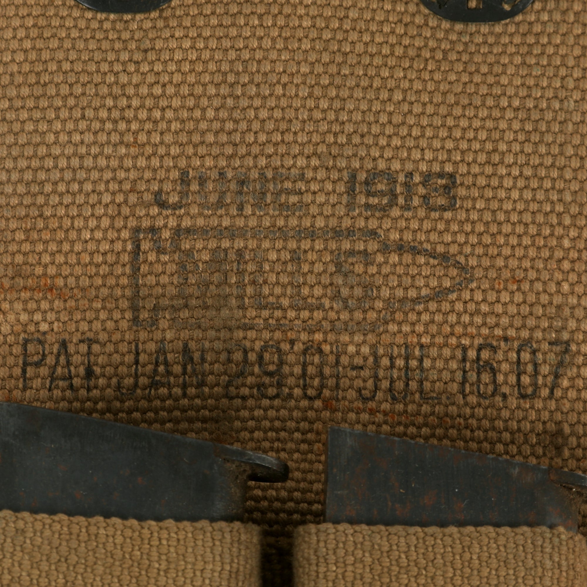 All three canvas pieces are marked CAPT. D. C. SMITH. After some research, the only Captain on the A.E.F. transportation rosters that matched the initials was Dudley C. Smith. The M1911 pouch is a Mills example, dated June 1918. One of the snaps has unfortunately broken off, but is still stuck in the enclosure, so it displays exactly the same. The two-tone magazines are WWI production and are in great shape. The bandage pouch is marked RIA 1917. The bandage is in great unopened condition, and has a contract date of December 10th, 1917. The set is in fantastic condition overall, with very few flaws.