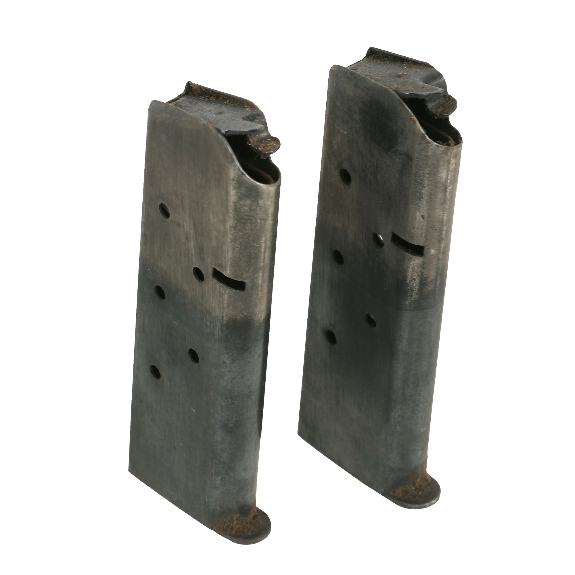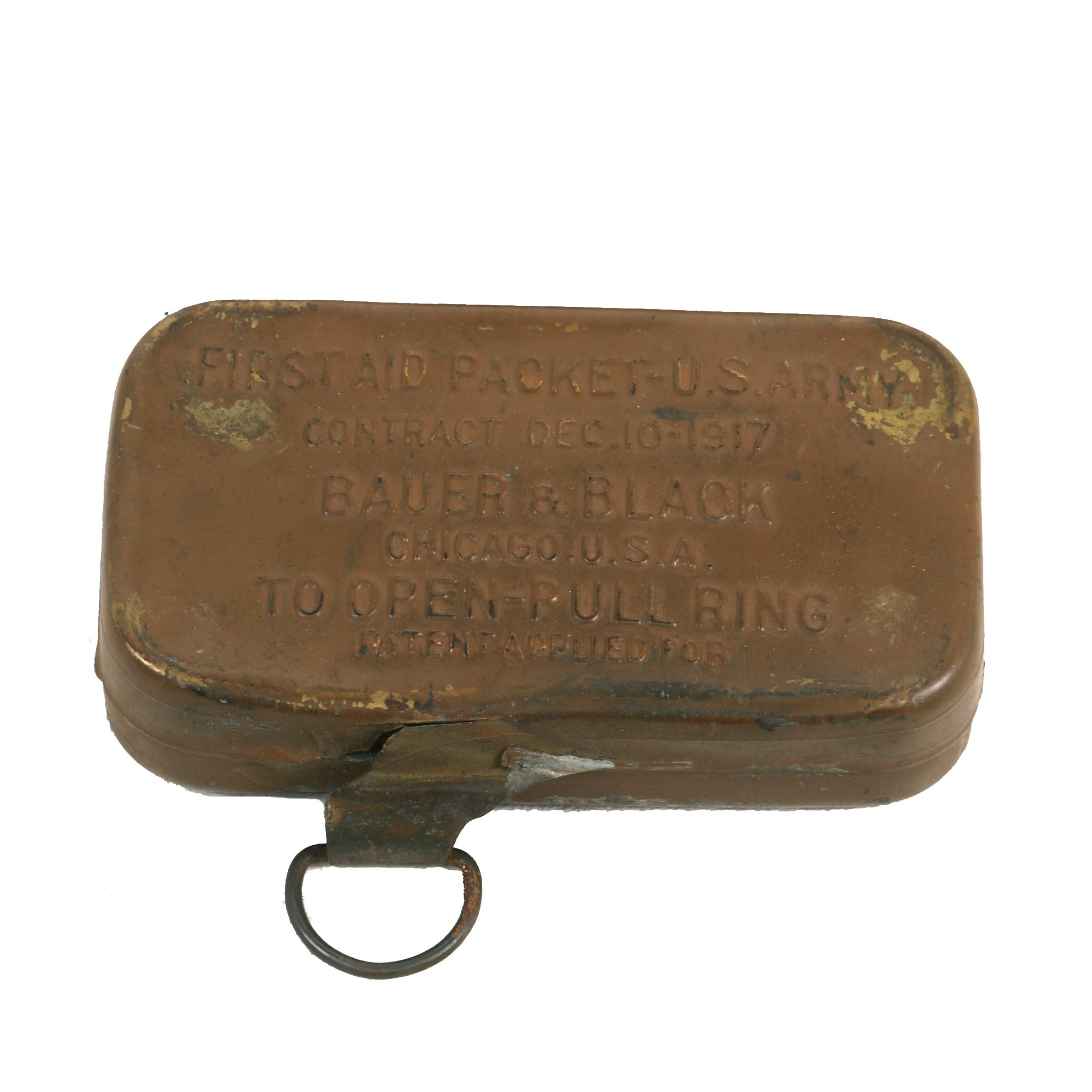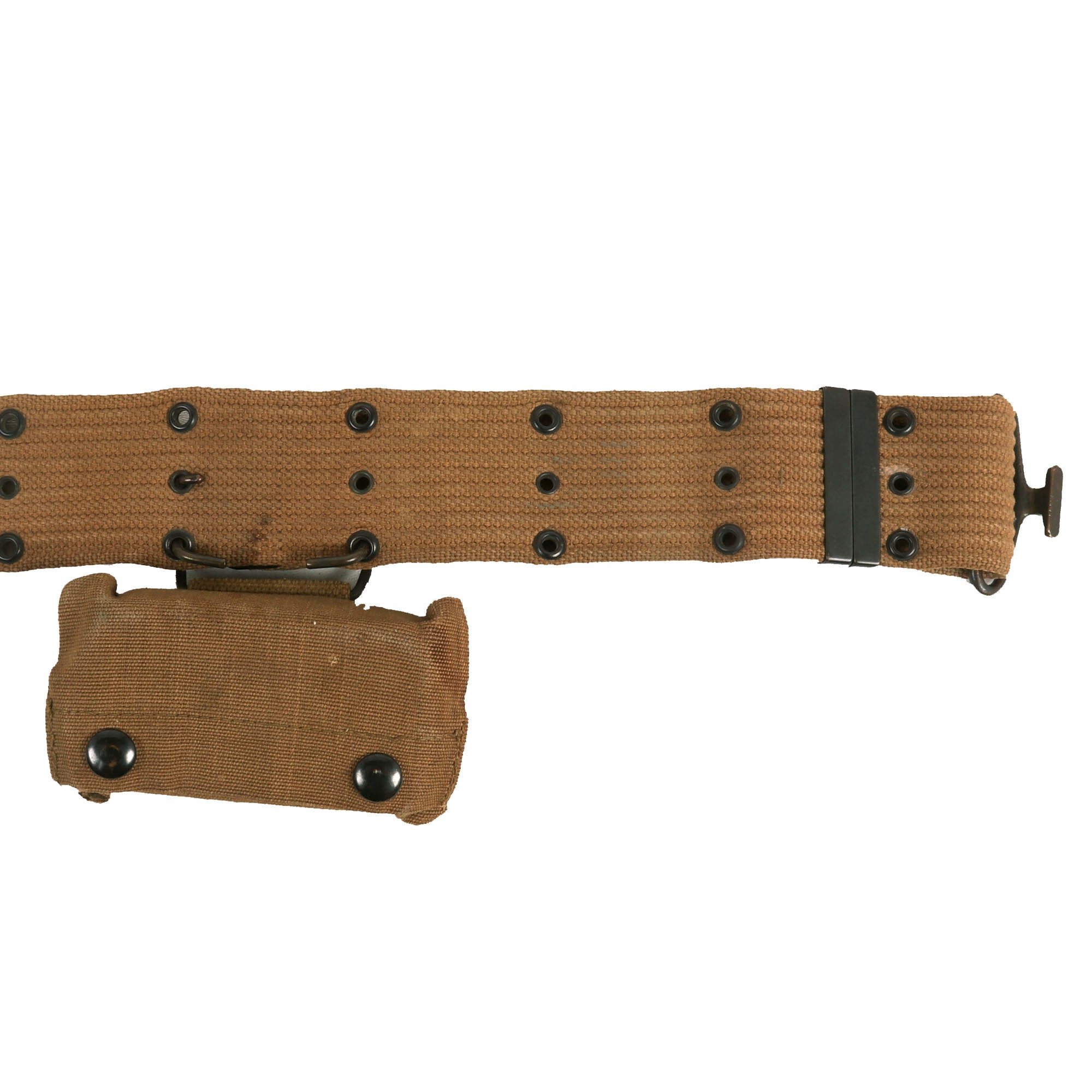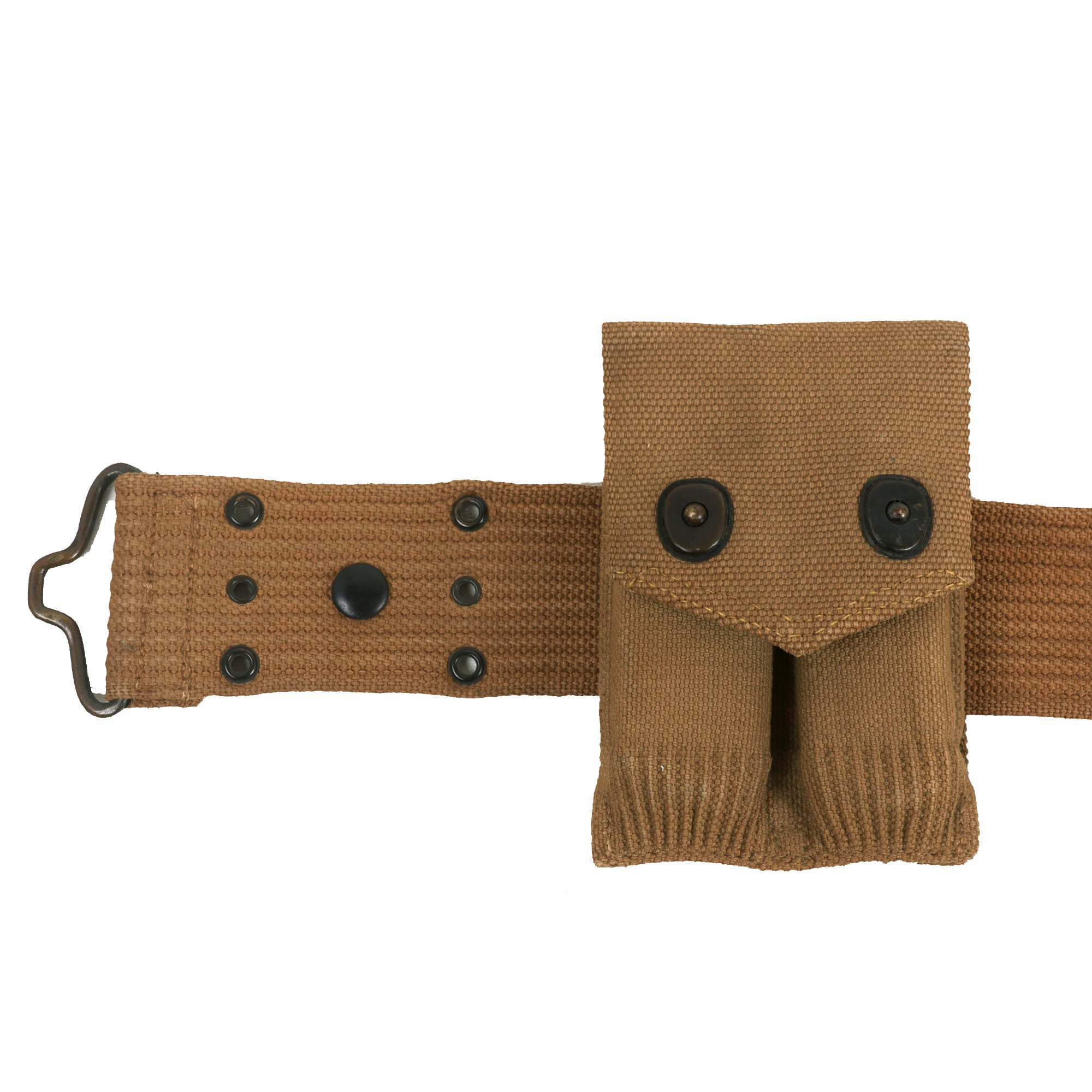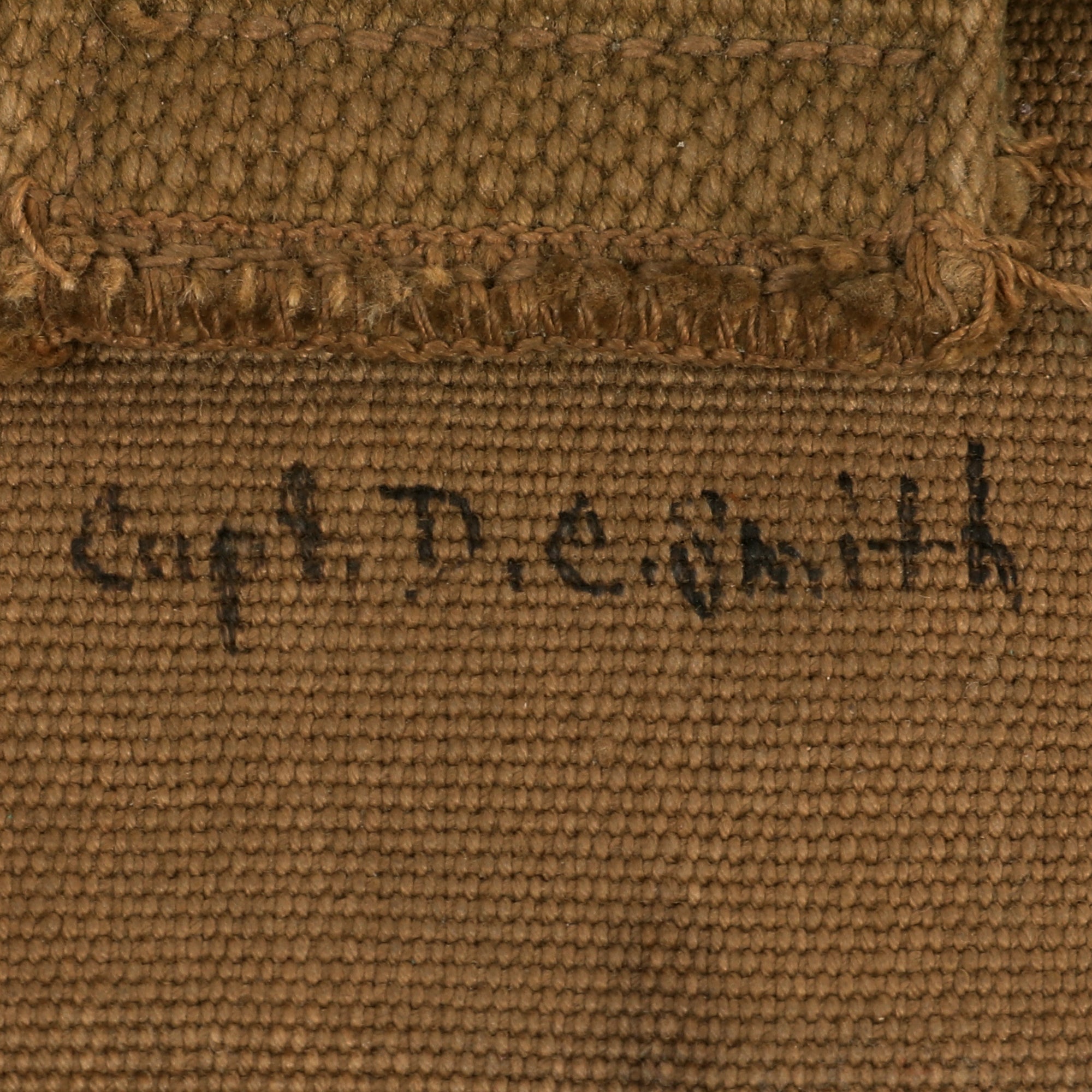 All three canvas pieces are marked CAPT. D. C. SMITH. After some research, the only Captain on the A.E.F. transportation rosters that matched the initials was Dudley C. Smith. The M1911 pouch is a Mills example, dated June 1918. One of the snaps has unfortunately broken off, but is still stuck in the enclosure, so it displays exactly the same. The two-tone magazines are WWI production and are in great shape. The bandage pouch is marked RIA 1917. The bandage is in great unopened condition, and has a contract date of December 10th, 1917. The set is in fantastic condition overall, with very few flaws.