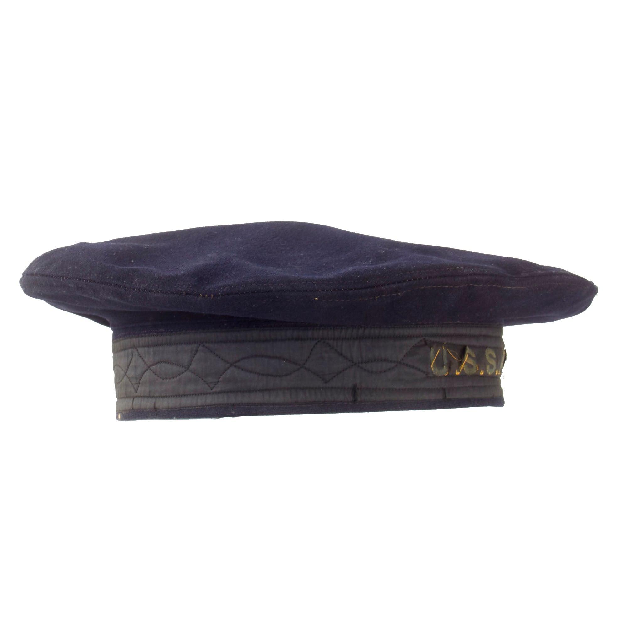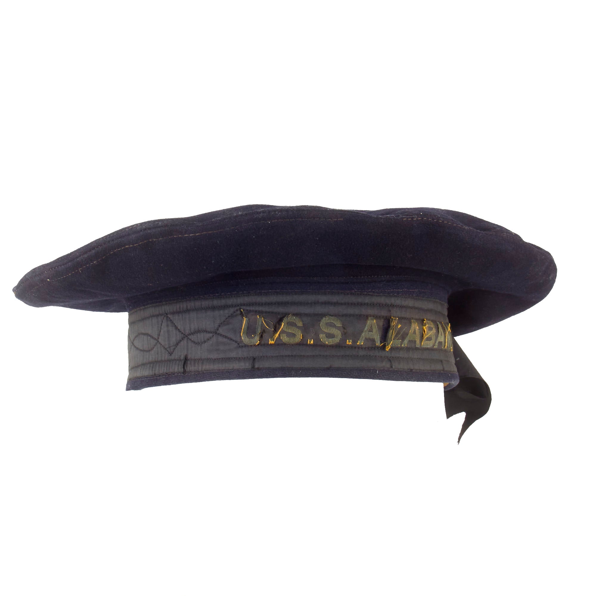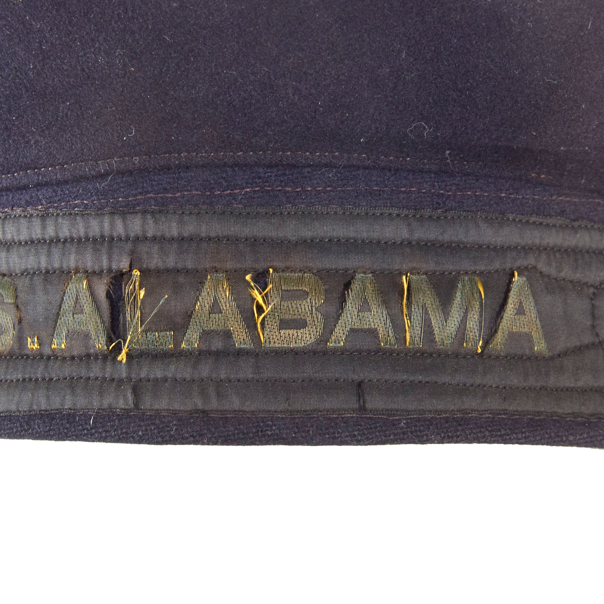 This is an interesting flat hat for the USS Alabama, but this example is missing the stiffener, if it ever had one at all. This example looks like it was a custom-made example with lovely designs on the cap talley and in the stitching. The interior has a nice pattern but there is heavy wear to the lettering of the cap talley, with some fraying as shown.