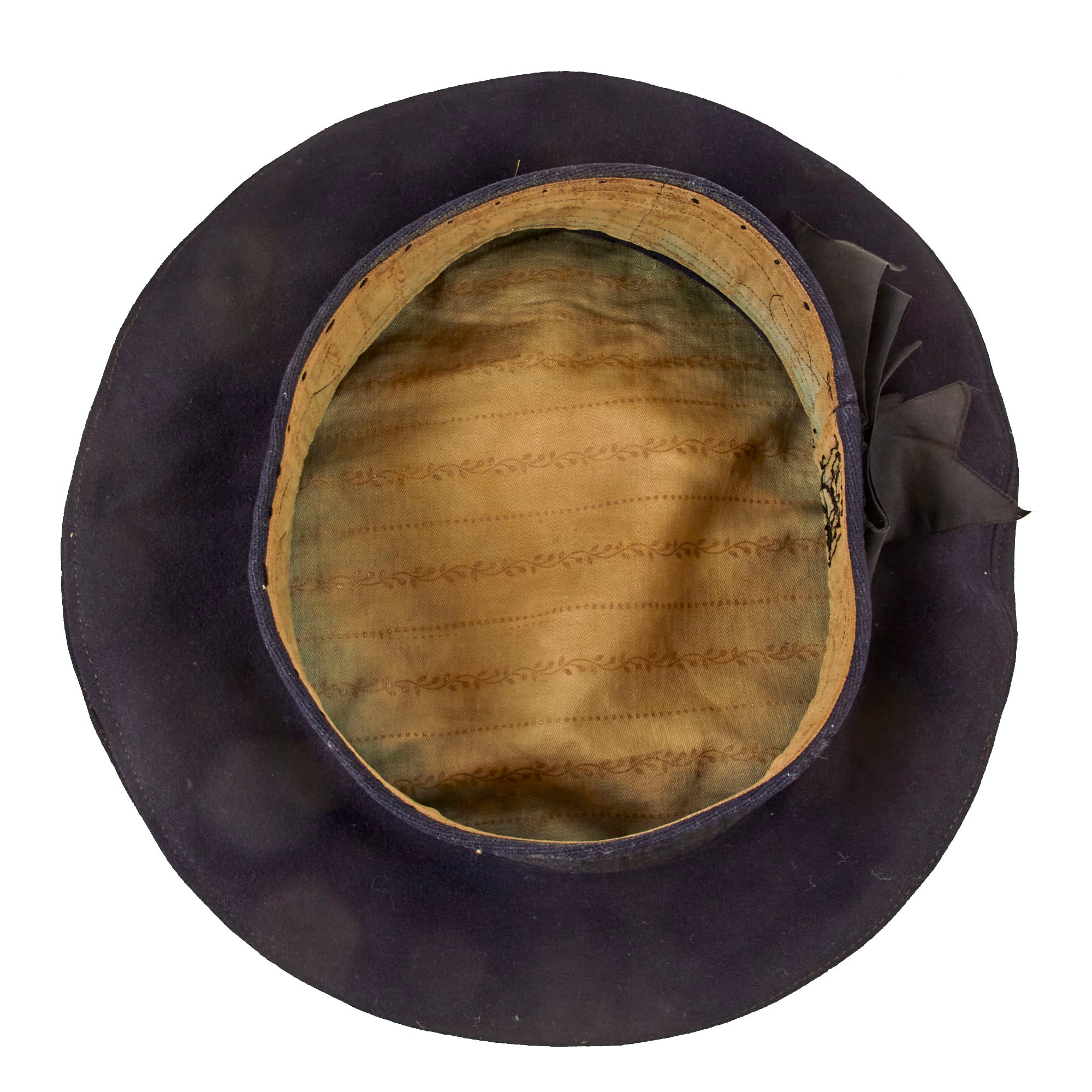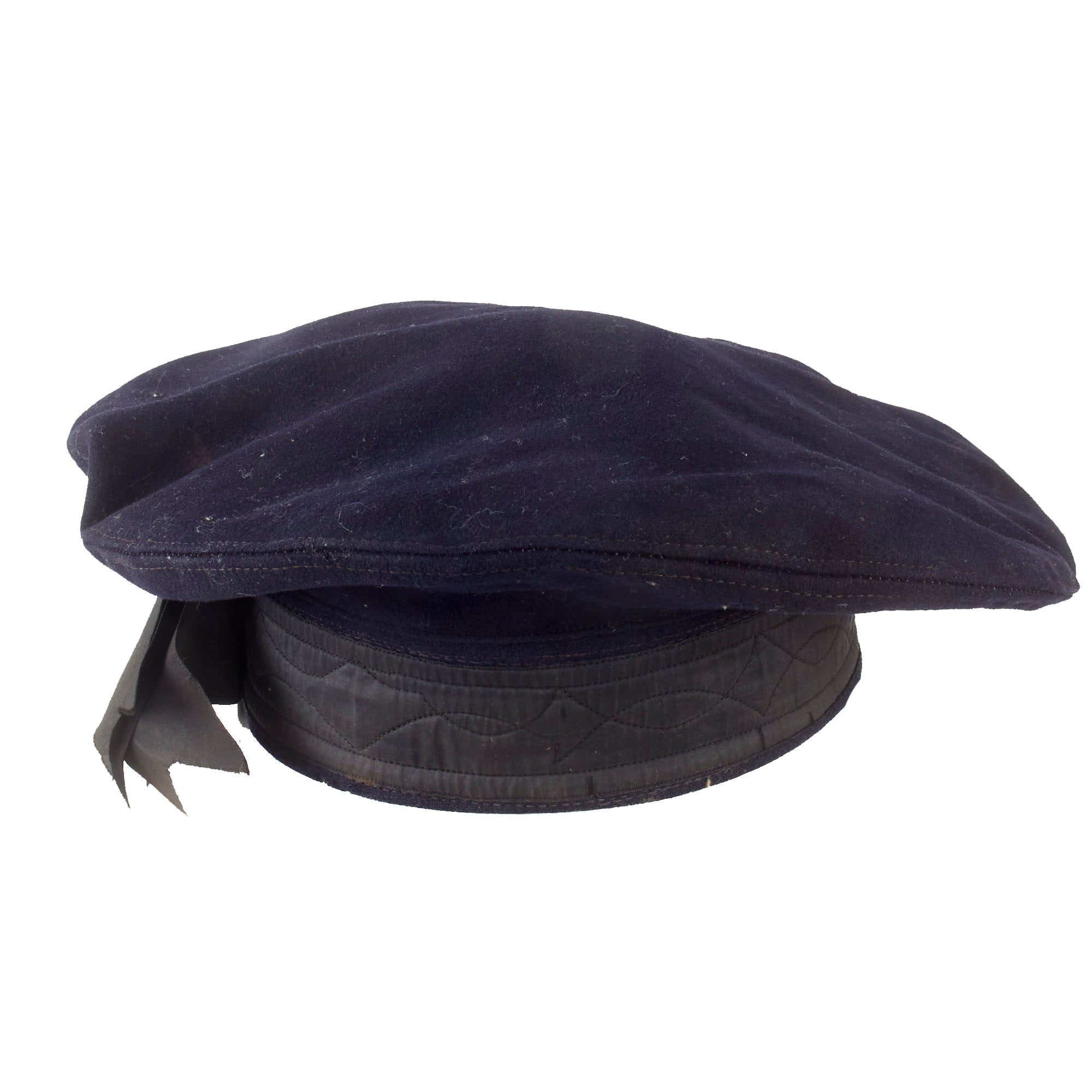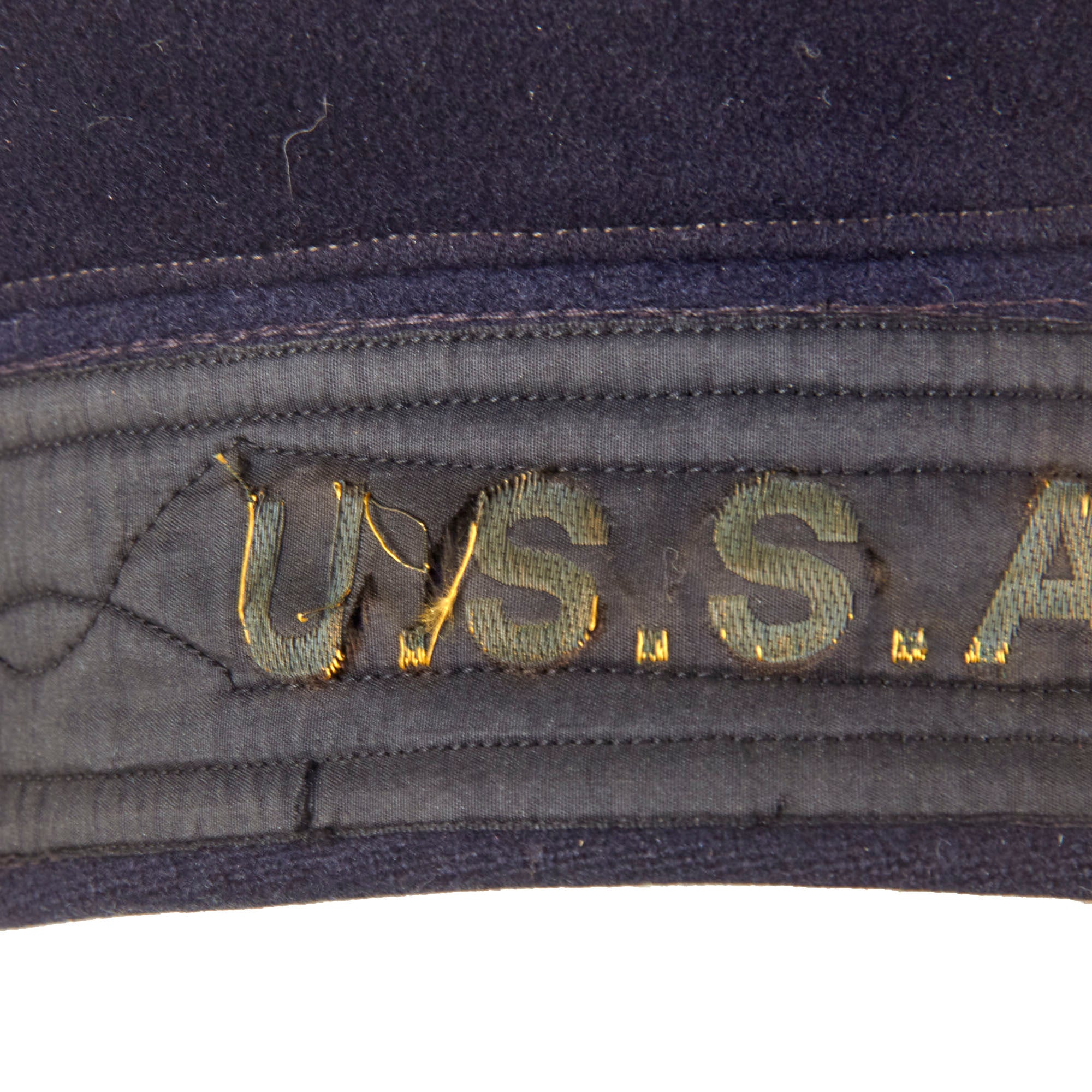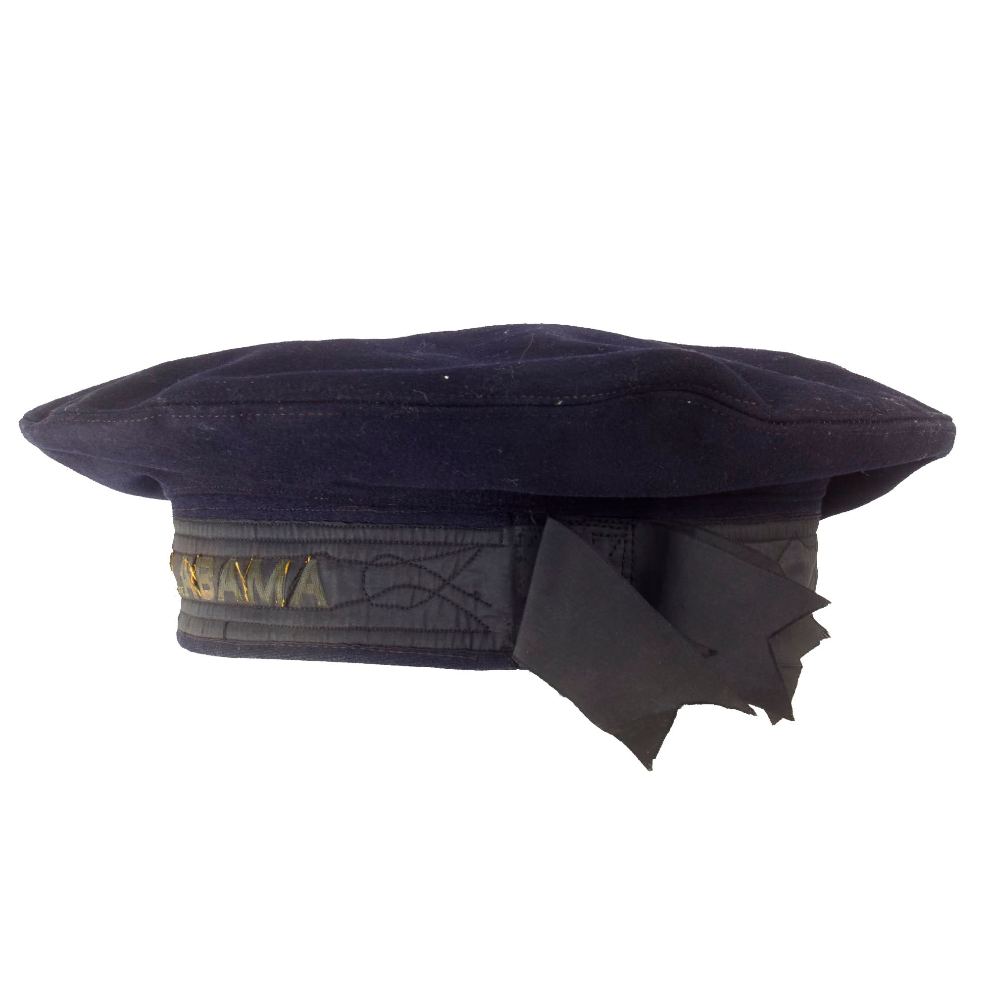 This is an interesting flat hat for the USS Alabama, but this example is missing the stiffener, if it ever had one at all. This example looks like it was a custom-made example with lovely designs on the cap talley and in the stitching. The interior has a nice pattern but there is heavy wear to the lettering of the cap talley, with some fraying as shown.