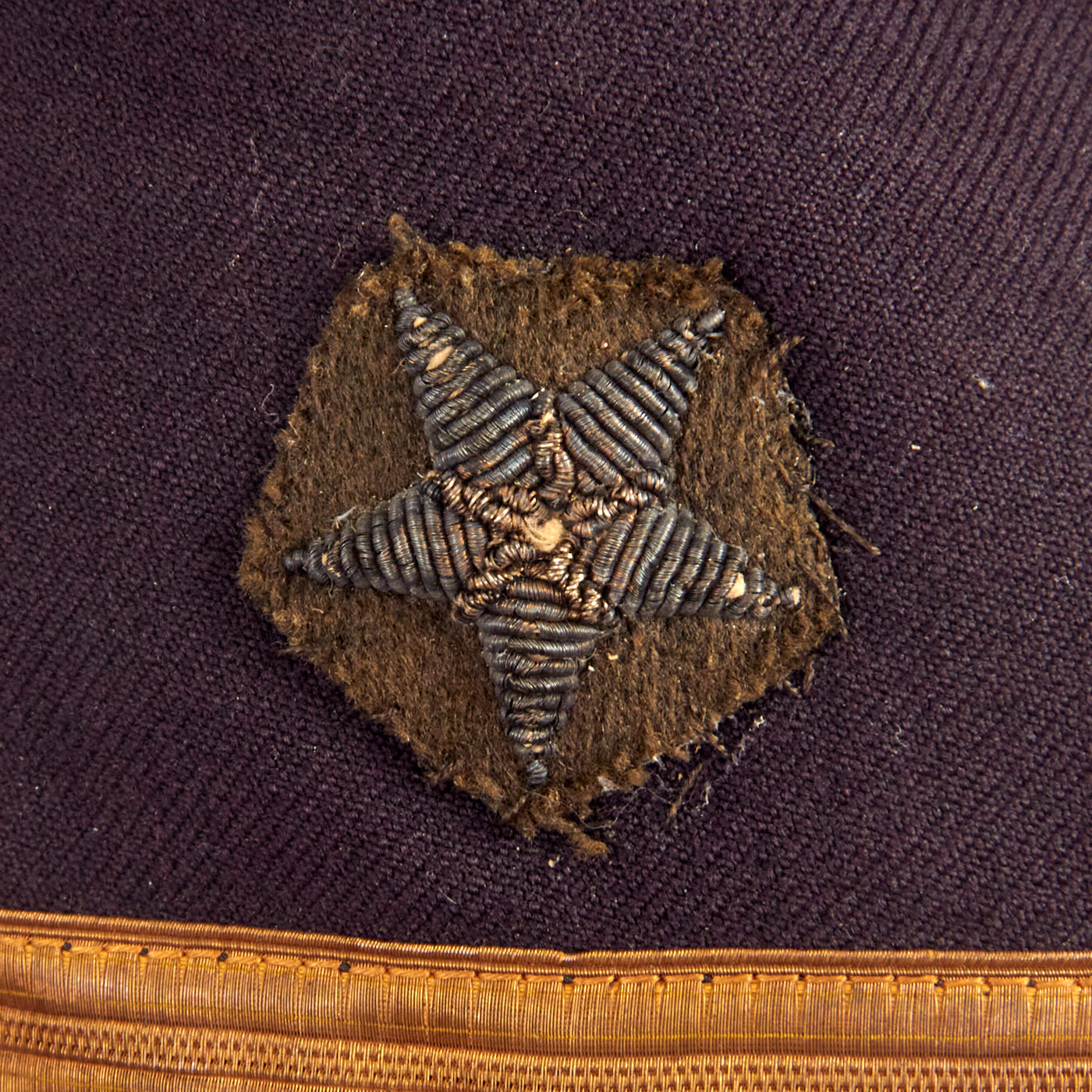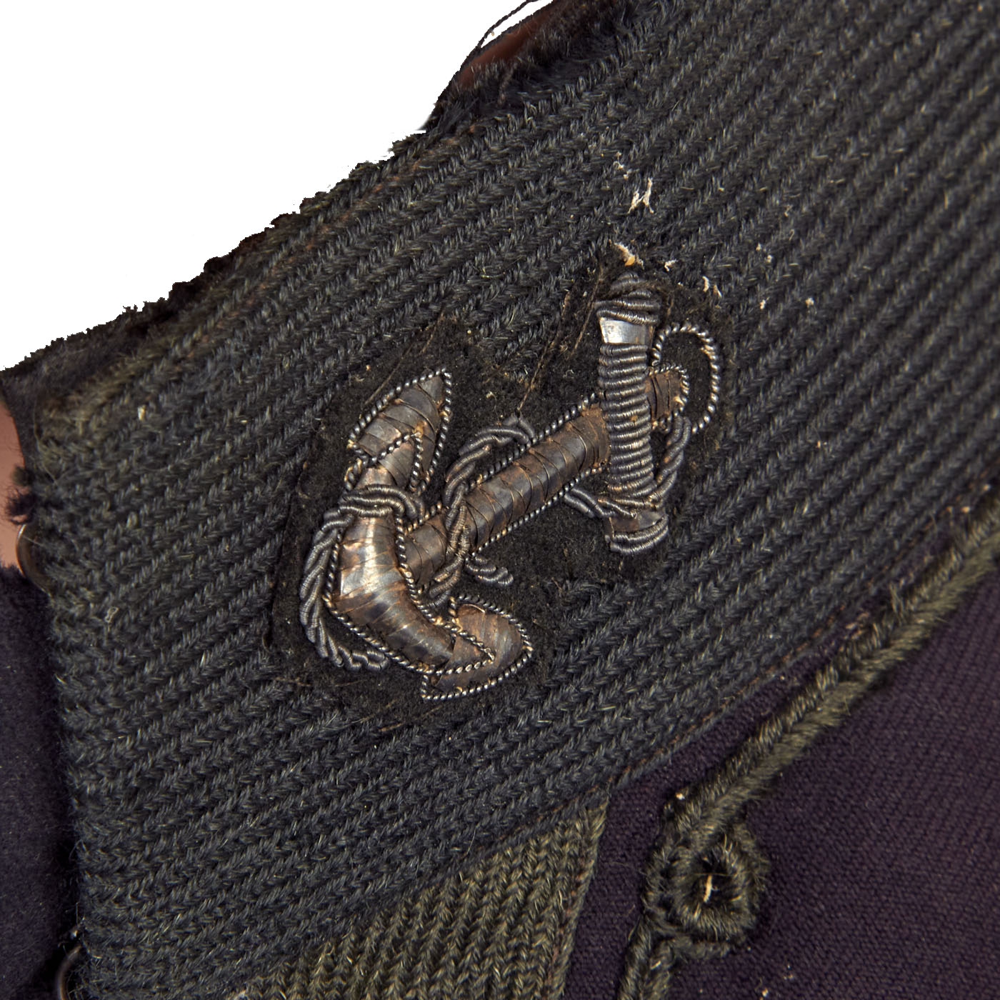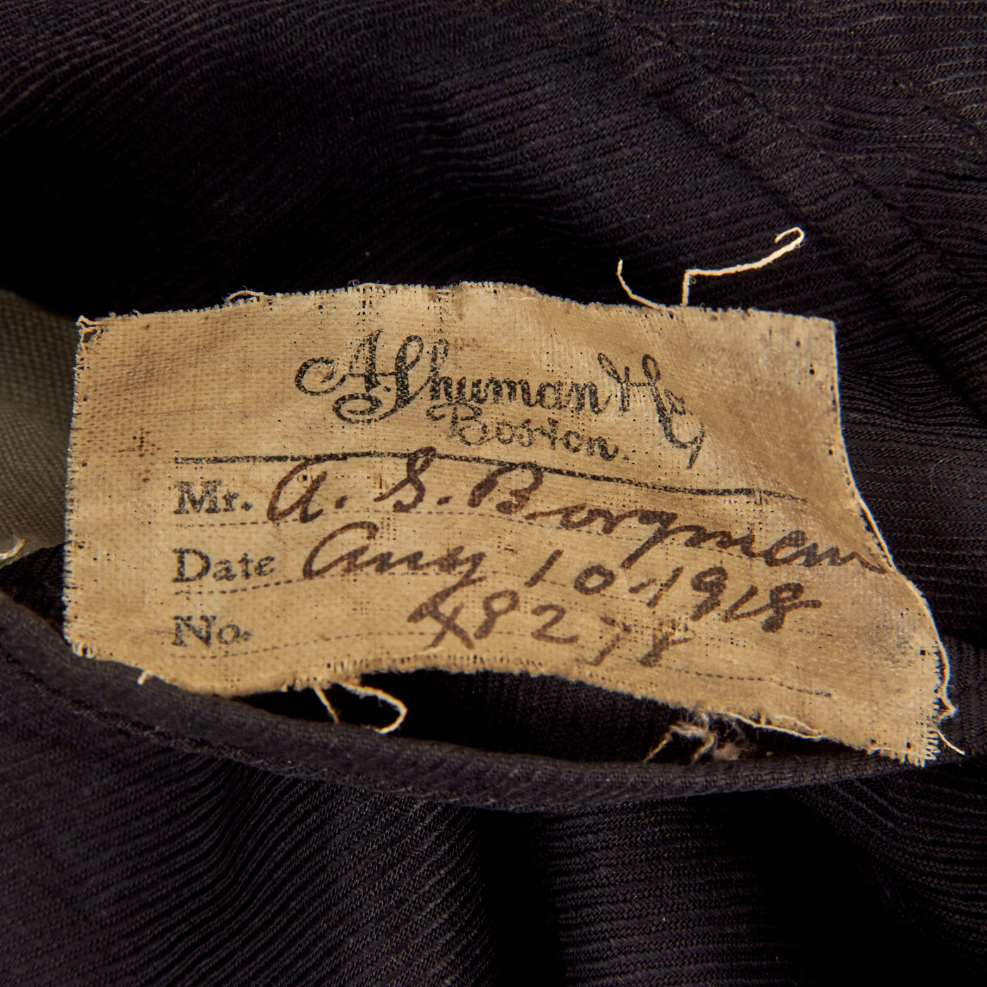 This uniform is a fine tailor made M-1895 / M-1912 Undress Blouse Jacket. Constructed of blue wool with gilt ribbon cuff bands, full lining with all buttons present, bullion embroidered fouled anchors on each side. The left side features a beautiful bullion Naval Aviator’s insignia. All gold/silver bullion is unfortunately tarnished, but does not subtract from the beauty of the tunic. Overall condition is good but there are moth nips present throughout the uniform. The tailor tag located on the inside right pocket is literally “held on by a thread” and has the name Mr A. S. Bergman written on it. Below the name is the date of August 10, 1918.