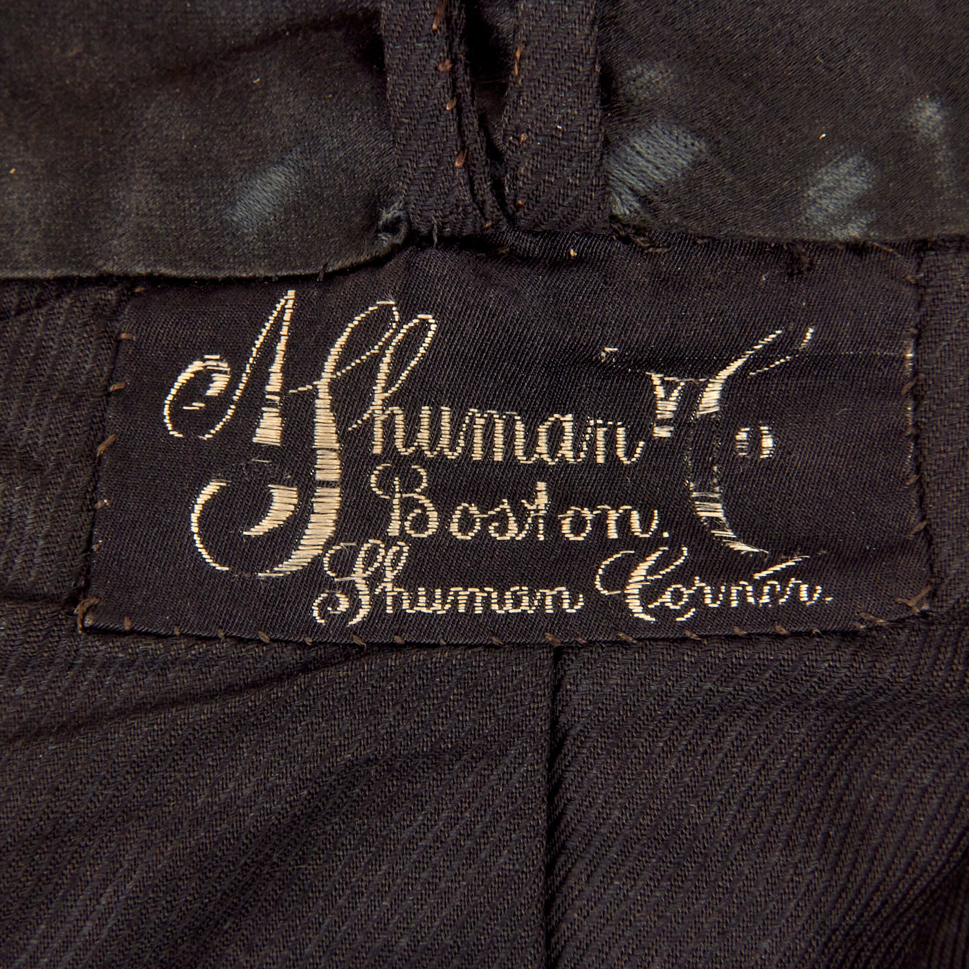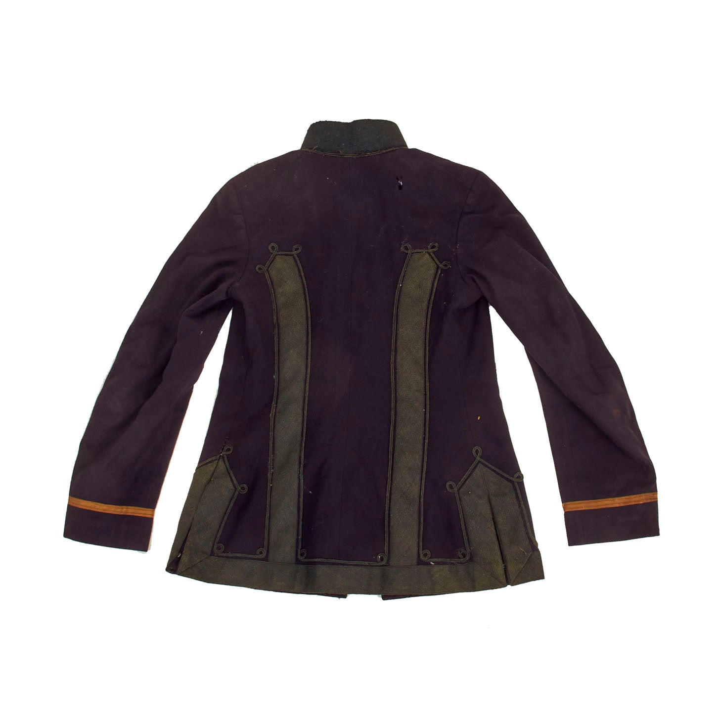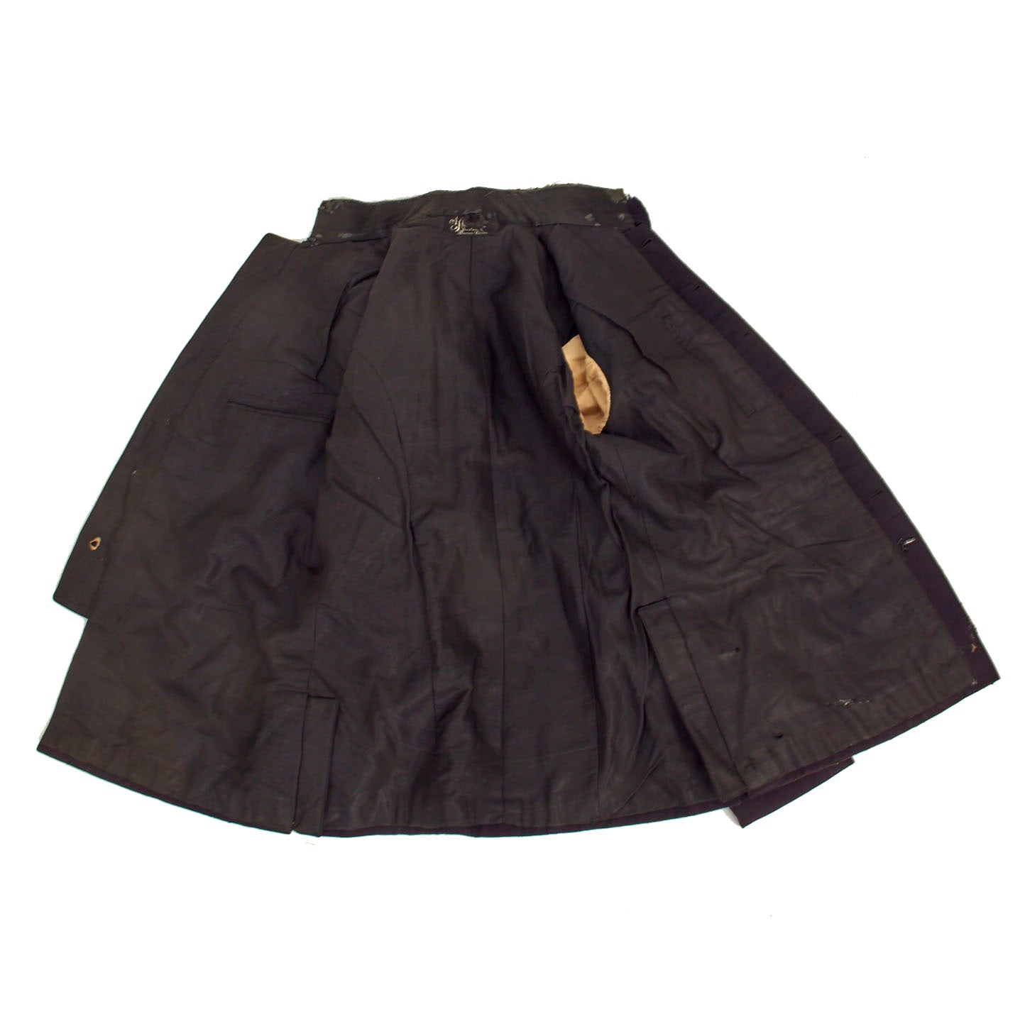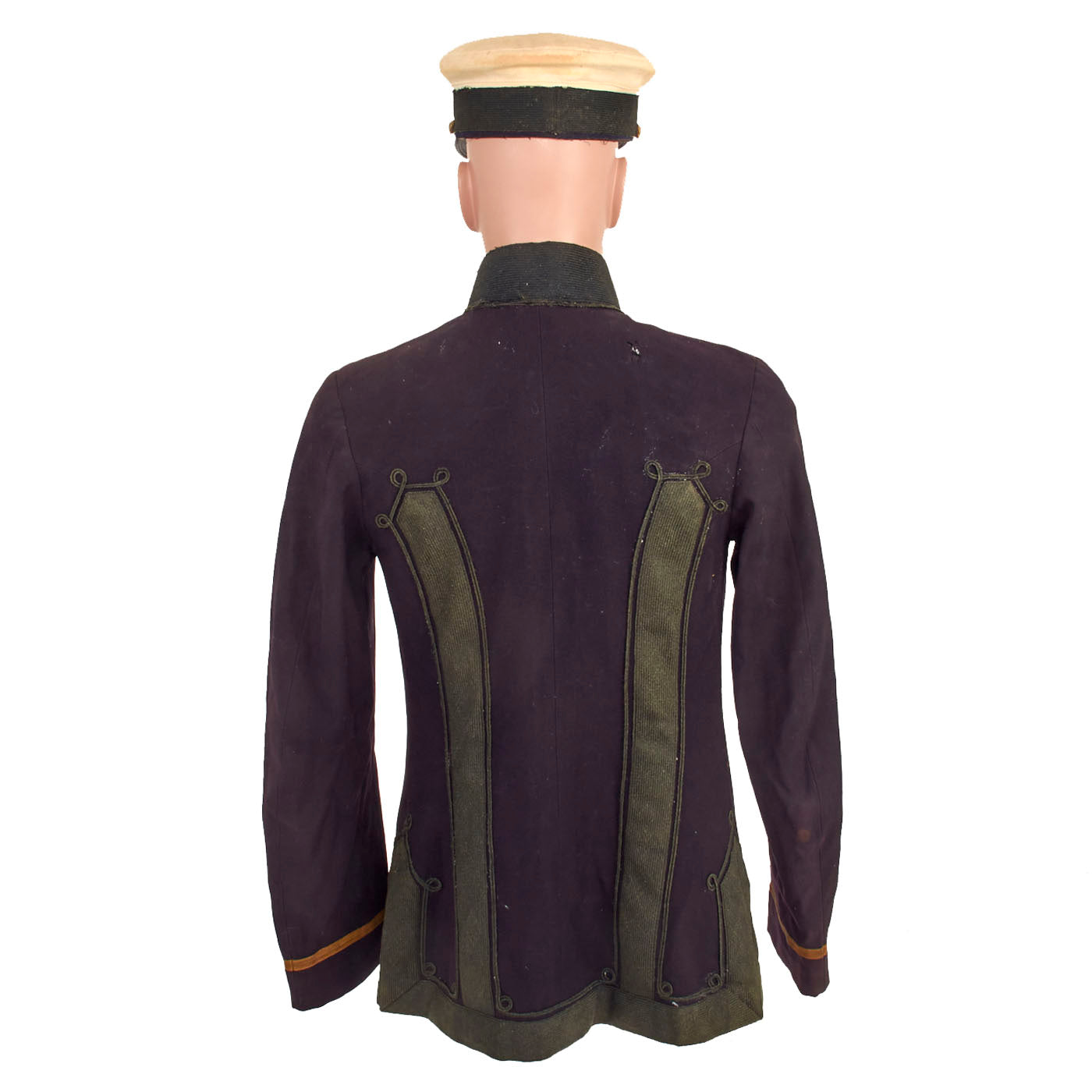 This uniform is a fine tailor made M-1895 / M-1912 Undress Blouse Jacket. Constructed of blue wool with gilt ribbon cuff bands, full lining with all buttons present, bullion embroidered fouled anchors on each side. The left side features a beautiful bullion Naval Aviator’s insignia. All gold/silver bullion is unfortunately tarnished, but does not subtract from the beauty of the tunic. Overall condition is good but there are moth nips present throughout the uniform. The tailor tag located on the inside right pocket is literally “held on by a thread” and has the name Mr A. S. Bergman written on it. Below the name is the date of August 10, 1918.