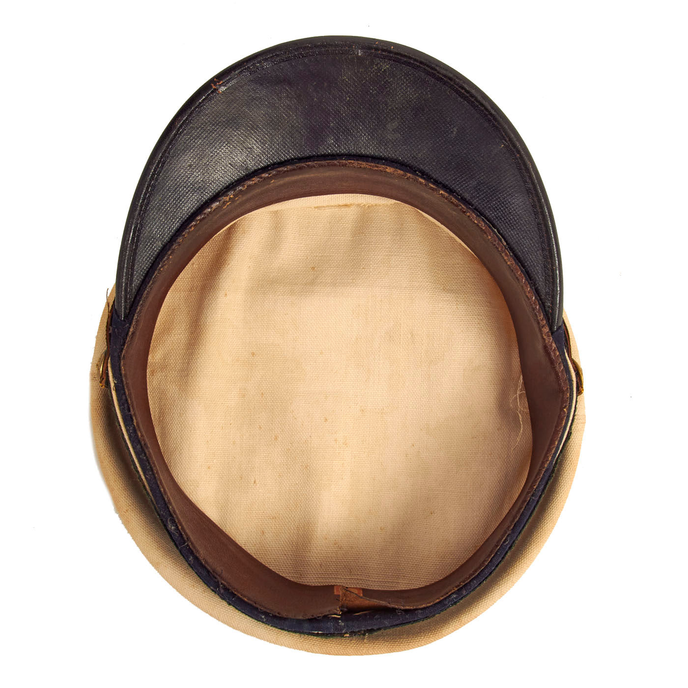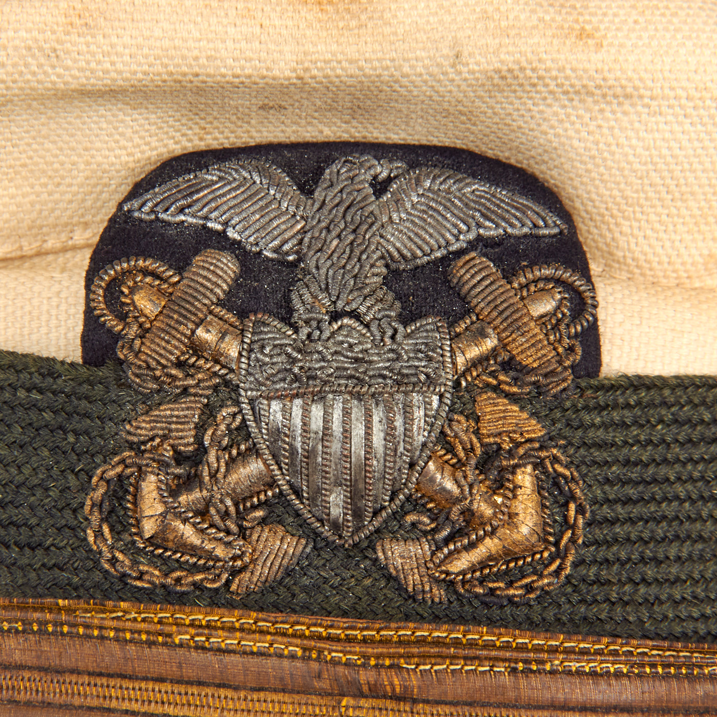 The “summer white” forage cap is in a lovely, yet worn condition and shows signs of service use. The front of the cap bears the correct Navy crossed anchor insignia, with a gold bullion adjustable chinstrap and two U.S. Navy side buttons. The insignia and chinstrap are faded and darkened to a nice patina. There are stains present on the white area of the cap, but it does not subtract from the beauty. The interior has no marking we can find and the leather sweatband is partially detached.