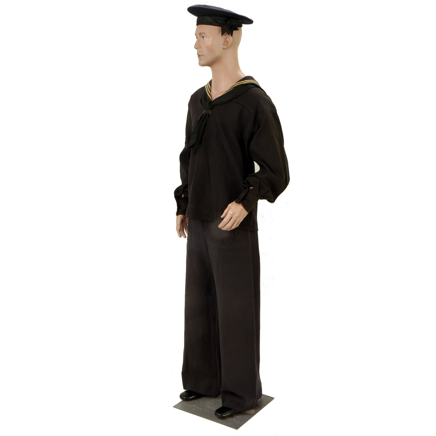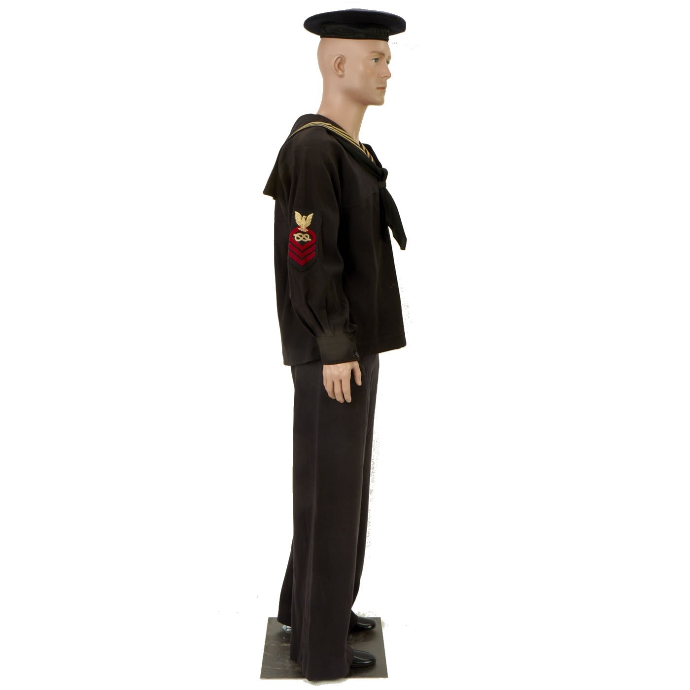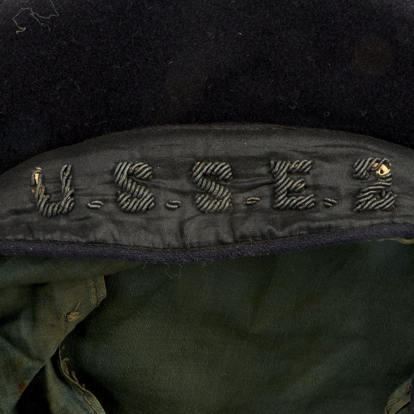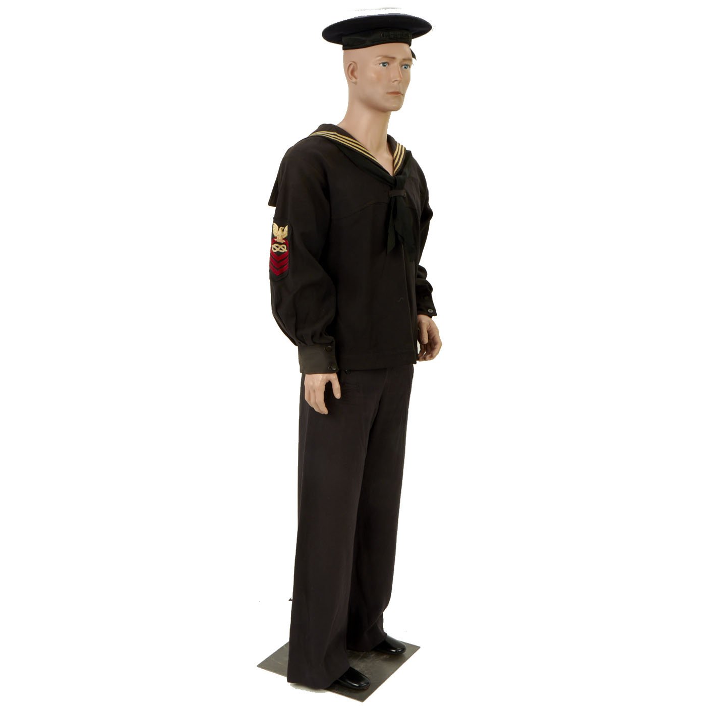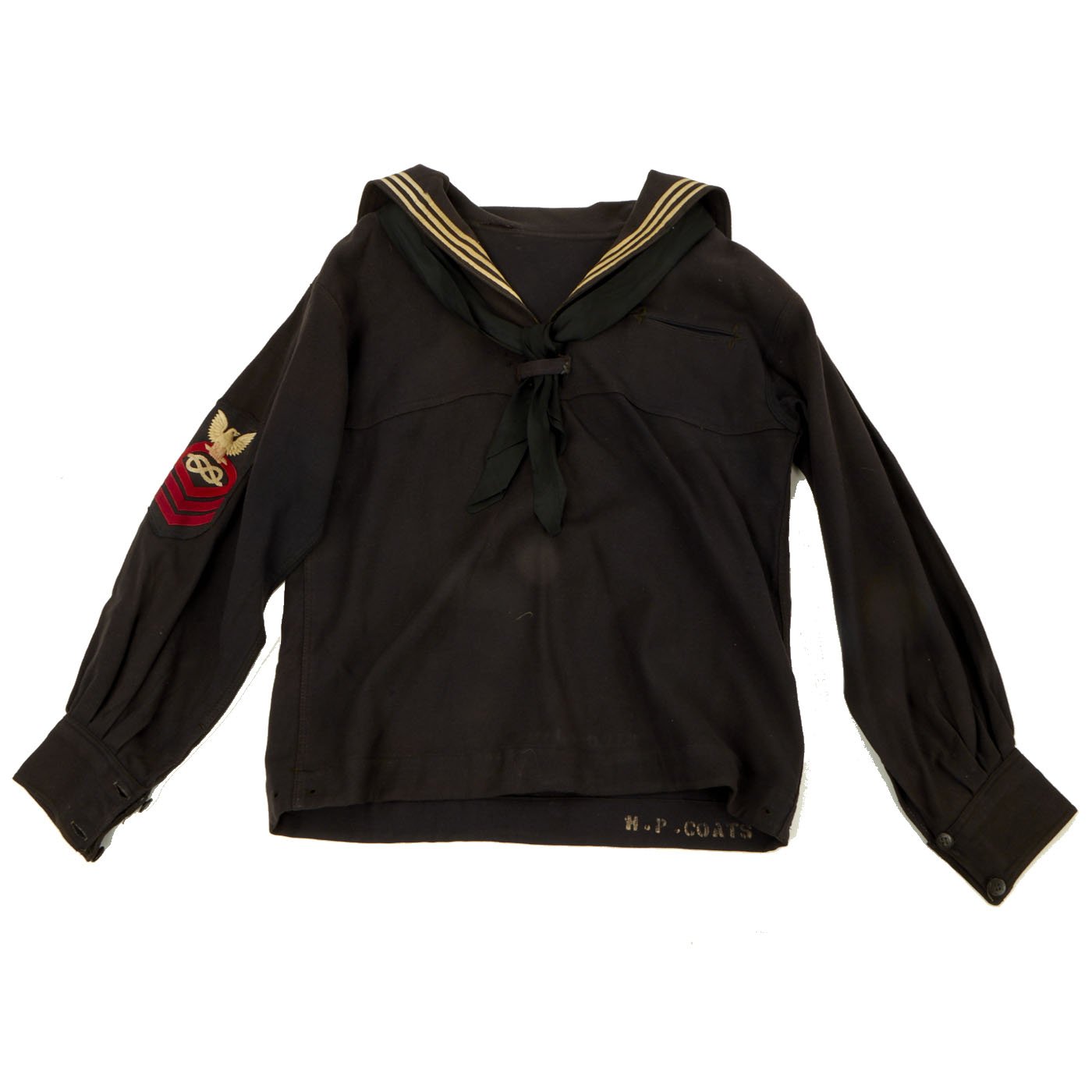 Original Item: Only One Available. Incredibly rare WWI U.S. Navy Submarine Crewman’s Uniform from the U.S.S. E-2, an early U.S. Navy Submarine commissioned in 1912. The U.S.S. E-2 did see action during WWI, performing numerous war patrols seeking German submarines. Artifacts associated with submarine warfare from WWI are incredibly hard to find, as full on submarine warfare was in its near-infancy at that time. This set consists of a Jumper with a Petty Officer Rating (Named to “H.P. Coats”), a pair of matching trousers, silk neckerchief (stenciled with name “Bray A.A.”), and the best piece of the lot, a silk-lined Navy Flat hat with a custom bullion embroidered U.S.S. E-2 Cap Tally. Cap is about a size 6 ⅞. Jumper is roughly a size 36, and trousers about a size 32.
