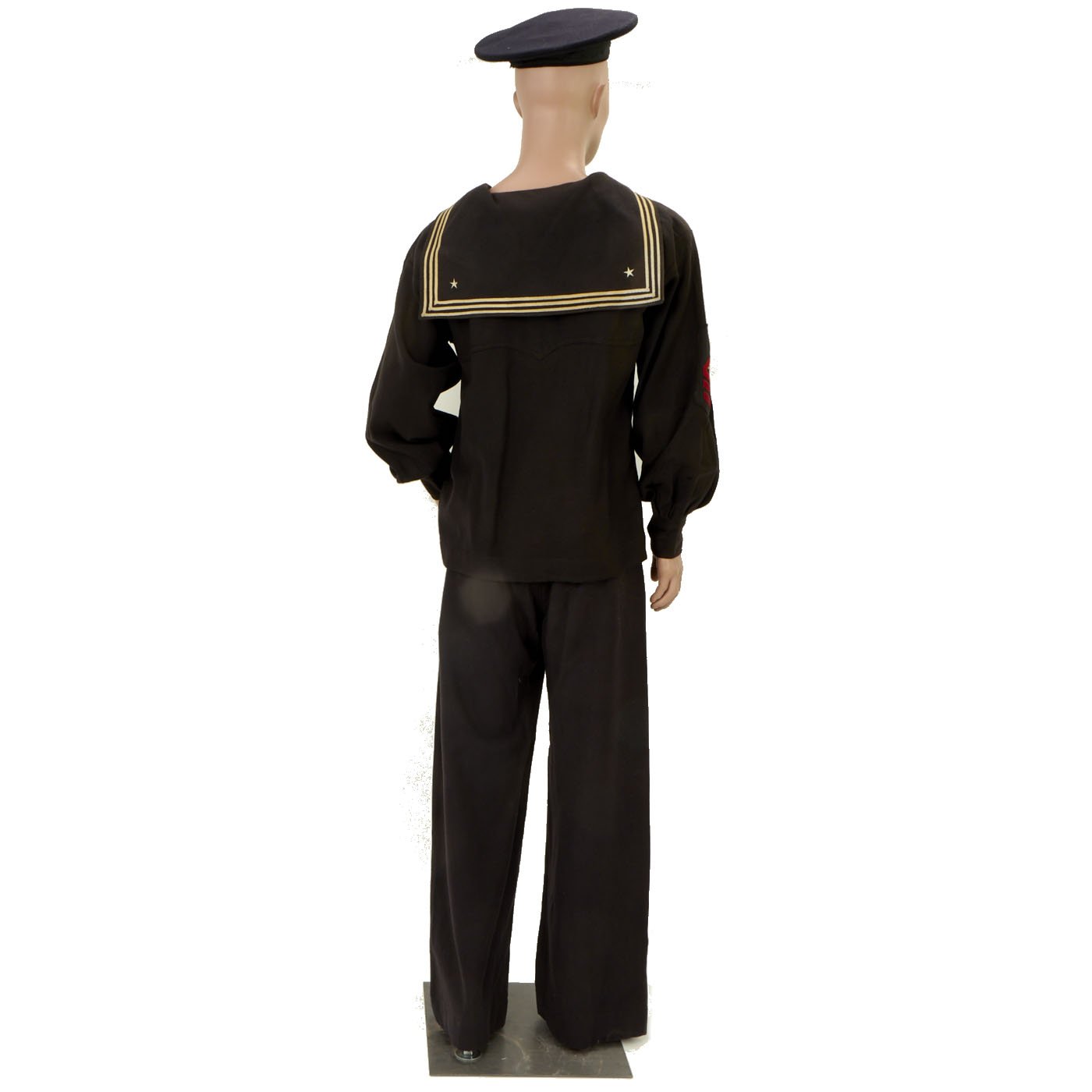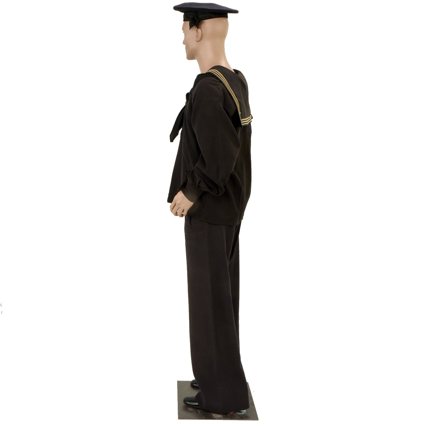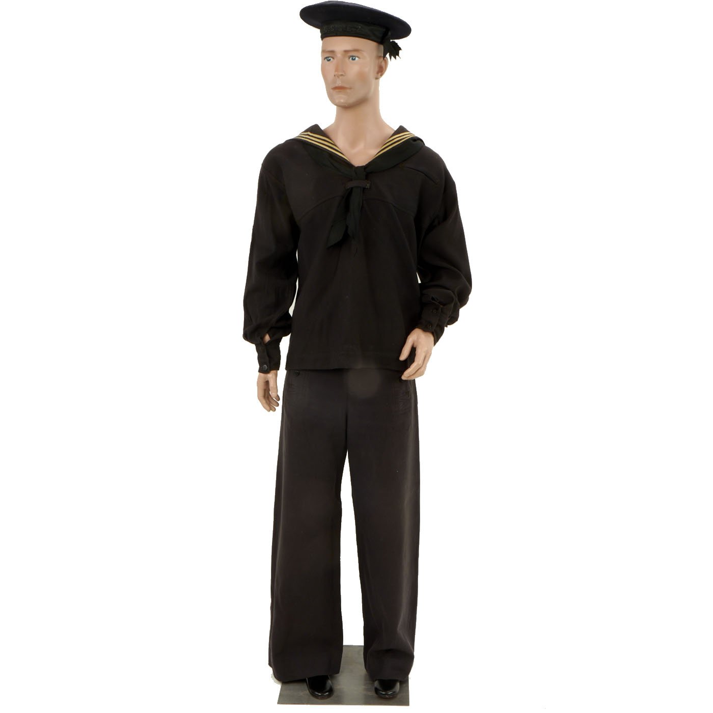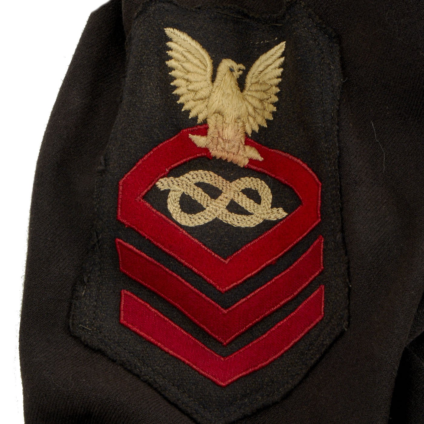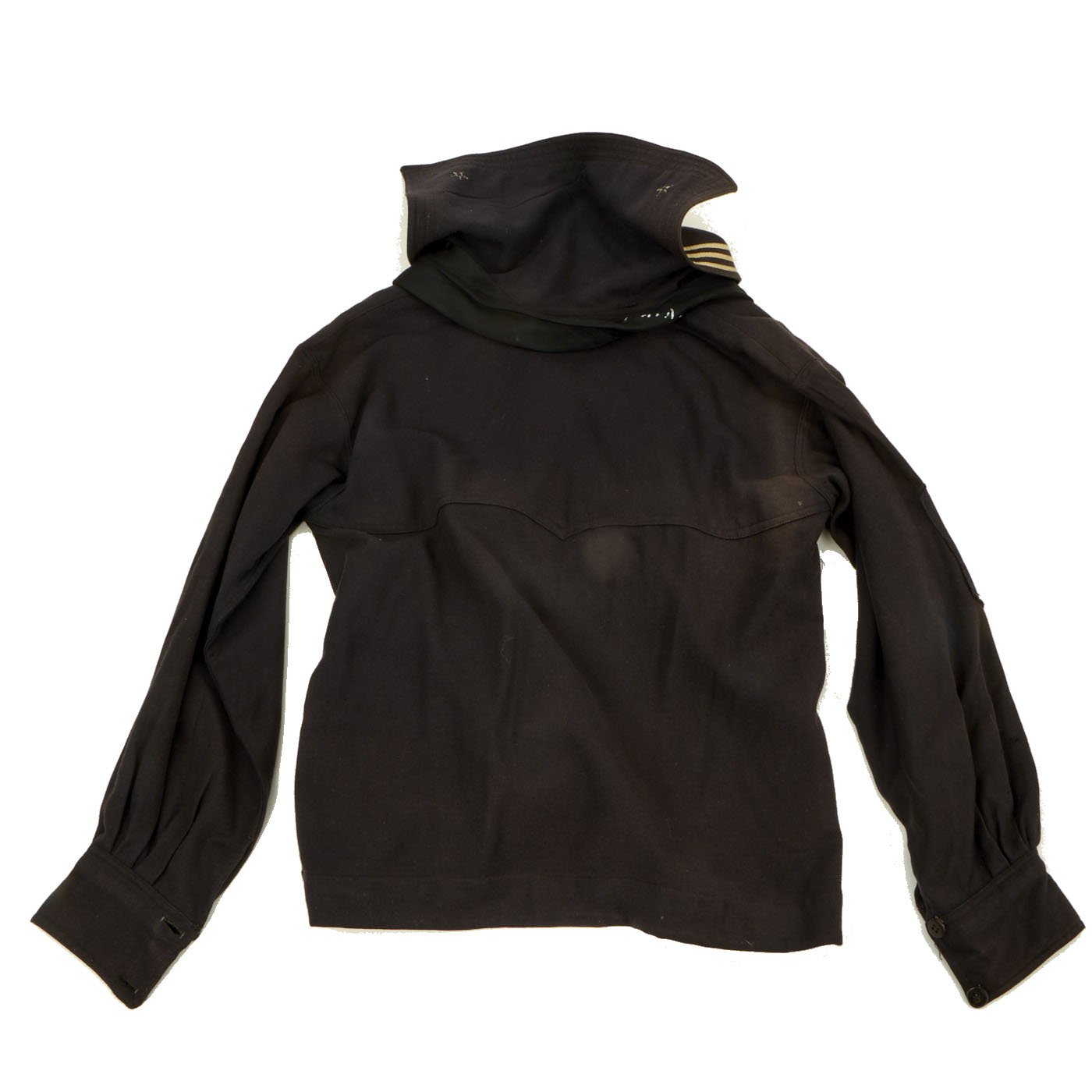 Original Item: Only One Available. Incredibly rare WWI U.S. Navy Submarine Crewman’s Uniform from the U.S.S. E-2, an early U.S. Navy Submarine commissioned in 1912. The U.S.S. E-2 did see action during WWI, performing numerous war patrols seeking German submarines. Artifacts associated with submarine warfare from WWI are incredibly hard to find, as full on submarine warfare was in its near-infancy at that time. This set consists of a Jumper with a Petty Officer Rating (Named to “H.P. Coats”), a pair of matching trousers, silk neckerchief (stenciled with name “Bray A.A.”), and the best piece of the lot, a silk-lined Navy Flat hat with a custom bullion embroidered U.S.S. E-2 Cap Tally. Cap is about a size 6 ⅞. Jumper is roughly a size 36, and trousers about a size 32.
