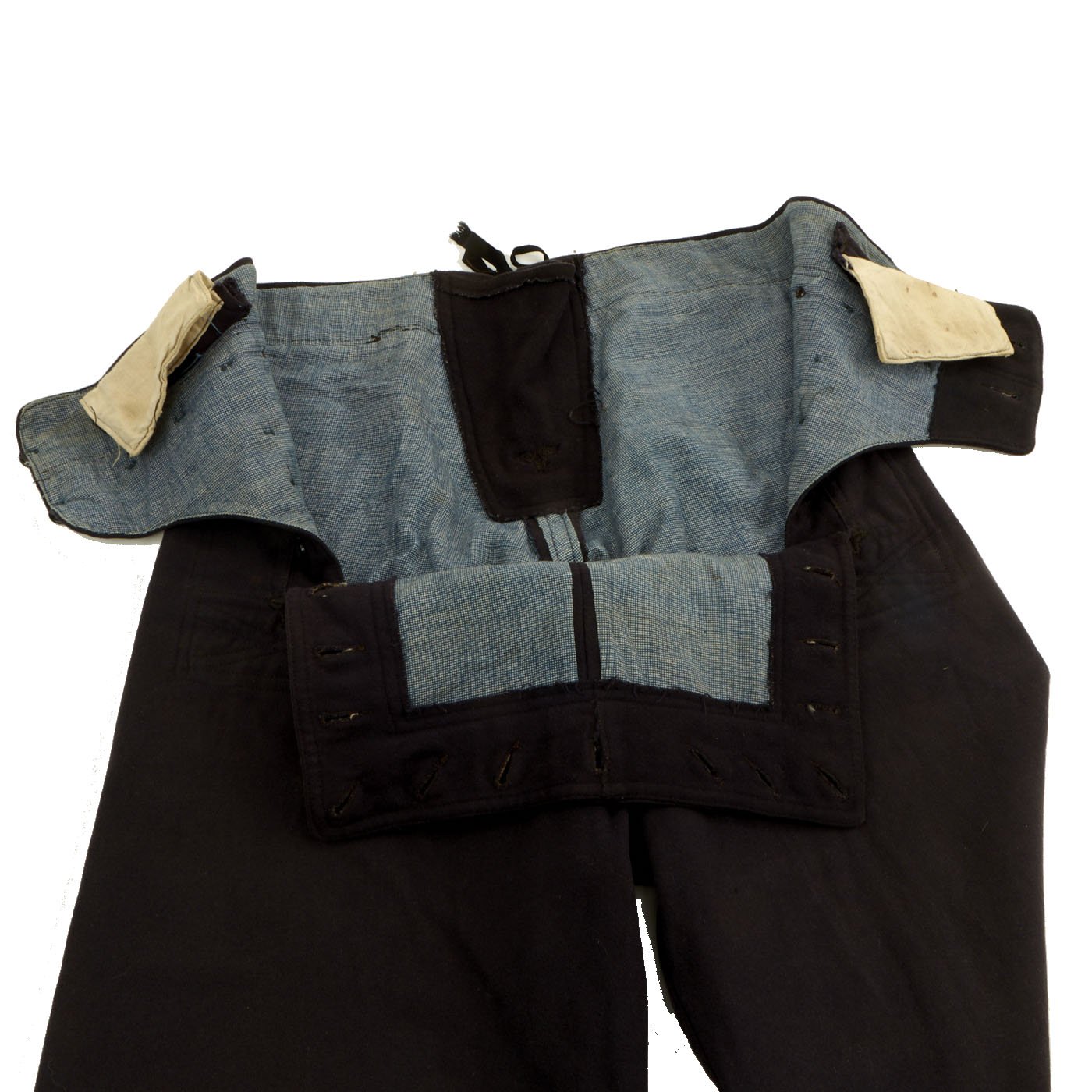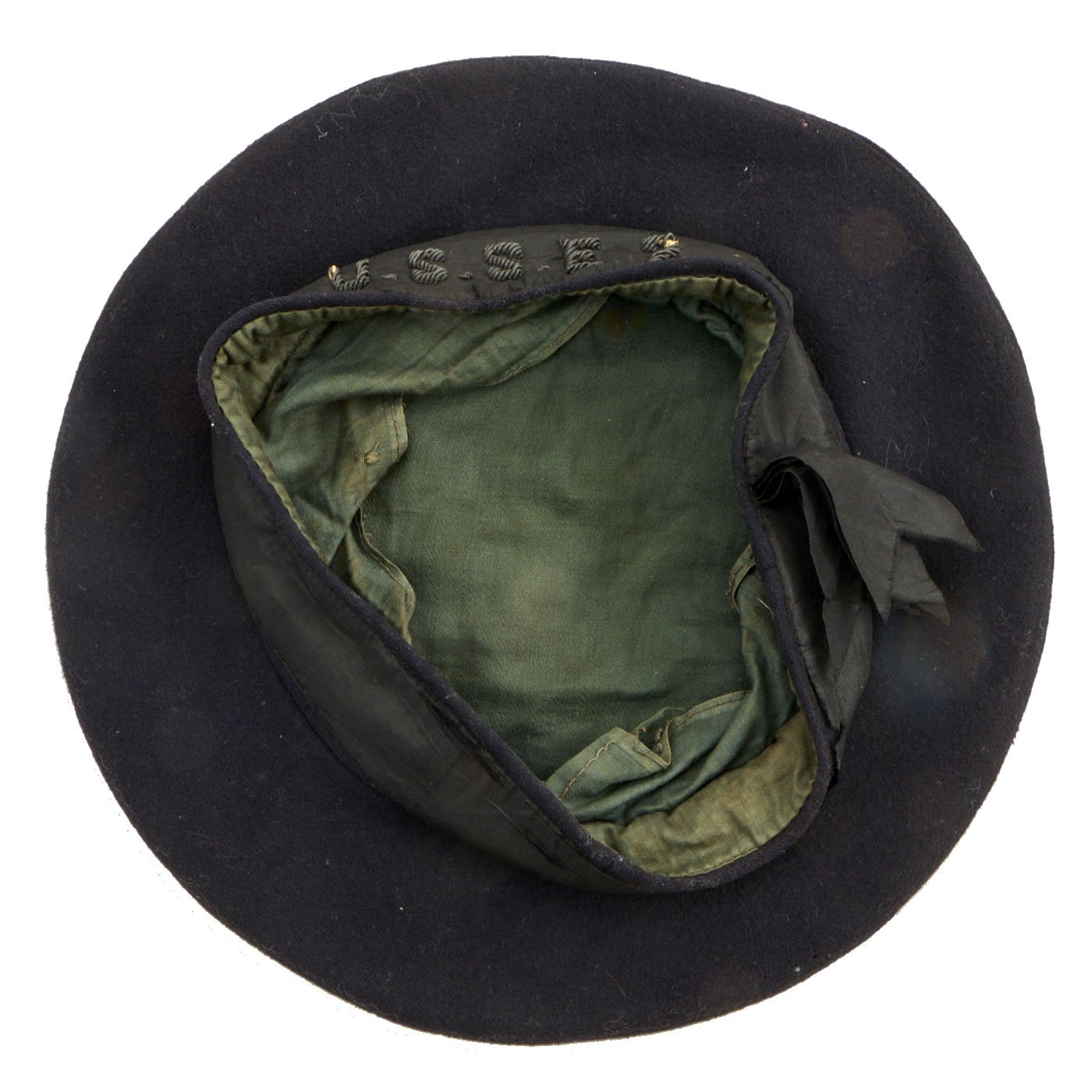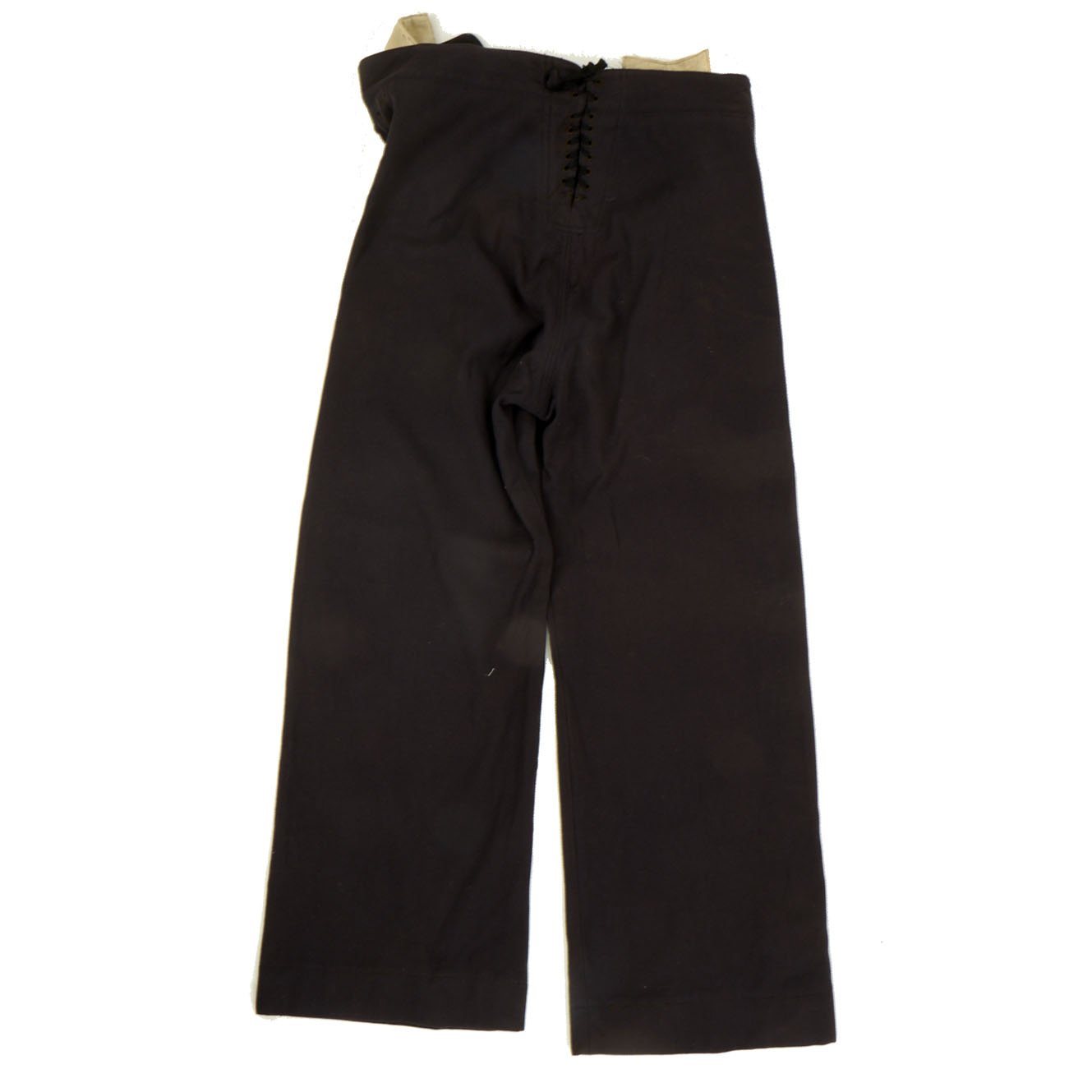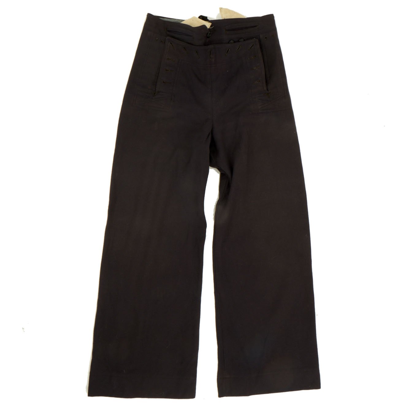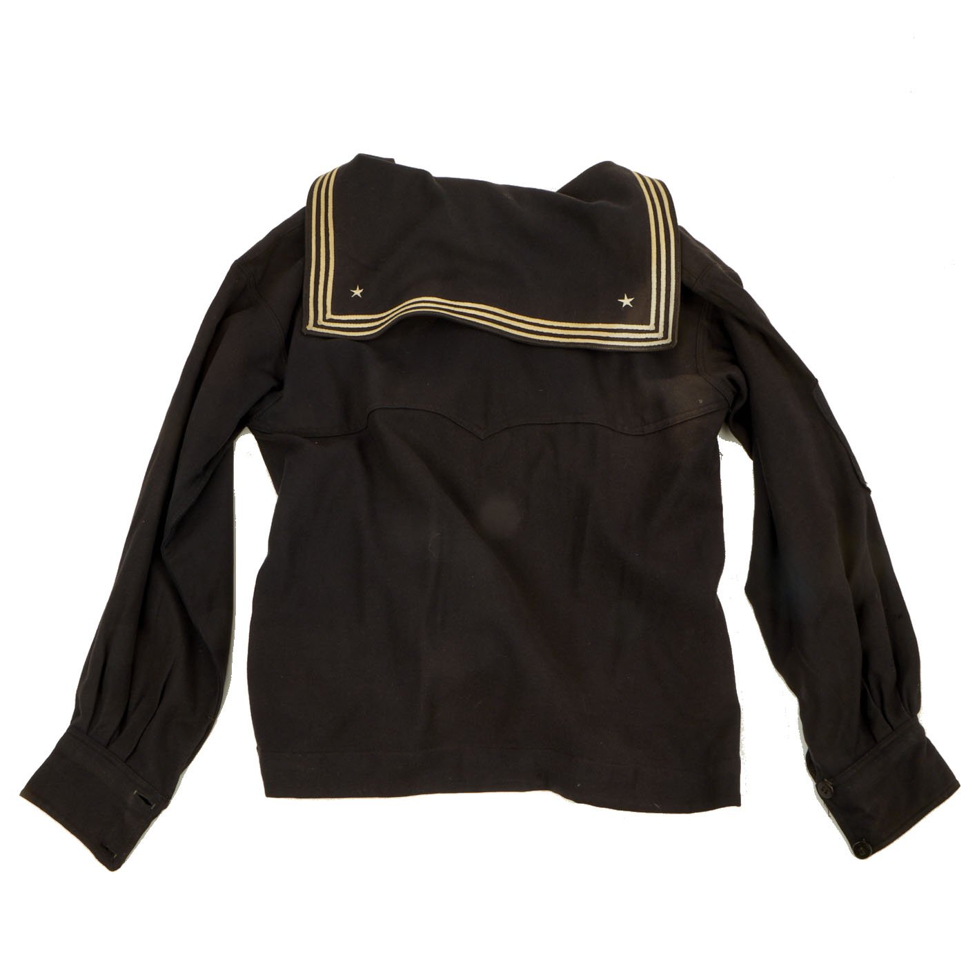 Original Item: Only One Available. Incredibly rare WWI U.S. Navy Submarine Crewman’s Uniform from the U.S.S. E-2, an early U.S. Navy Submarine commissioned in 1912. The U.S.S. E-2 did see action during WWI, performing numerous war patrols seeking German submarines. Artifacts associated with submarine warfare from WWI are incredibly hard to find, as full on submarine warfare was in its near-infancy at that time. This set consists of a Jumper with a Petty Officer Rating (Named to “H.P. Coats”), a pair of matching trousers, silk neckerchief (stenciled with name “Bray A.A.”), and the best piece of the lot, a silk-lined Navy Flat hat with a custom bullion embroidered U.S.S. E-2 Cap Tally. Cap is about a size 6 ⅞. Jumper is roughly a size 36, and trousers about a size 32.