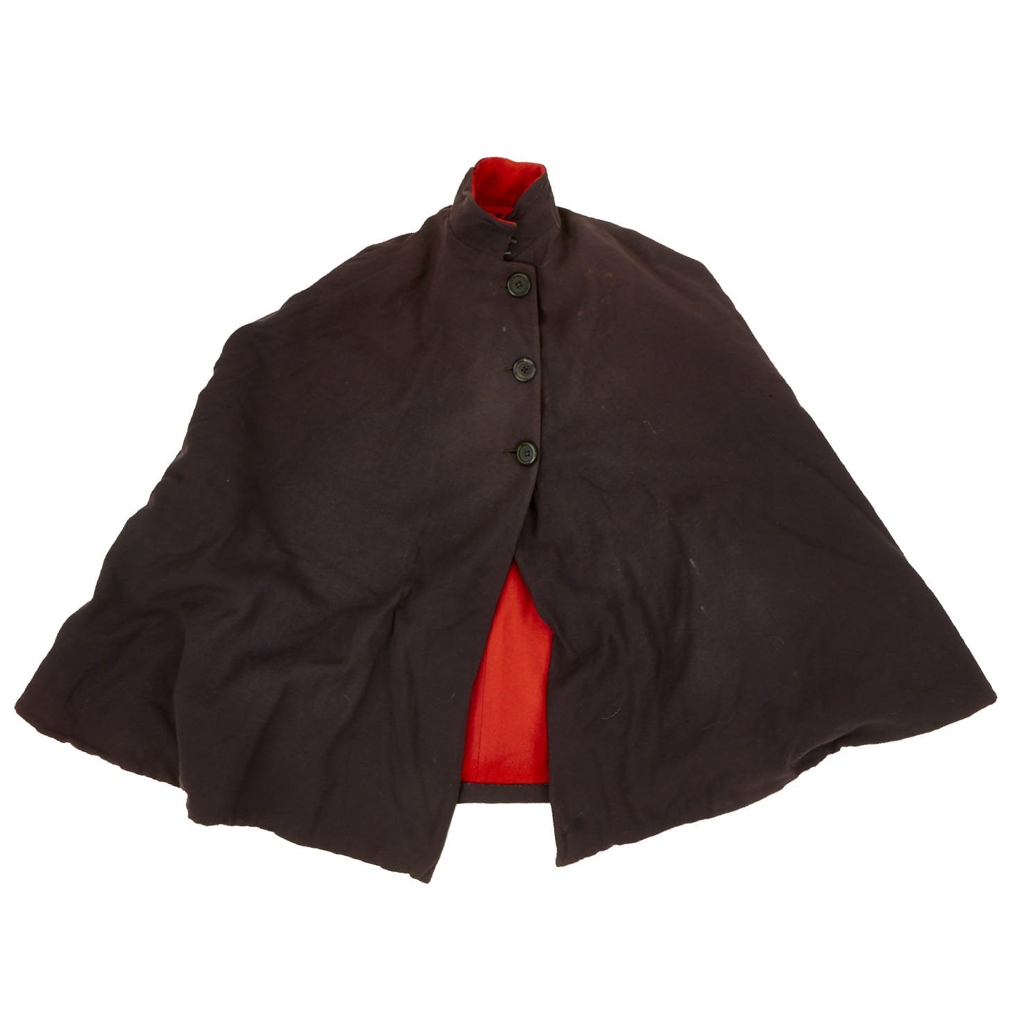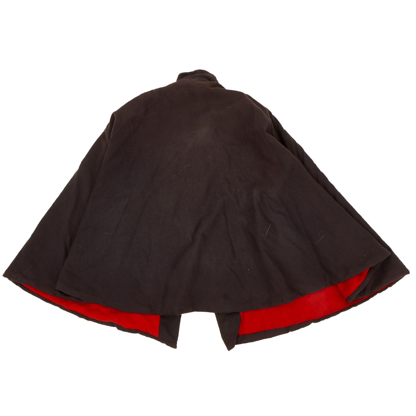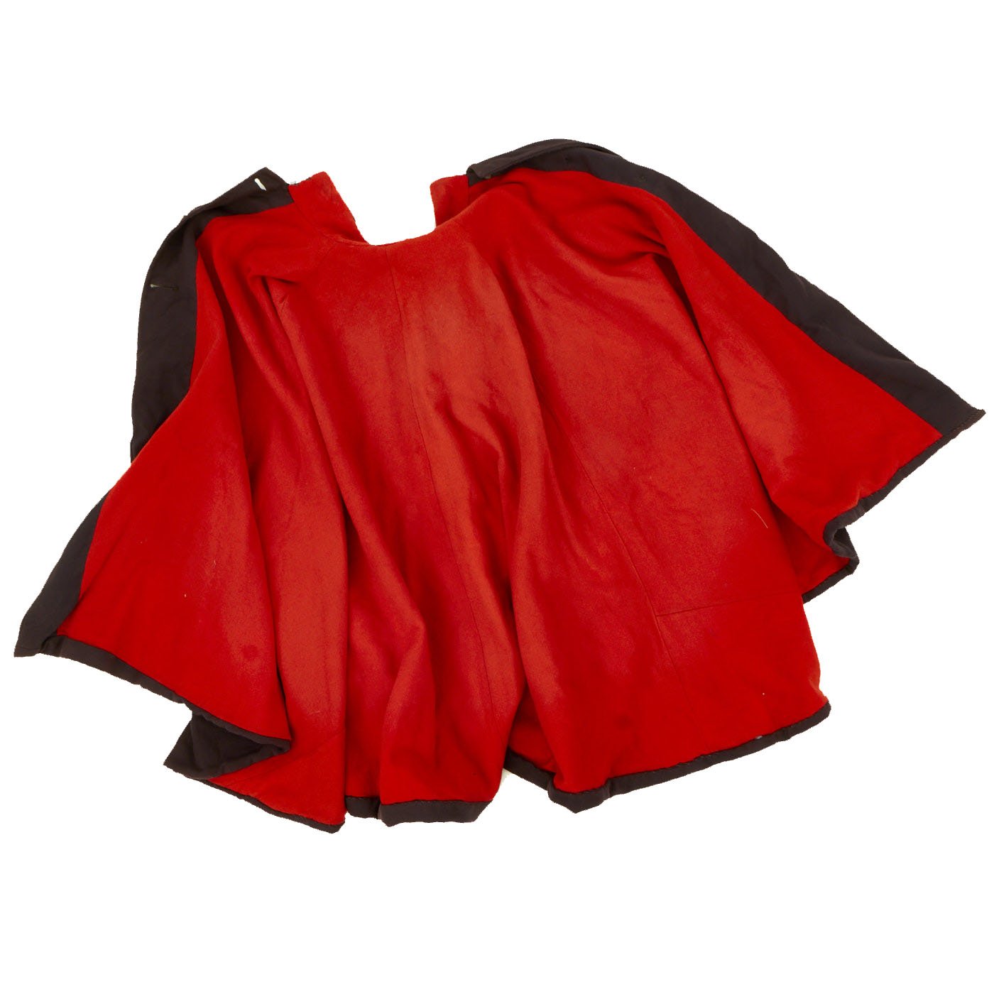 - Classic blue wool cape with red lined interior, offered in very good condition.