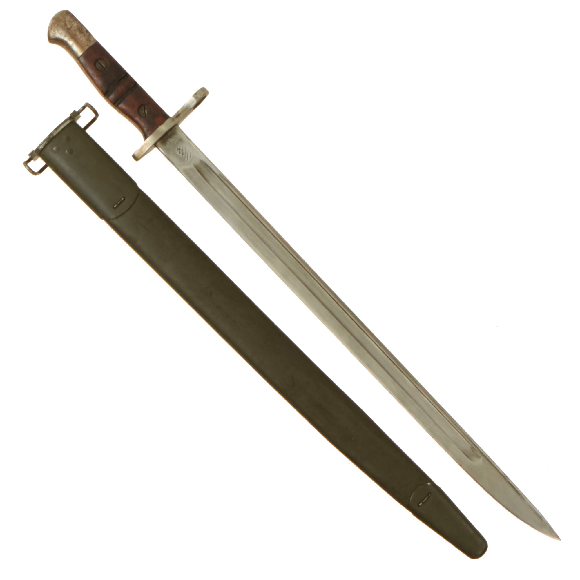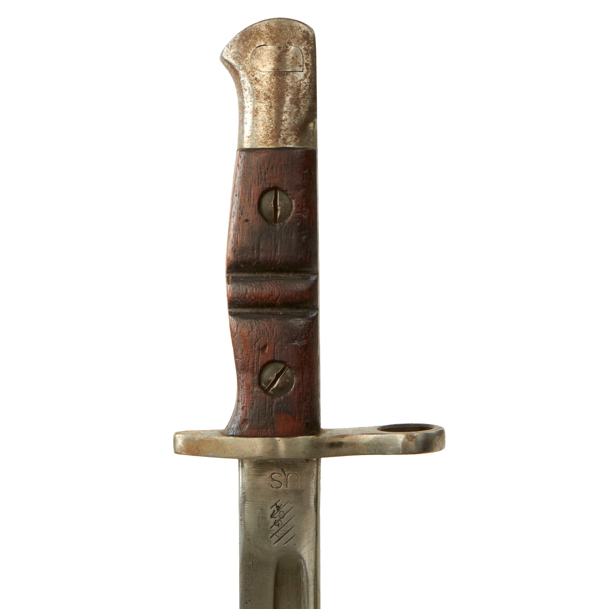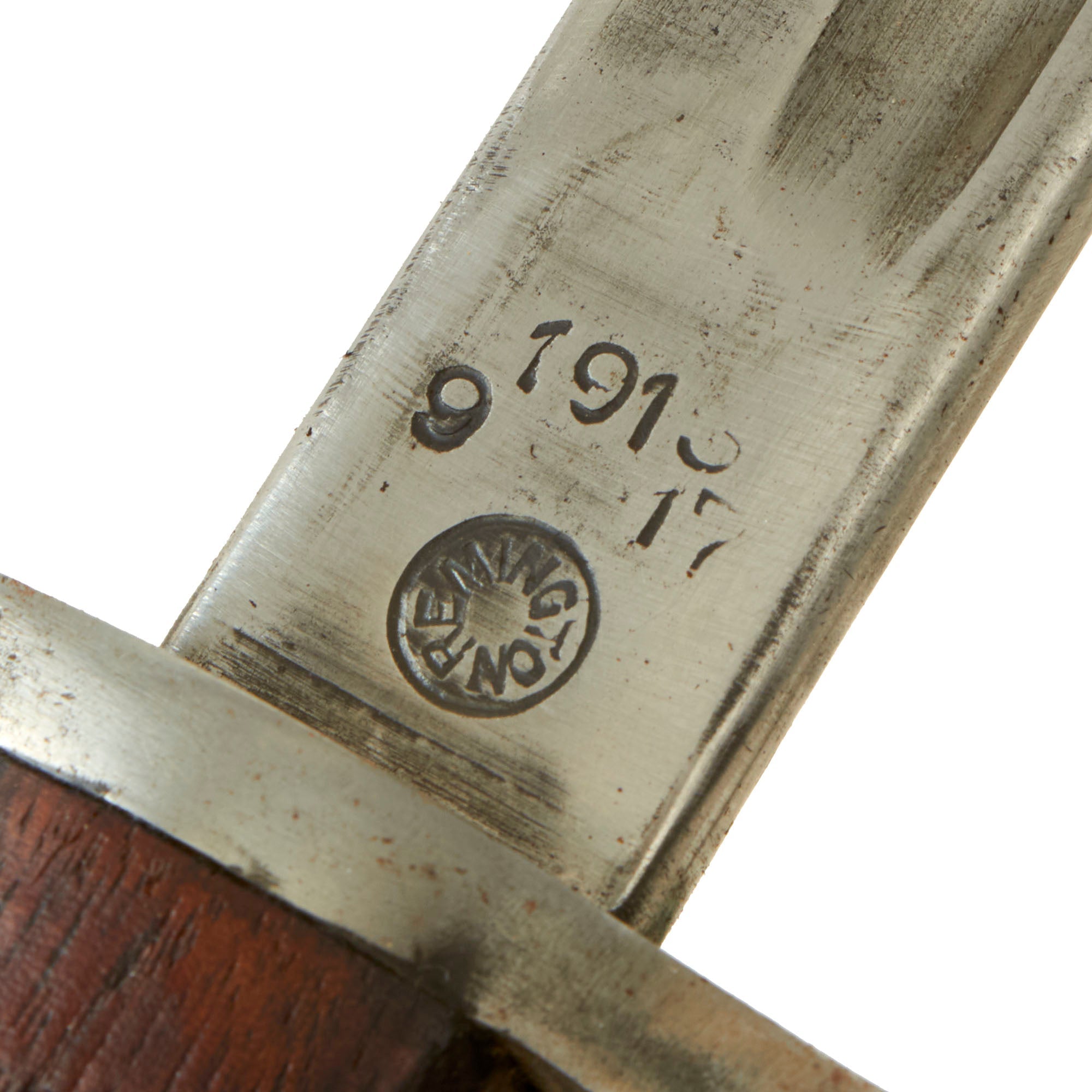 Original items: Only One Available. This is a great example of the rare and hard to find U.S. M1917 Enfield bayonet, in good condition. This example appears to actually be a P1913 which is dated 1917. There is no difference between a 1913 and a 1917 apart from the markings and the oil hole in the pommel on a full production 1917. It comes complete with its original issue leather scabbard, which is also in very good condition. Bayonets by Remington are particularly hard to find, and therefore more desirable.