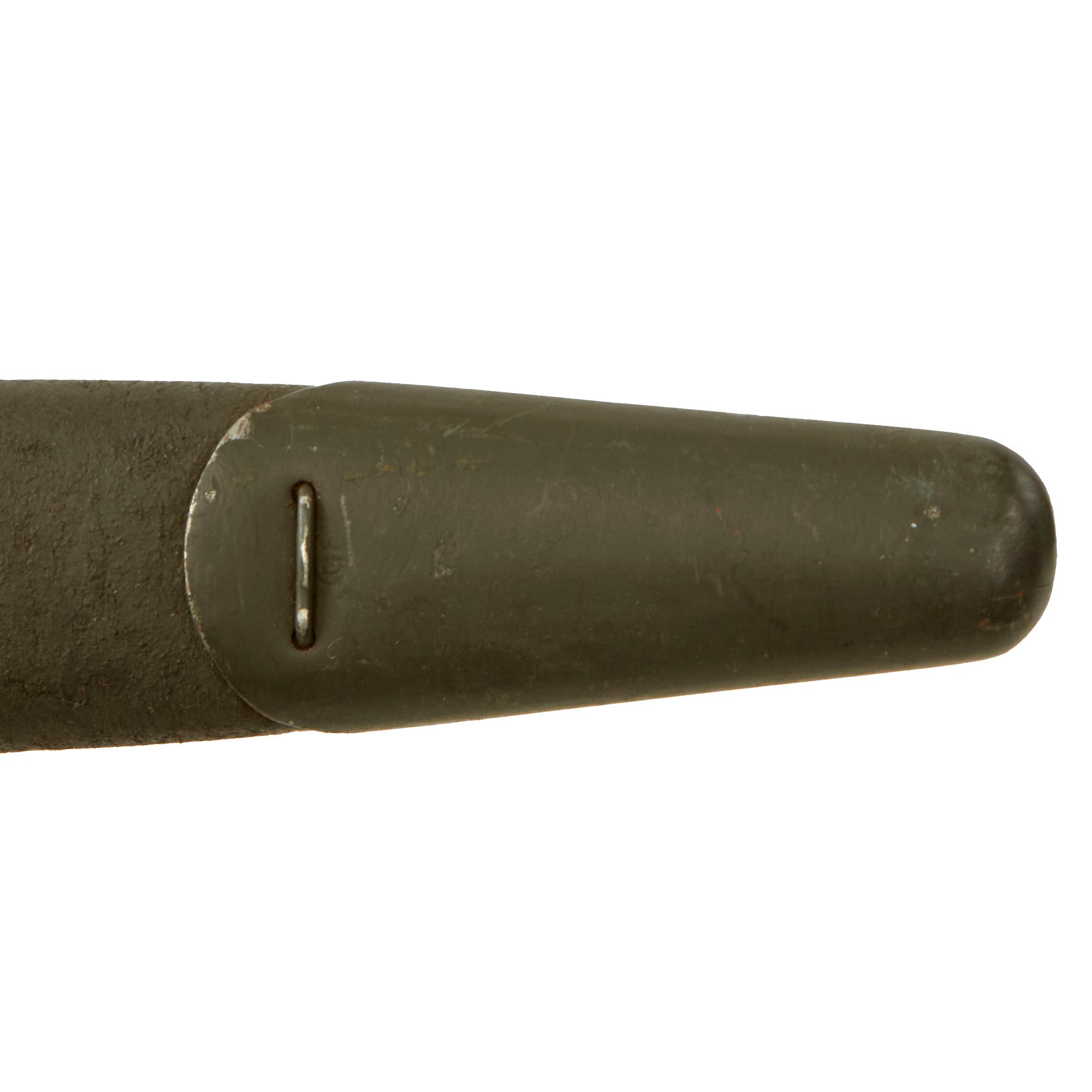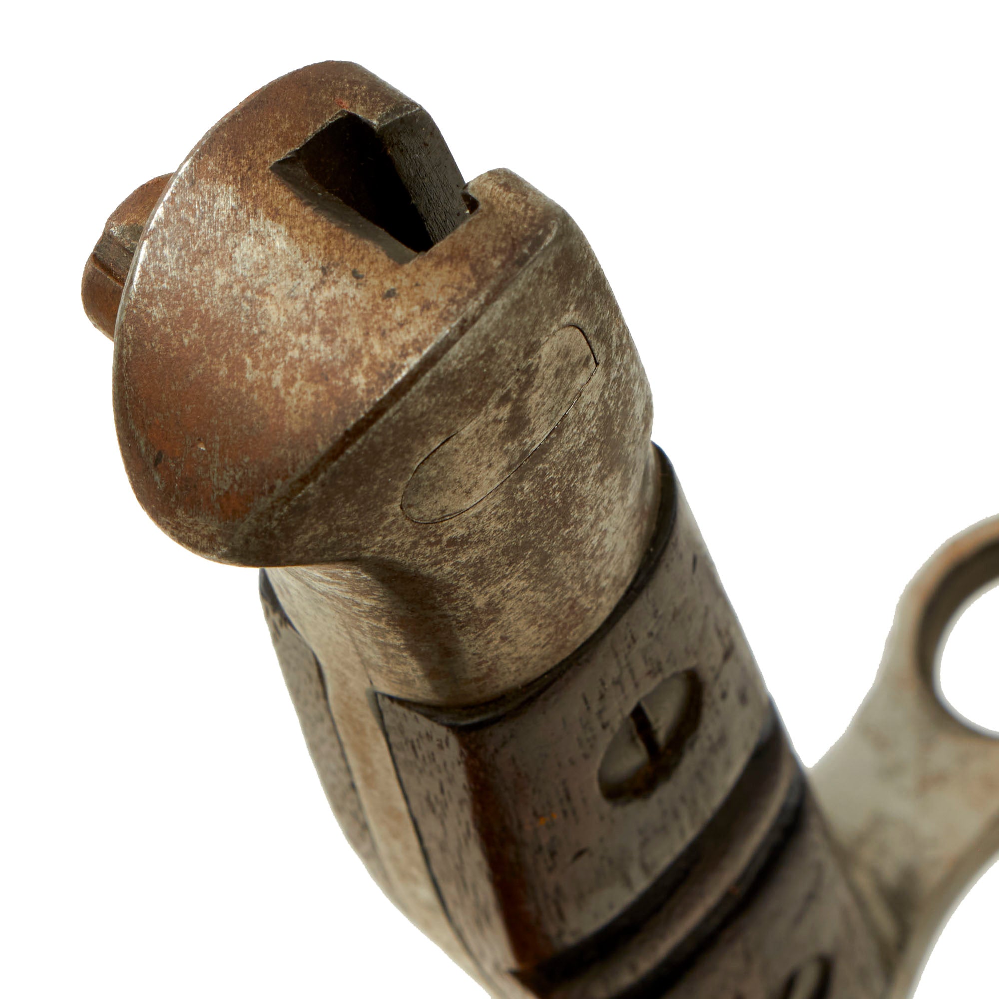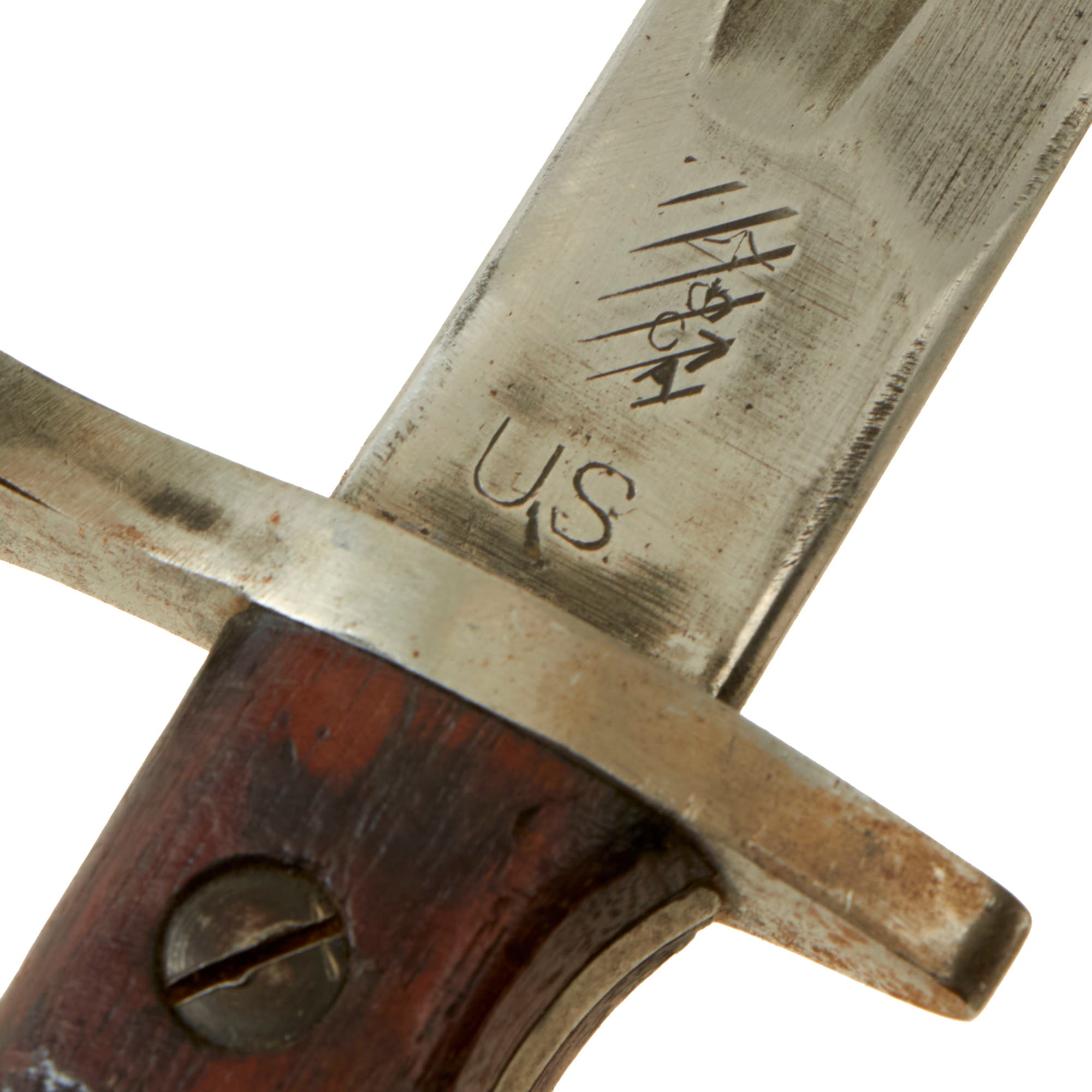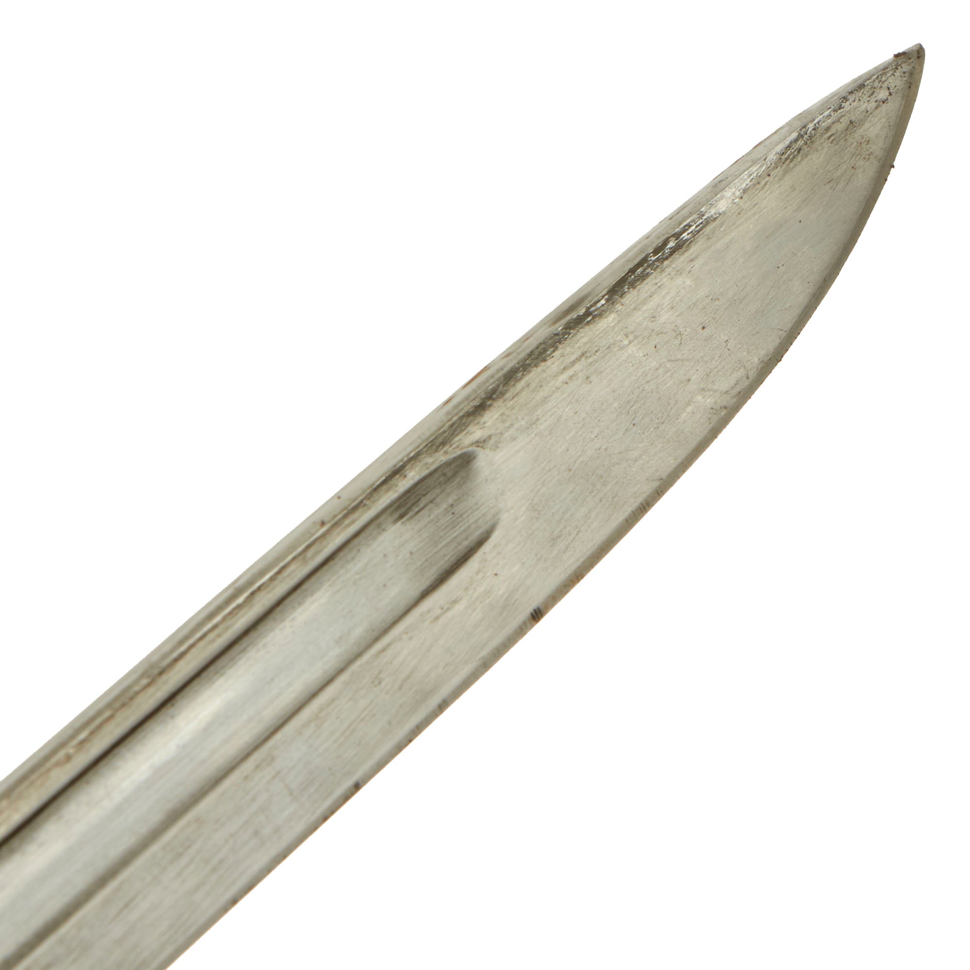 This bayonet is in good condition, and is marked on the blade ricasso with the model, 1913, over the date of manufacture, 9 17 for September 1917, over the Remington logo. The reverse ricasso is marked with various crossed out British proof marks and US. These early P1913s were used extensively alongside the M1917, and are often interchanged. The blade is great, without much oxidation or discoloration as shown, and was sharpened at arsenal once or twice. The edge does not have any nicks or damage. The handle finish has been worn almost bright from cleaning, and the wood of the grip is a bit service worn. The grip scales are excellent, with a great color. The hilt shows some moderate oxidation.