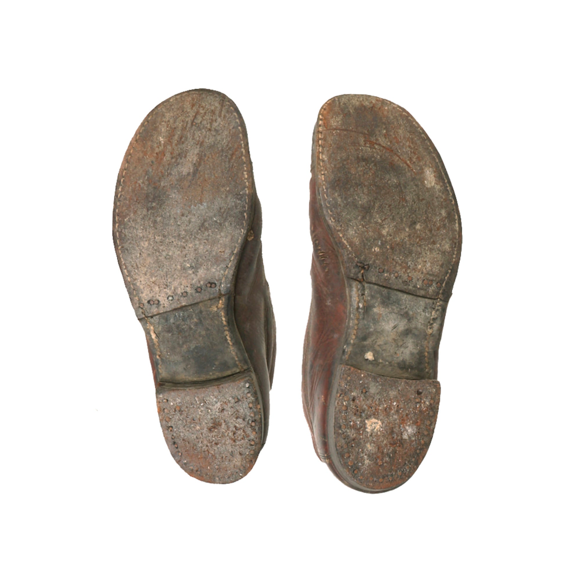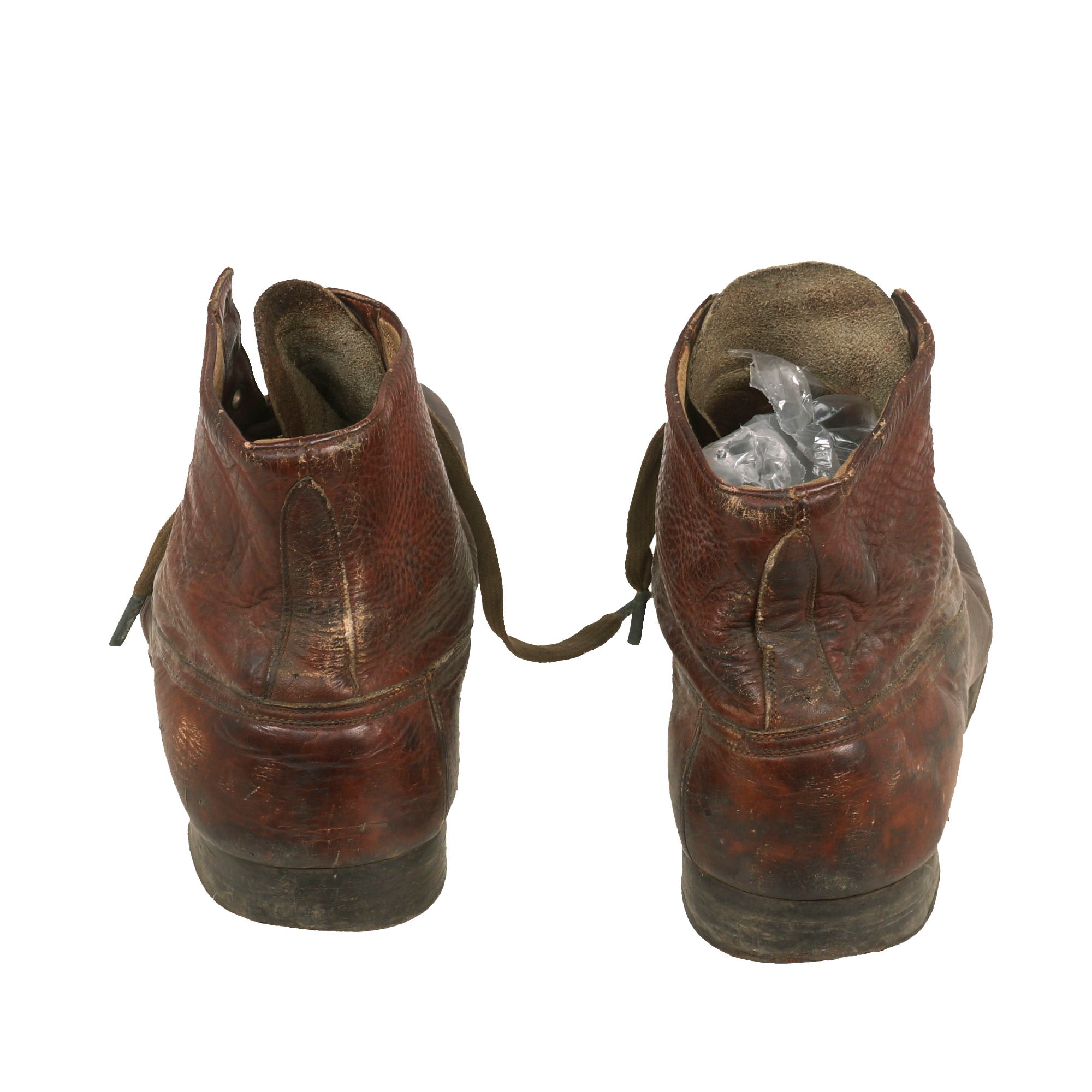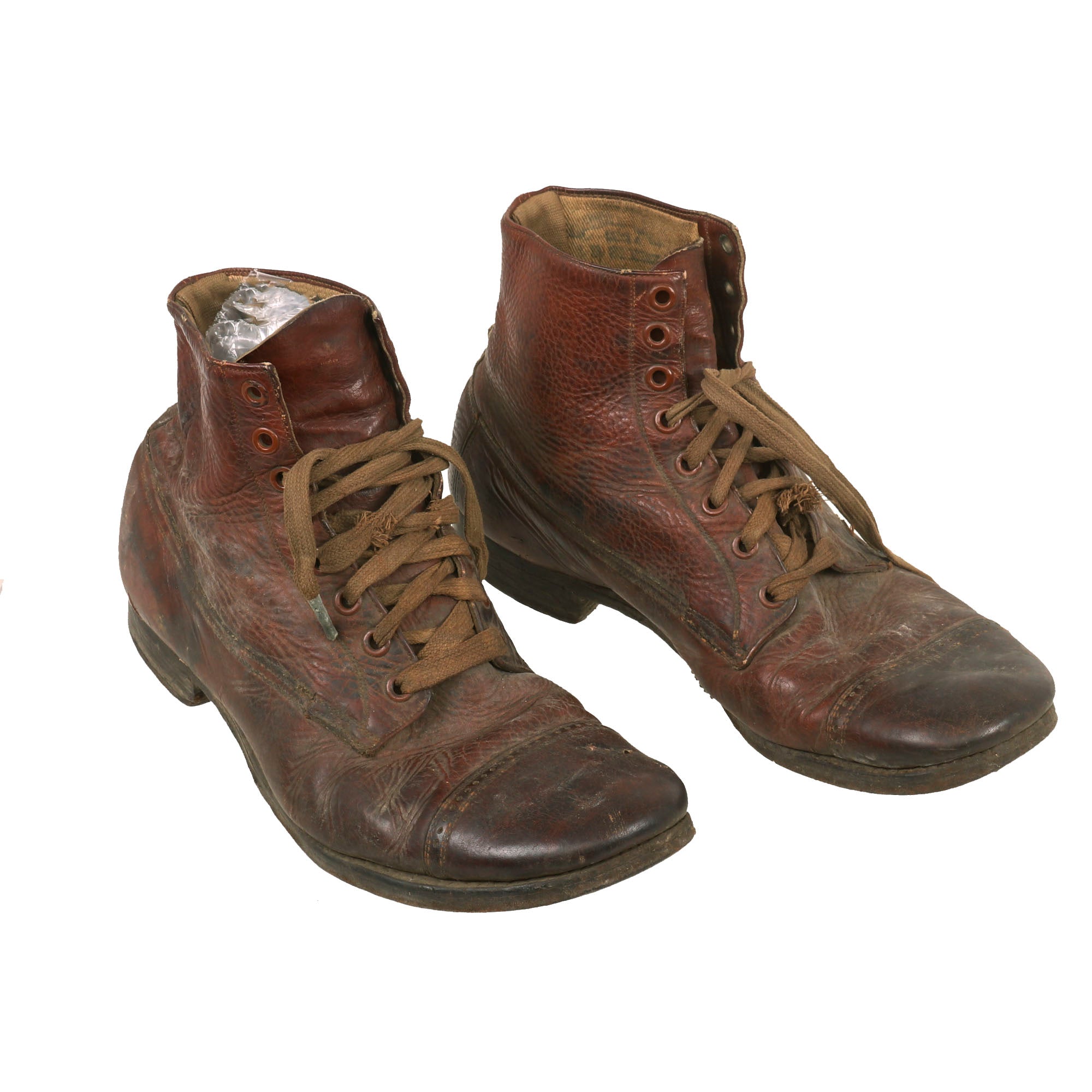 Both shoes also retain their pull-up straps. The soles of both shoes show very heavy service use. The shoes have lost their form but the form could easily be brought back by stuffing the shoes. This is a fantastic set of shoes that would fit well in any WWI Display! Comes ready for further research and display.