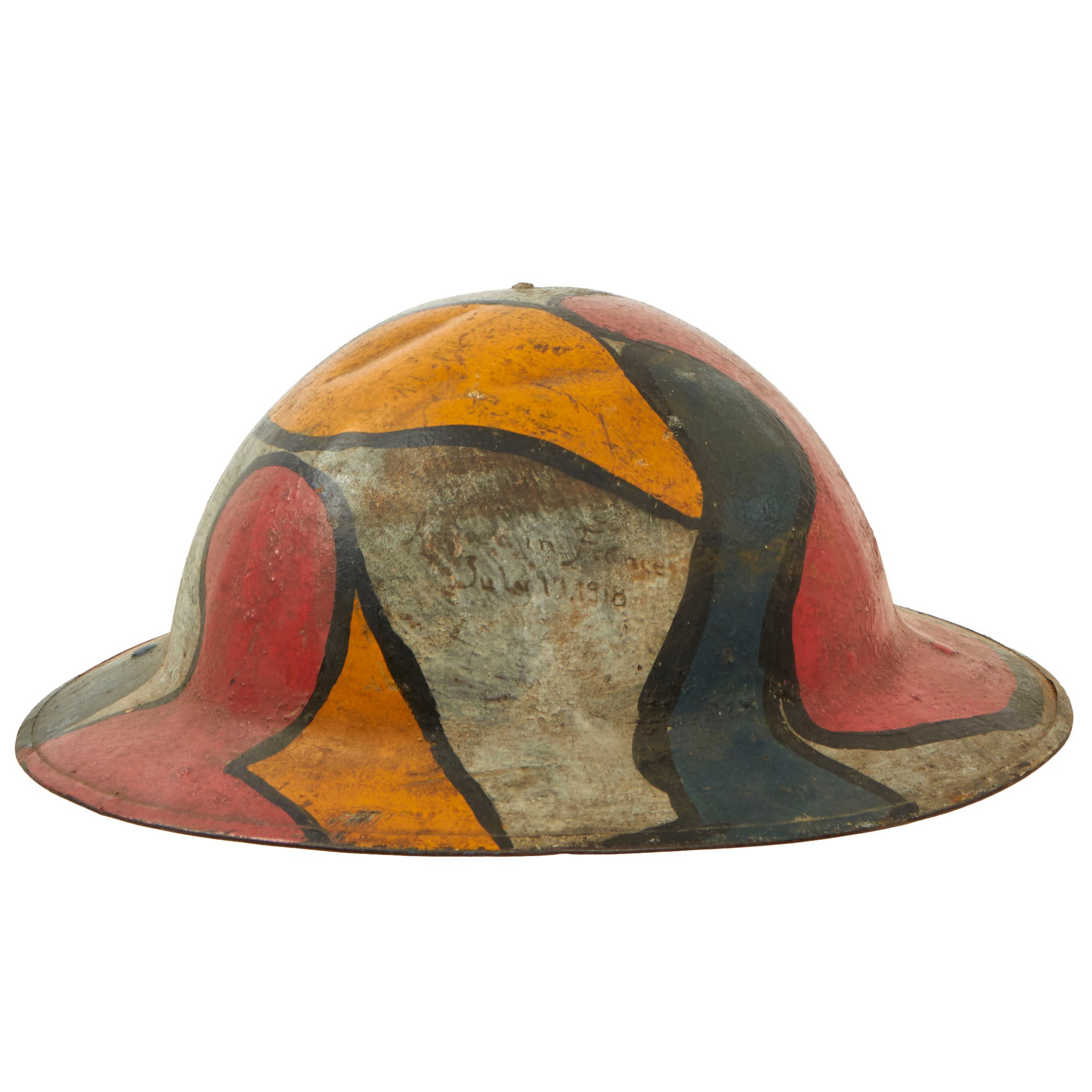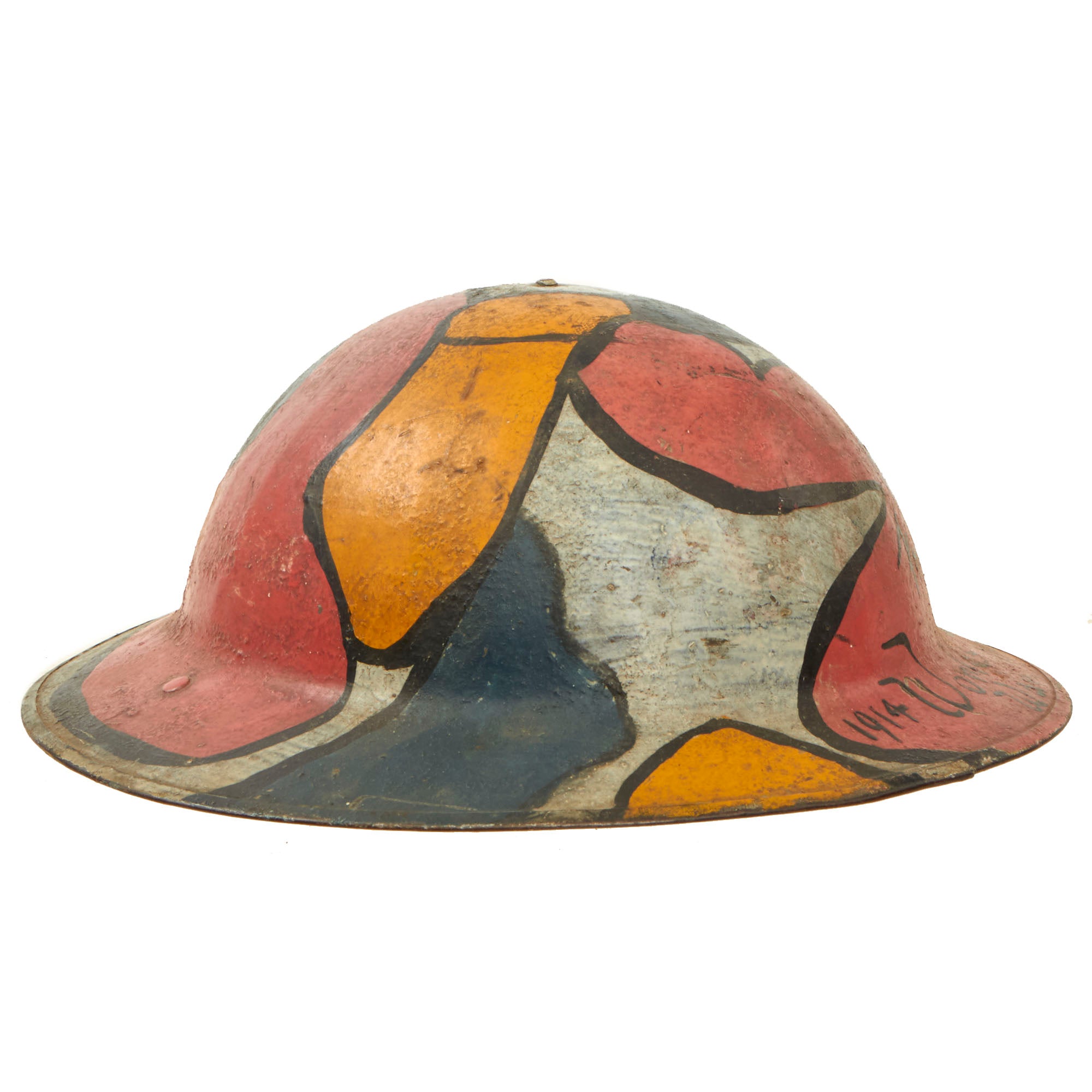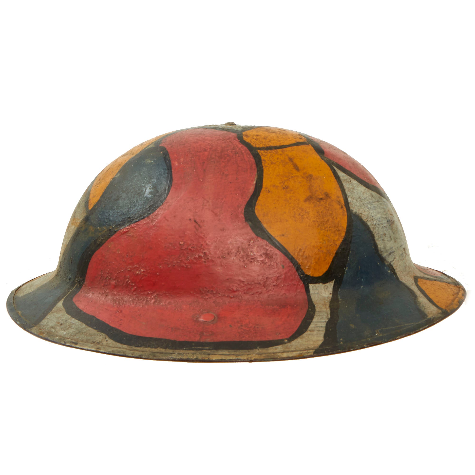 Original Item: Only One Available. This is a lovely example of the scarce WWI British MkI Brodie helmet, which was also the same type that was issued to American forces in the beginning of the US involvement during The Great War. The shell features vibrant panel camouflage paint that was a very popular paint scheme used by all armies that fought during WWI.