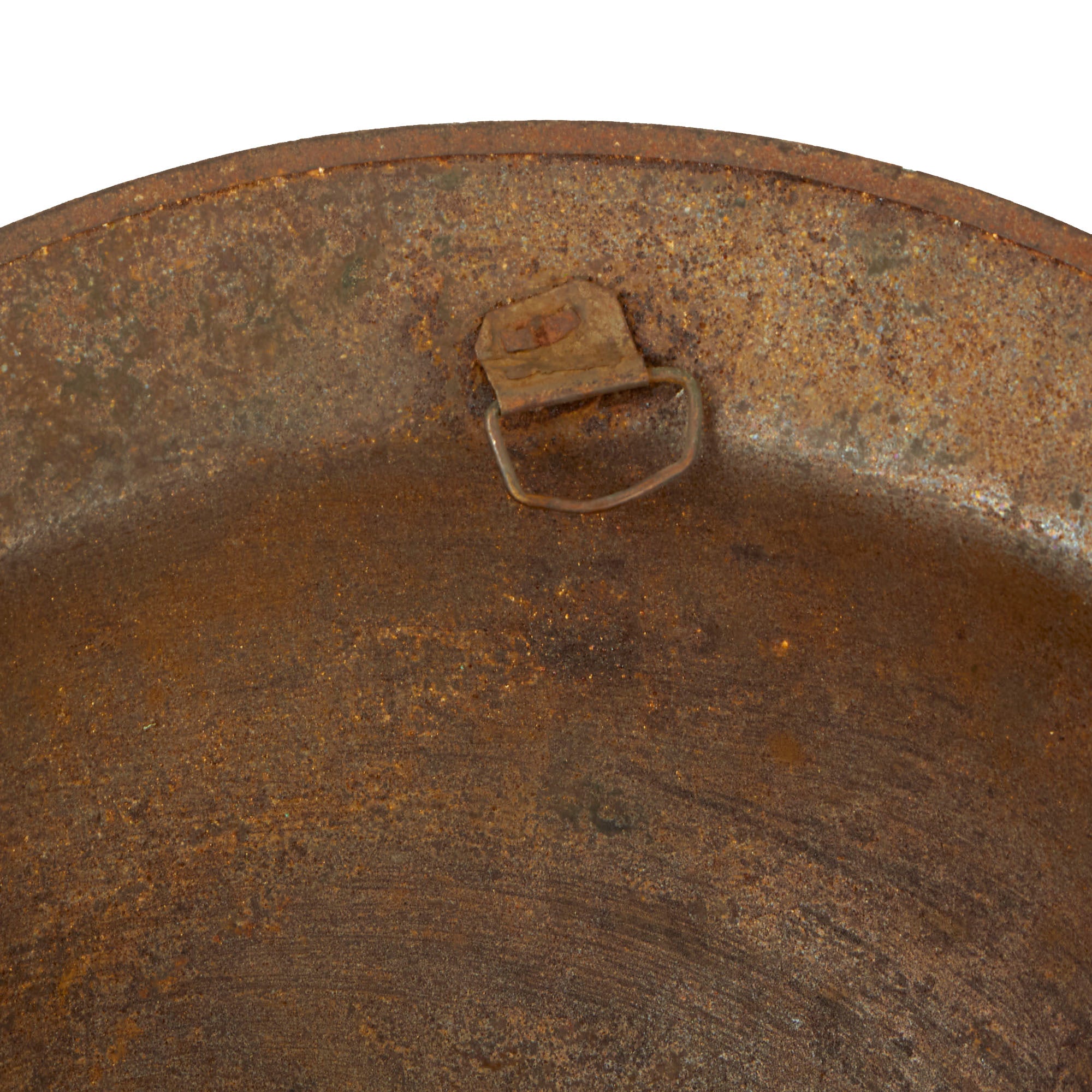 The shell is maker-marked with a stamping on the underside of the rim that reads FS 126, for manufacture by Thomas Firth & Sons Ltd of Sheffield. It is partially obscured under the heavy paint and can be difficult to read. The split pins on the chinstrap bales indicate this as a British made helmet.