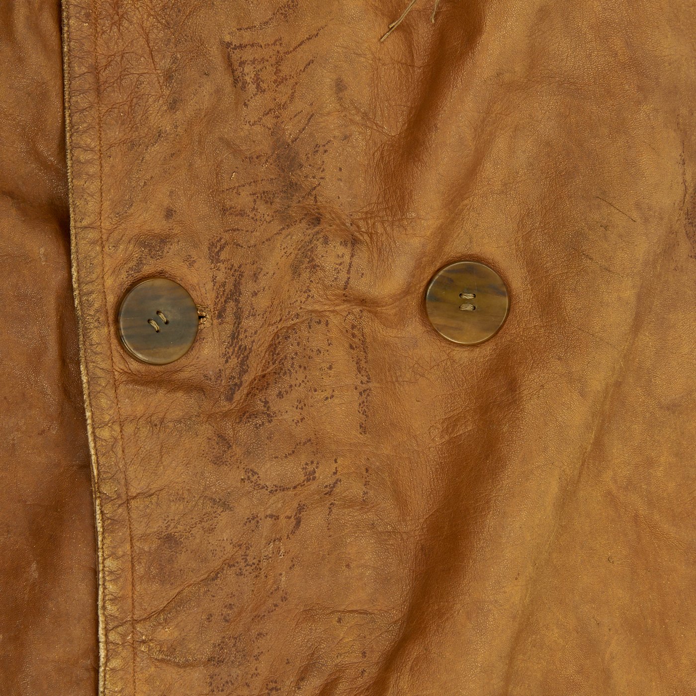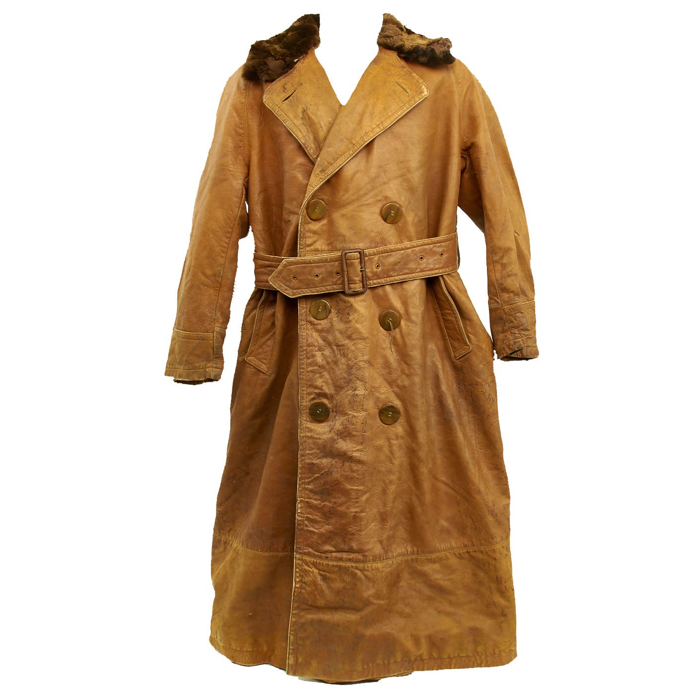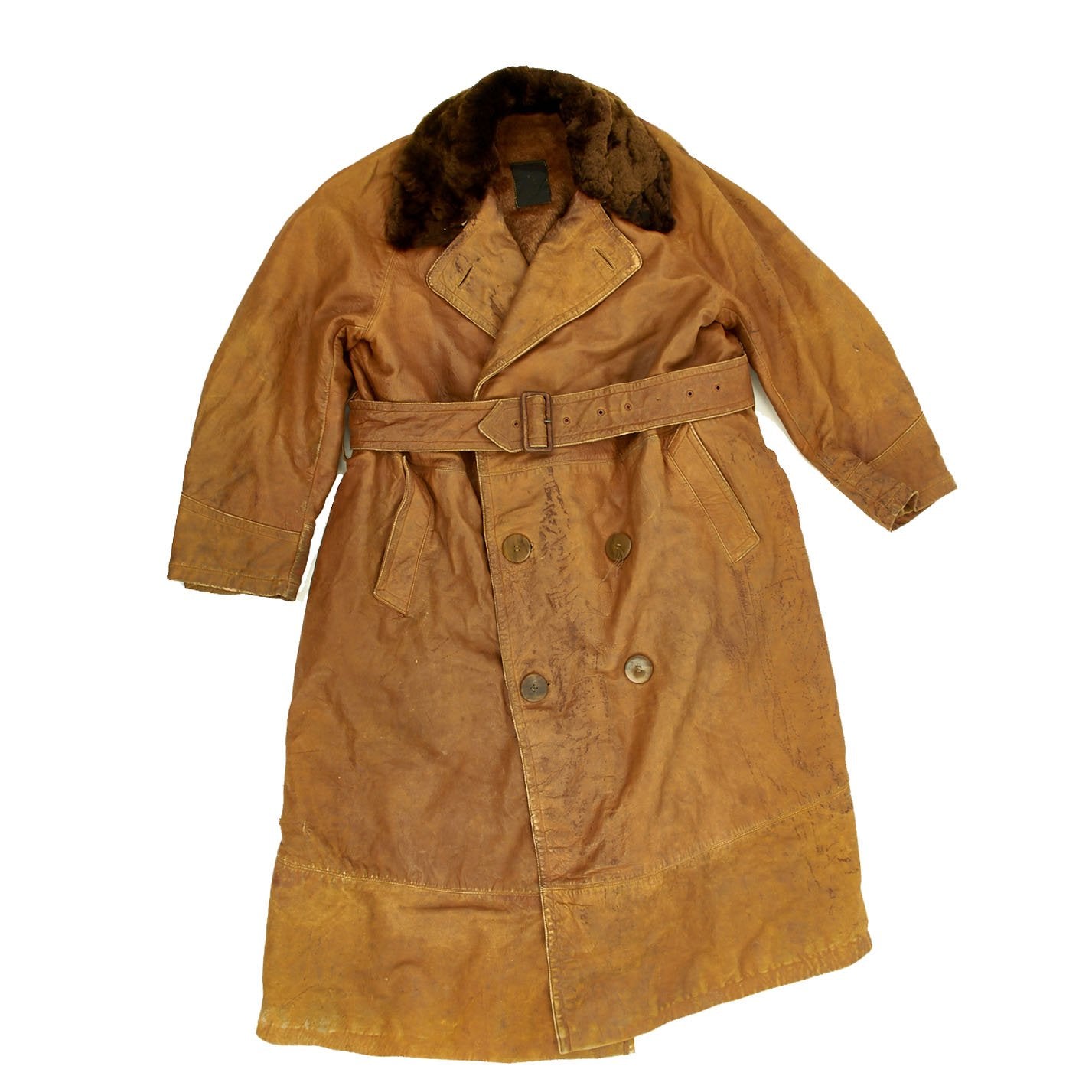 Original Item: Only One Available. Fantastic lined leather flying coat from World War One. Features soft brown leather to the exterior, fur lined collar and fur lined interior. Features cross beta, large buttons and slash pockets. Tailor label not legible.