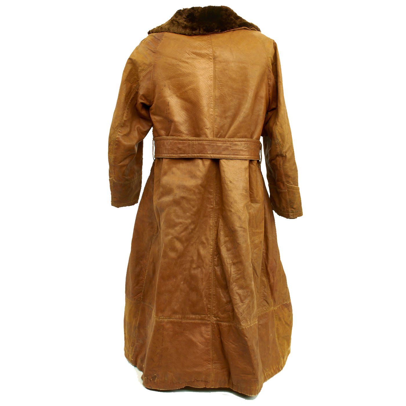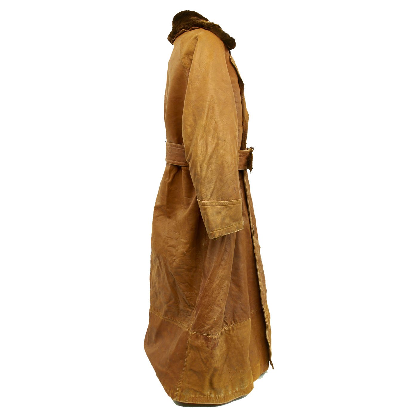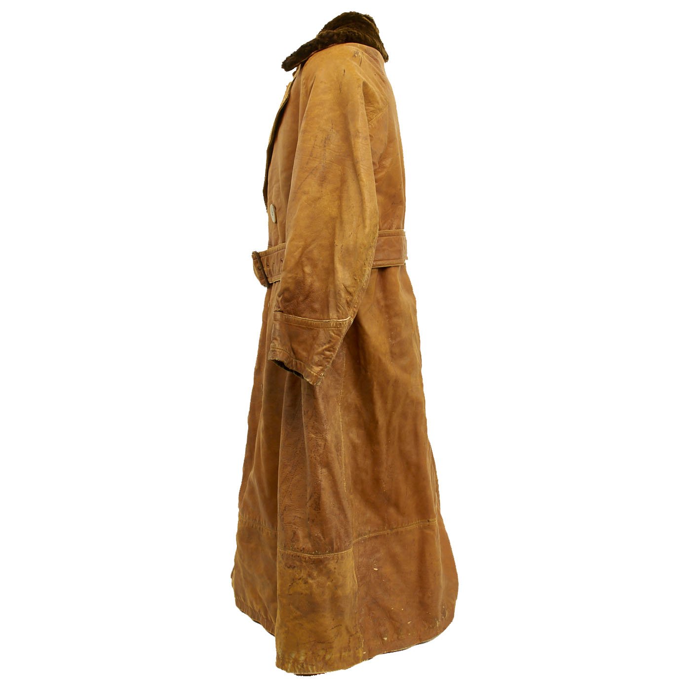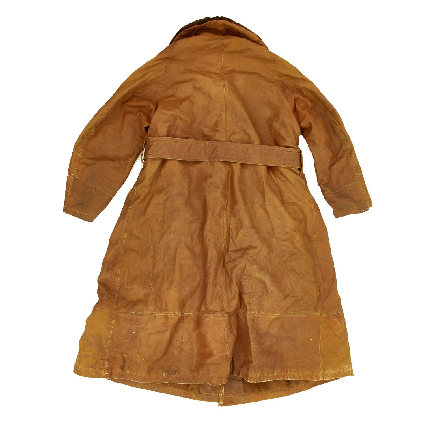 Original Item: Only One Available. Fantastic lined leather flying coat from World War One. Features soft brown leather to the exterior, fur lined collar and fur lined interior. Features cross beta, large buttons and slash pockets. Tailor label not legible.