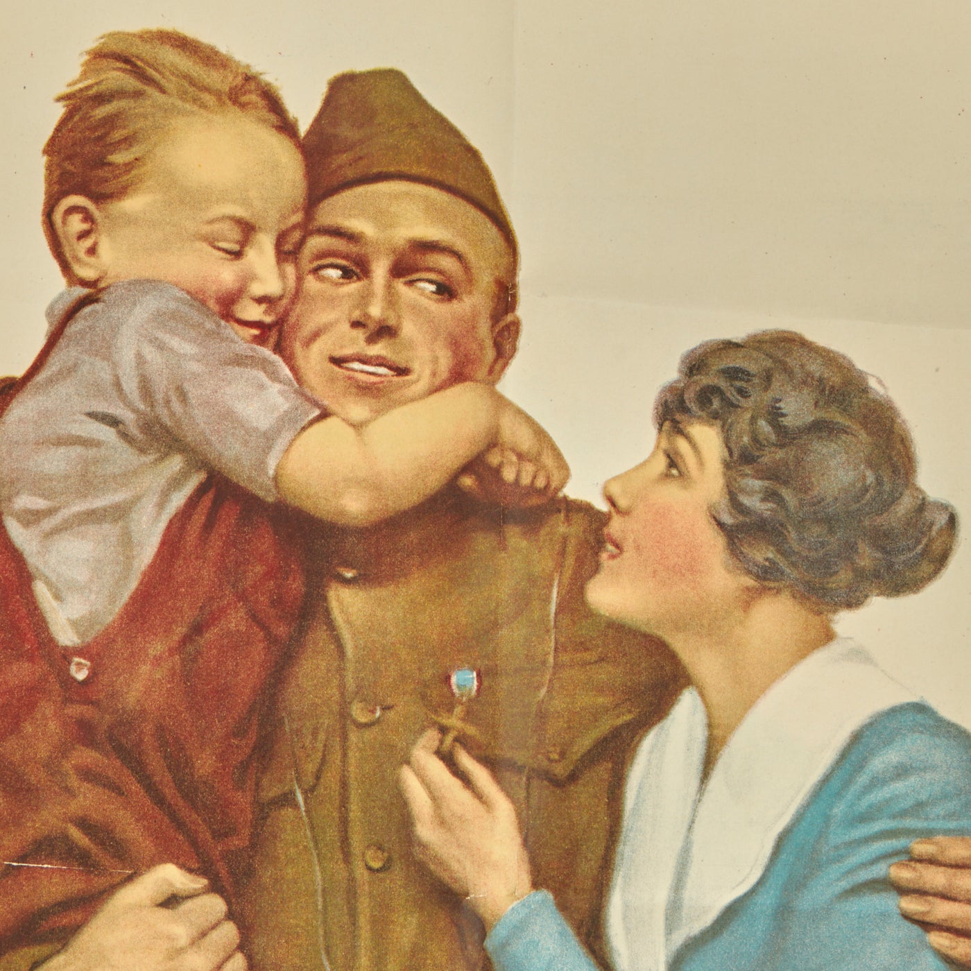 The first poster features a color illustration lithograph advertising Victory Liberty loans by Alfred Everitt Orr (1886 - 1938). Features a soldier, in khaki, at the center of a touching family scene. He is embracing his wife and holding his child who are together dressed in red, white and blue. The poster reads: