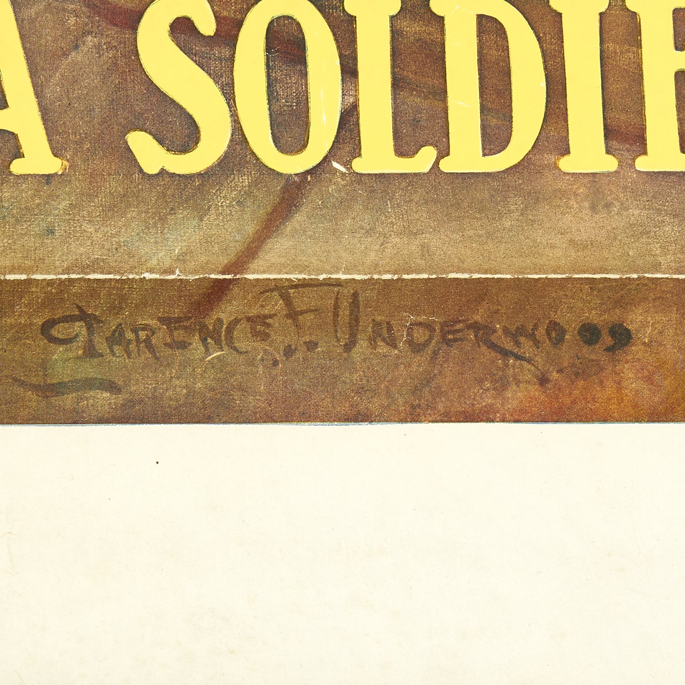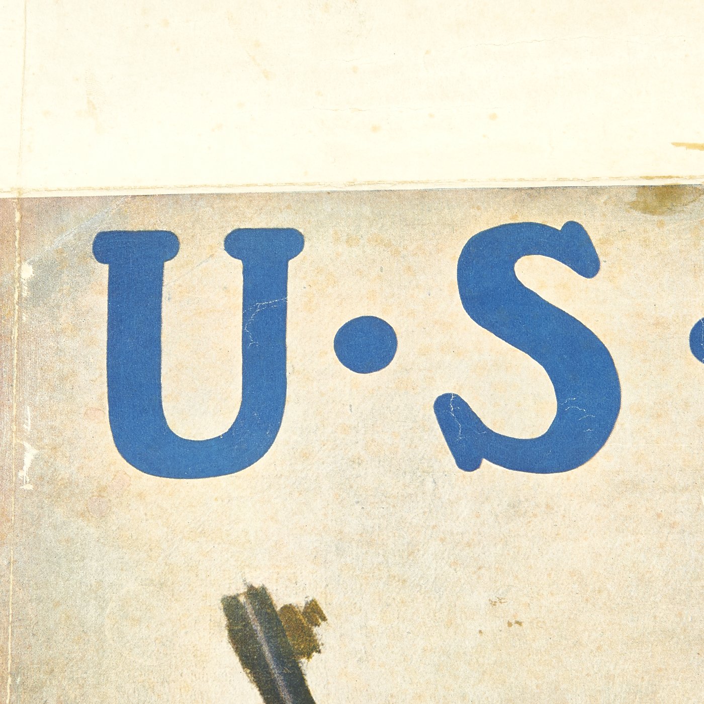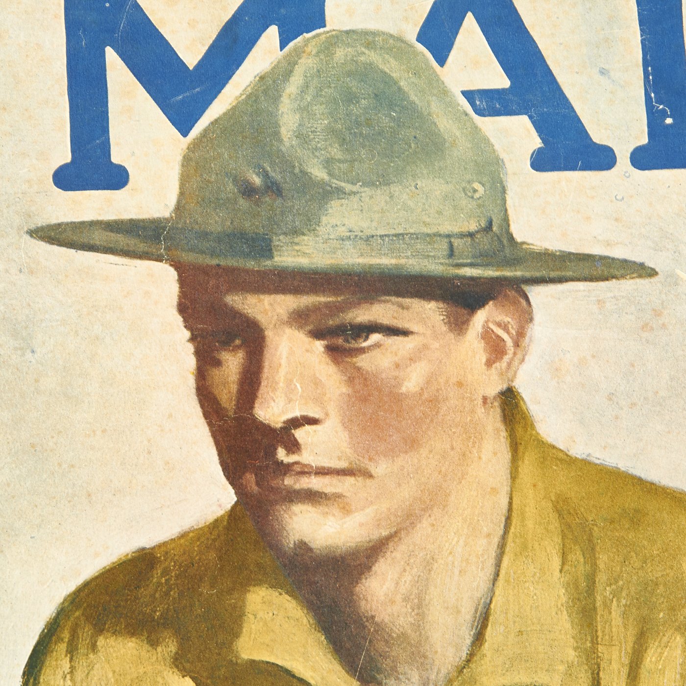 Original Item: Only One Available. United States Great War U.S. Marine Corps recruitment poster designed by Clarence F. Underwood. Poster showing a marine with his rifle, seated on a harbor wall. In the background are battleships on the ocean.