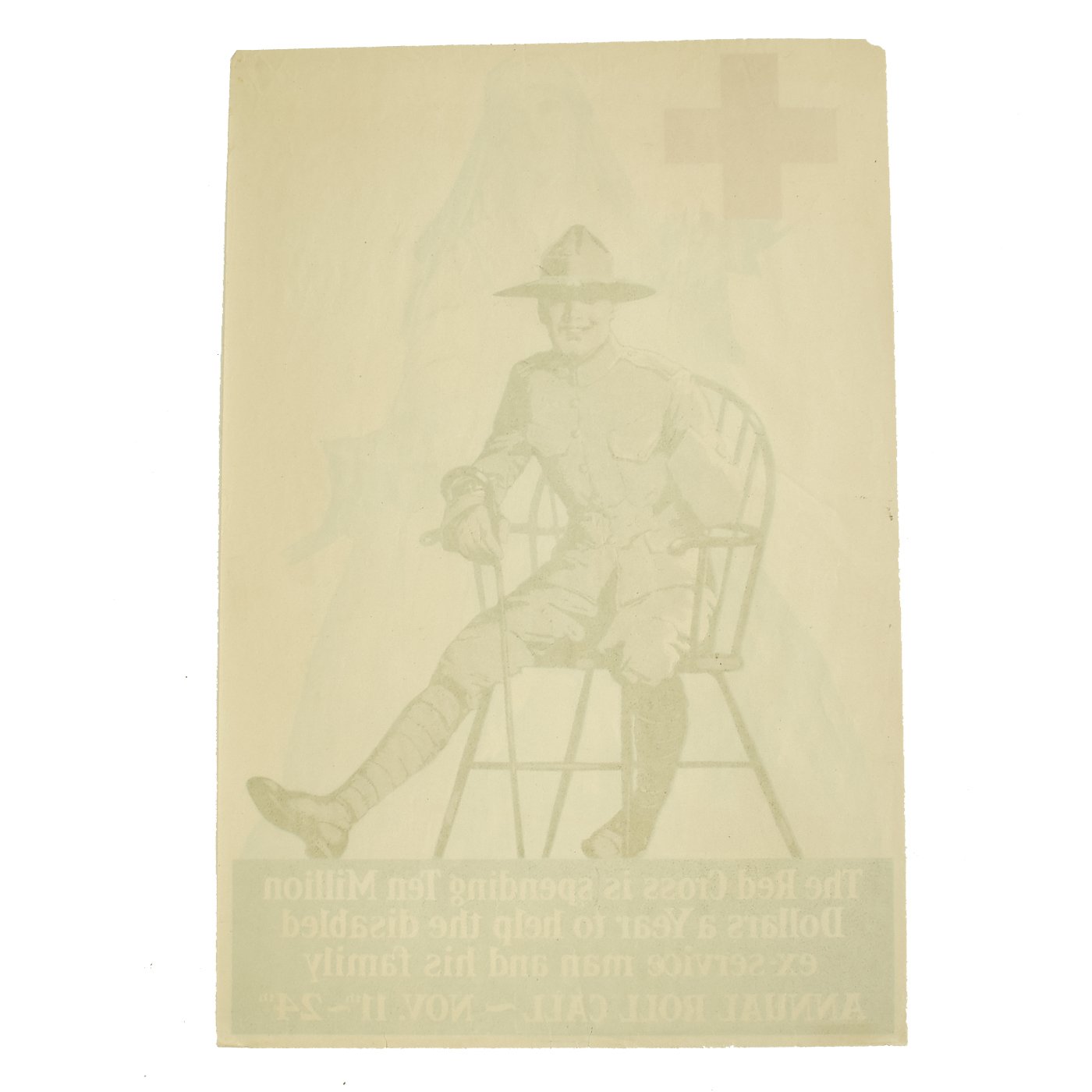 It features a full color disabled soldier holding a cane and sitting in a chair while shadow of a Red Cross nurse looks onward in the background. Red Cross cross in upper left hand corner. The original are can be found in the Library of Congress at this link.