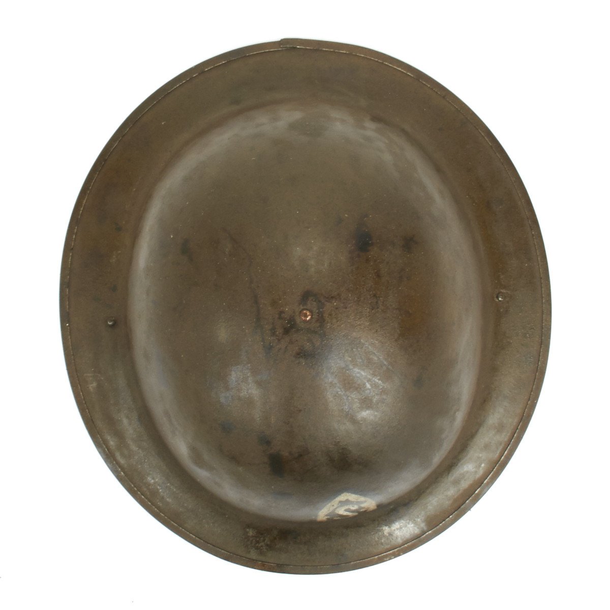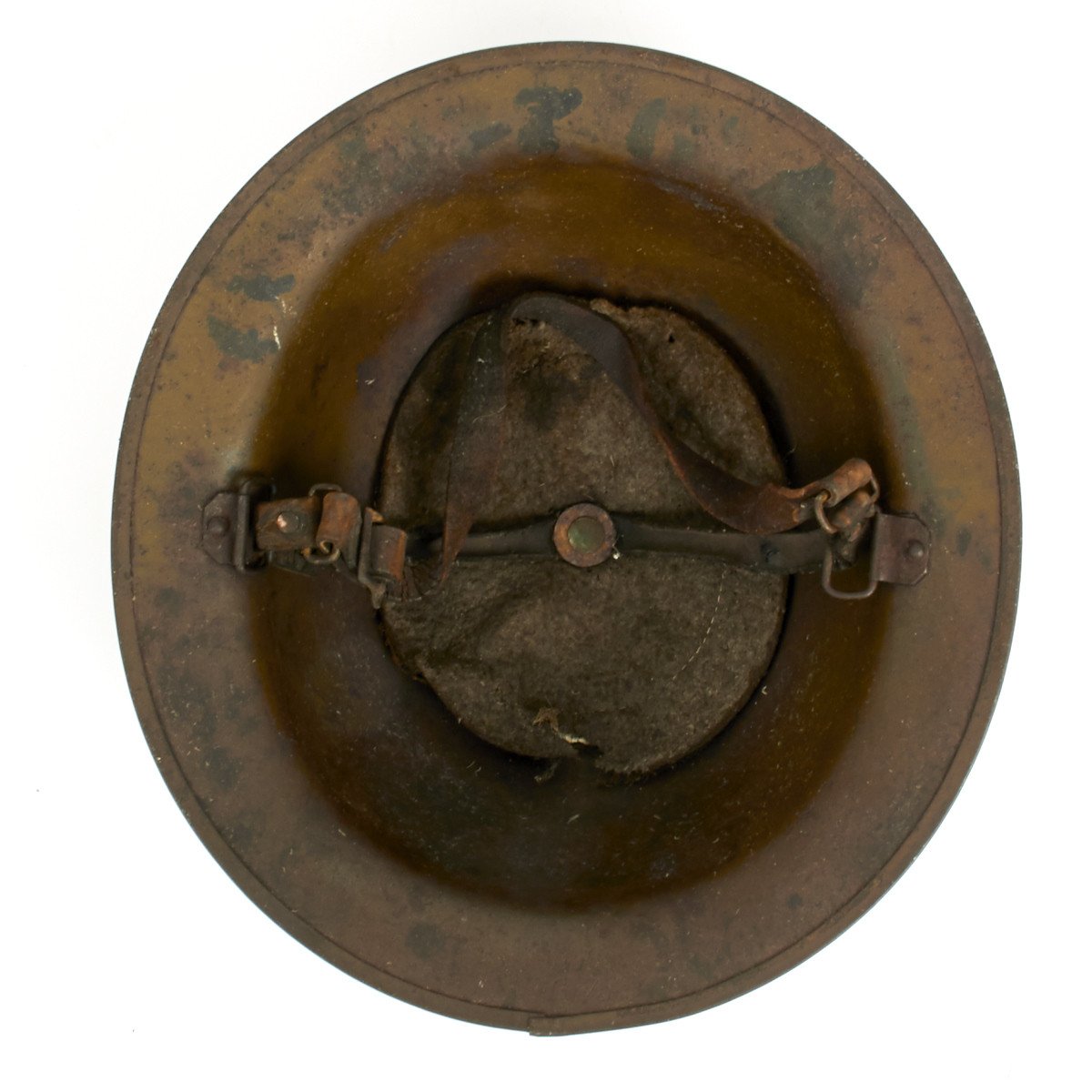 M1917 helmet liners typically show a paper label at the crown and the dome rivet head. The liner is set up as on the British versions, with an oilcloth band and net configuration, attached to a leather strap, riveted to the shell. The chinstrap is leather with steel buckle.