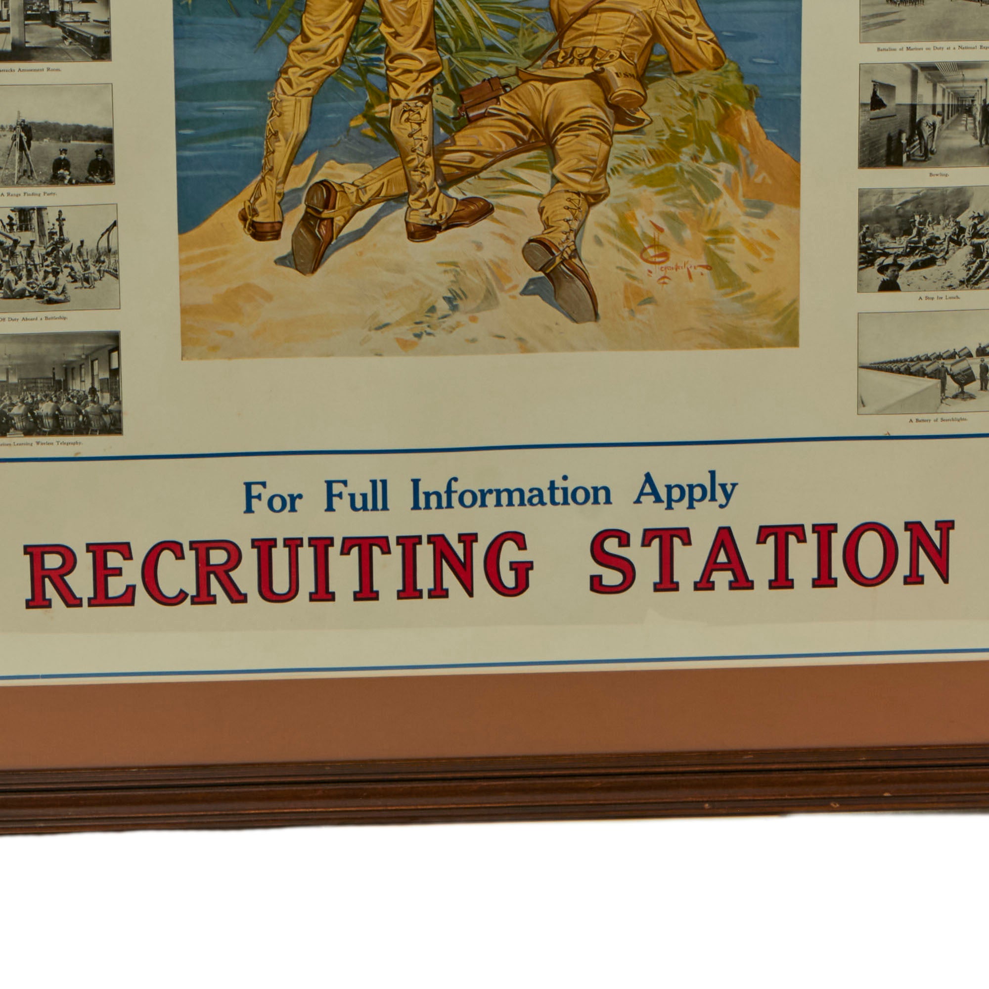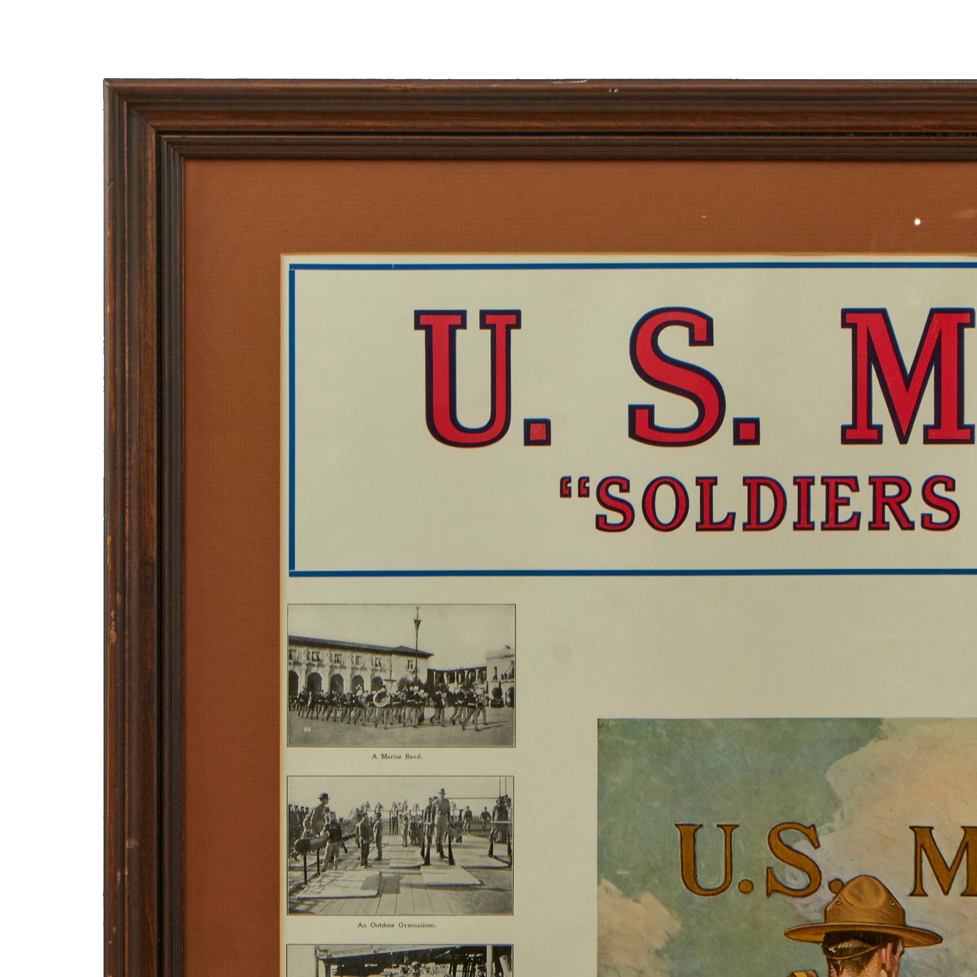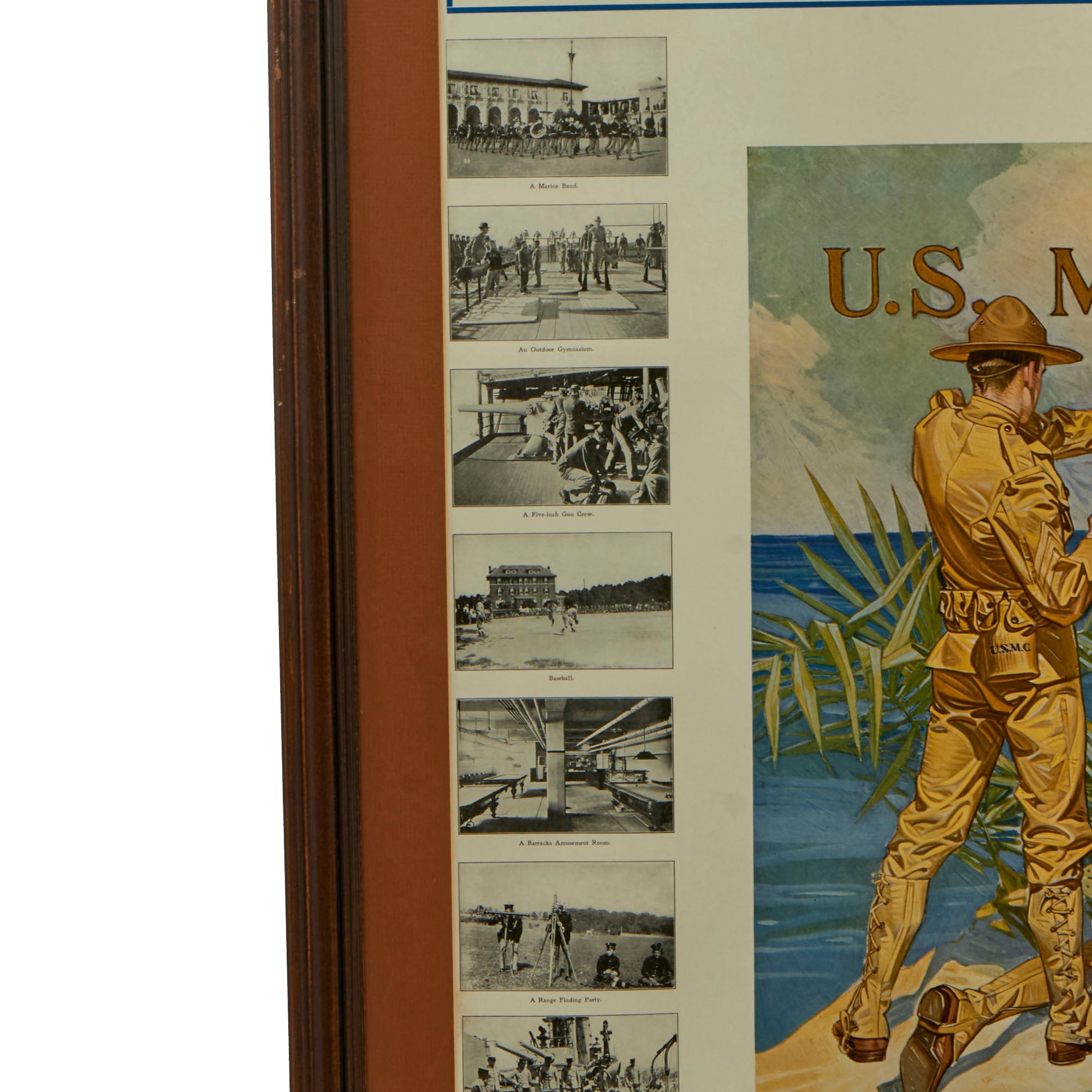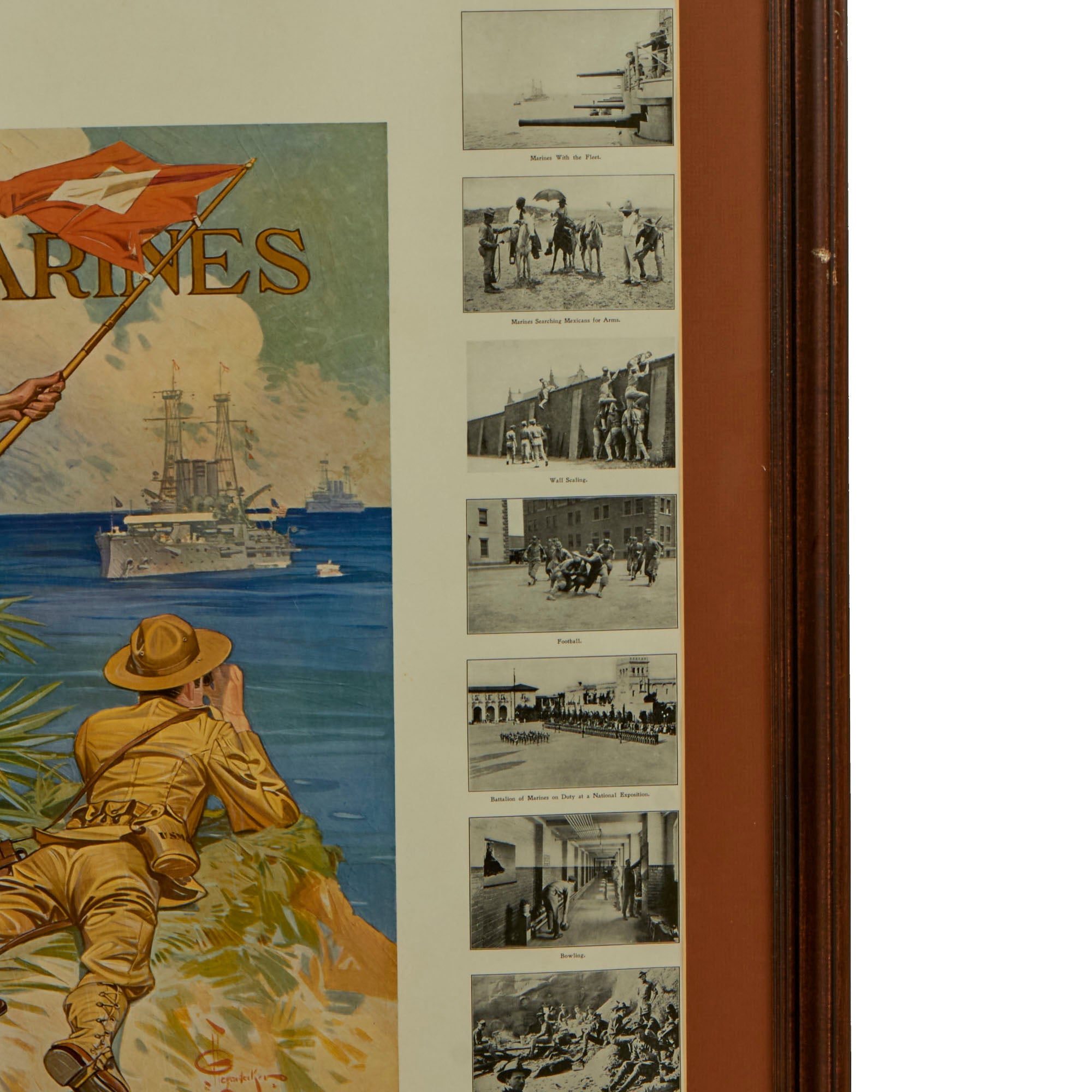 This is an extraordinarily scarce Marine Corps poster, one that had several different variations with the depiction in the center changing. This is considered the most sought-after of the variants, featuring two well-detailed Marines in their P1912 Cartridge belts & Canteens with the USMC stencil, waving a signal flag towards an approaching vessel. This is a fantastic illustration of what the Marine Corps were Pre-World War I. The Corps was a small and underappreciated force whose mission was limited to providing ships detachments and was considered by many as an anachronism of the days of sail. When WWI began the Marine Corps was expanded in order to support the American Expeditionary Force being sent to support the Allied Powers under General Pershing.