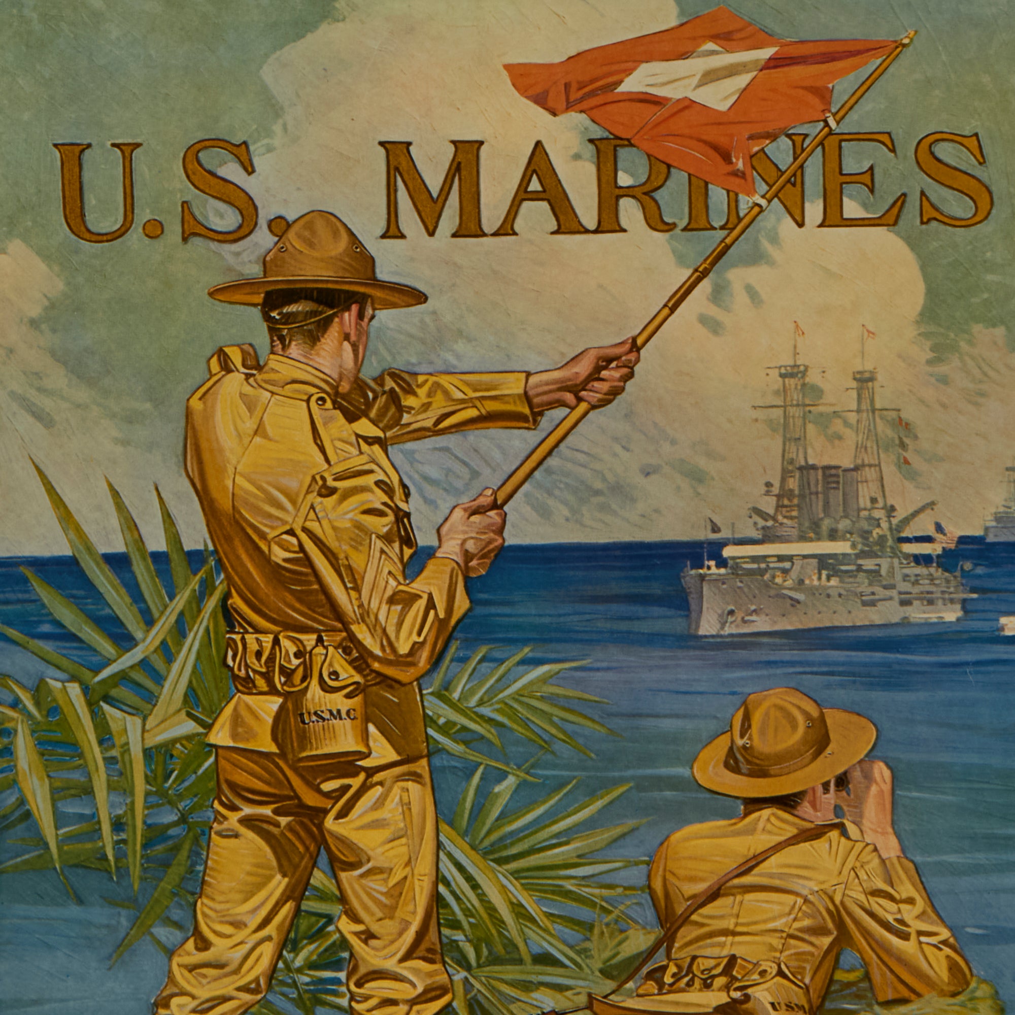 Original Item: Only One Available. As was common for many branches of the military before the outbreak of World War I, the U.S. Marines' tactic for attracting new recruits focused on the more exciting aspects of military life like those pictured in this poster, such as engaging in low-risk skirmishes during the "Banana Wars," comradery, learning new skills, and the opportunity to visit exotic locales.