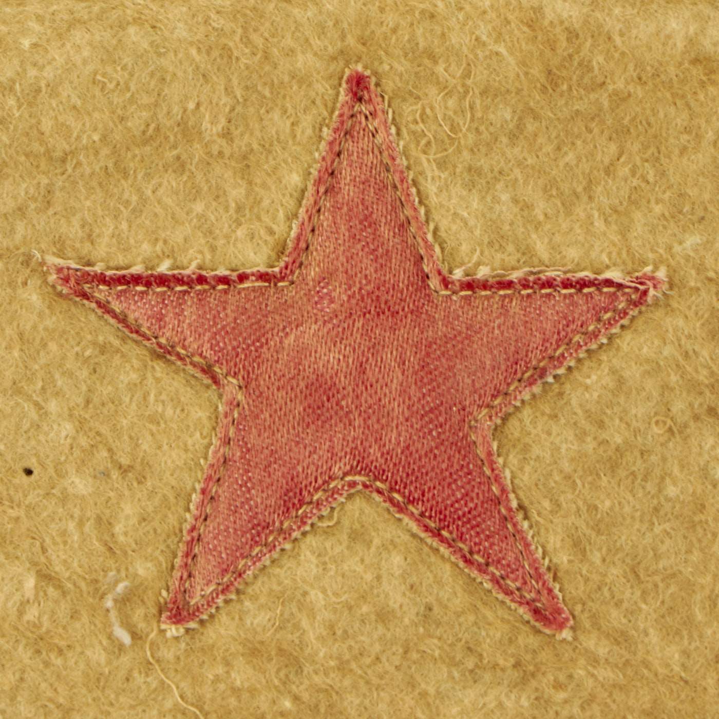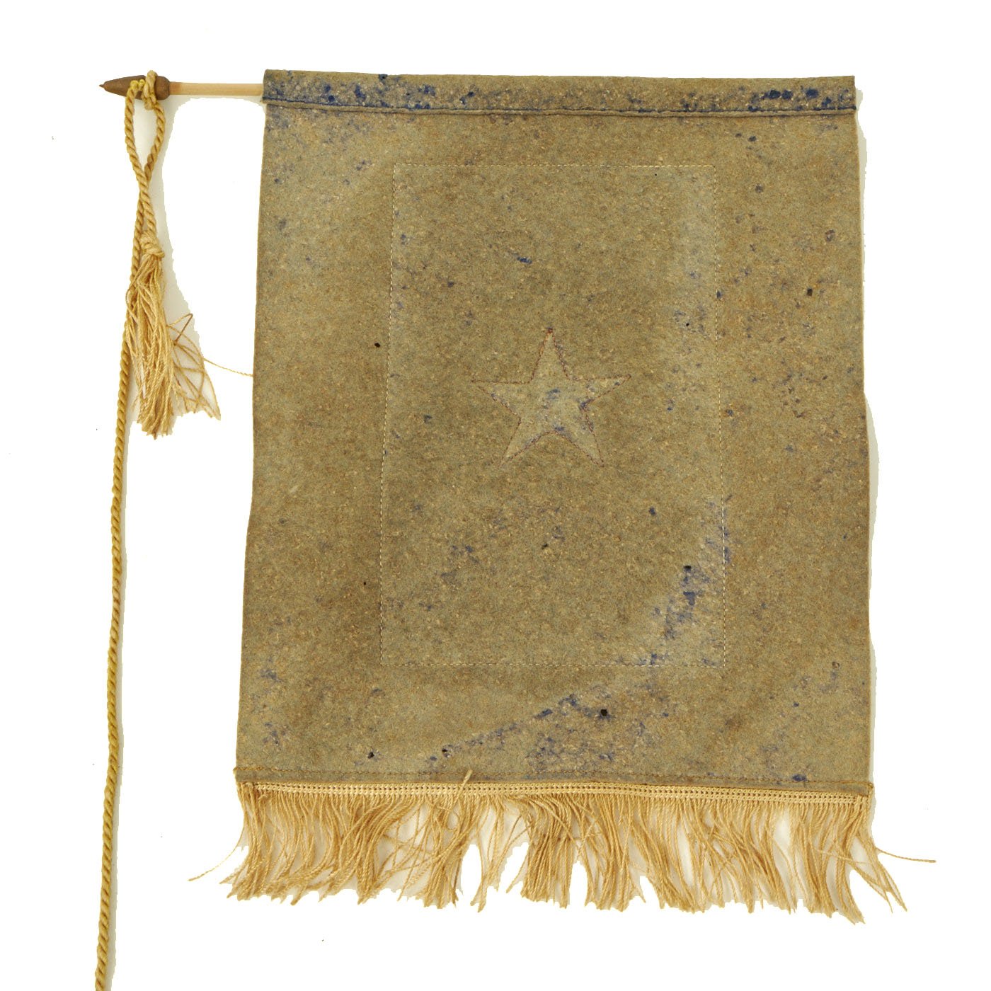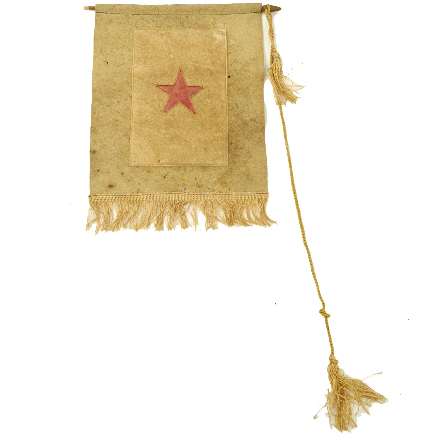 The second example has one star, and interestingly has the colors reversed, so this is more of a "red star" banner. The service flag was brand new for WWI, so there were definitely more variations than seen later. It is made of felt, with a nice fringe on the bottom, and a woven red star in the center. The rest of the banner is made from felt, and originally the background piece was blue, but has faded quite a bit over the years. The reverse is also faded, but still does have traces of the original blue color. It measures 8 1/2"W x 10", and his attached to a hanger pole on the top, which has a very nice tassel. There is also a fringe on the bottom of the flag.