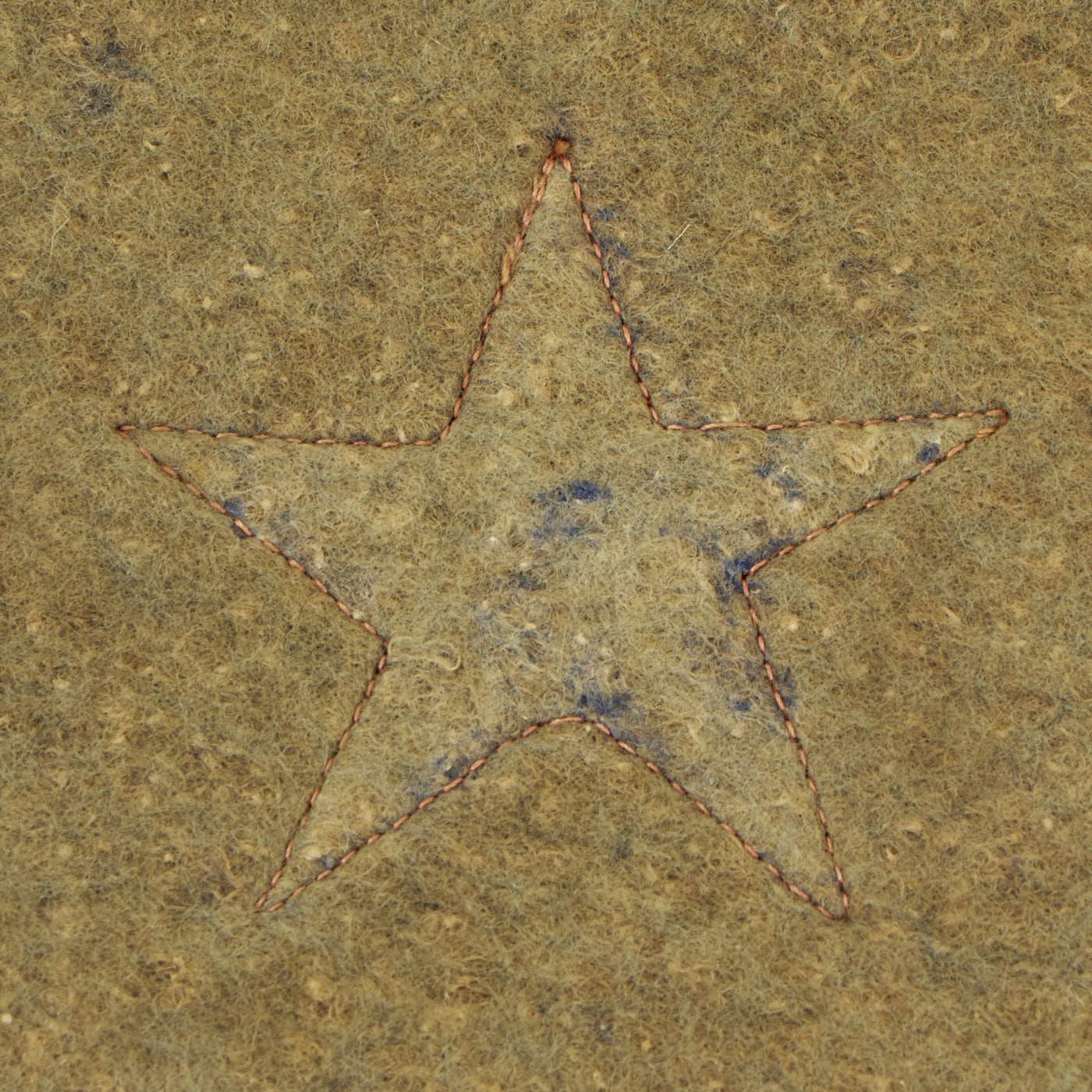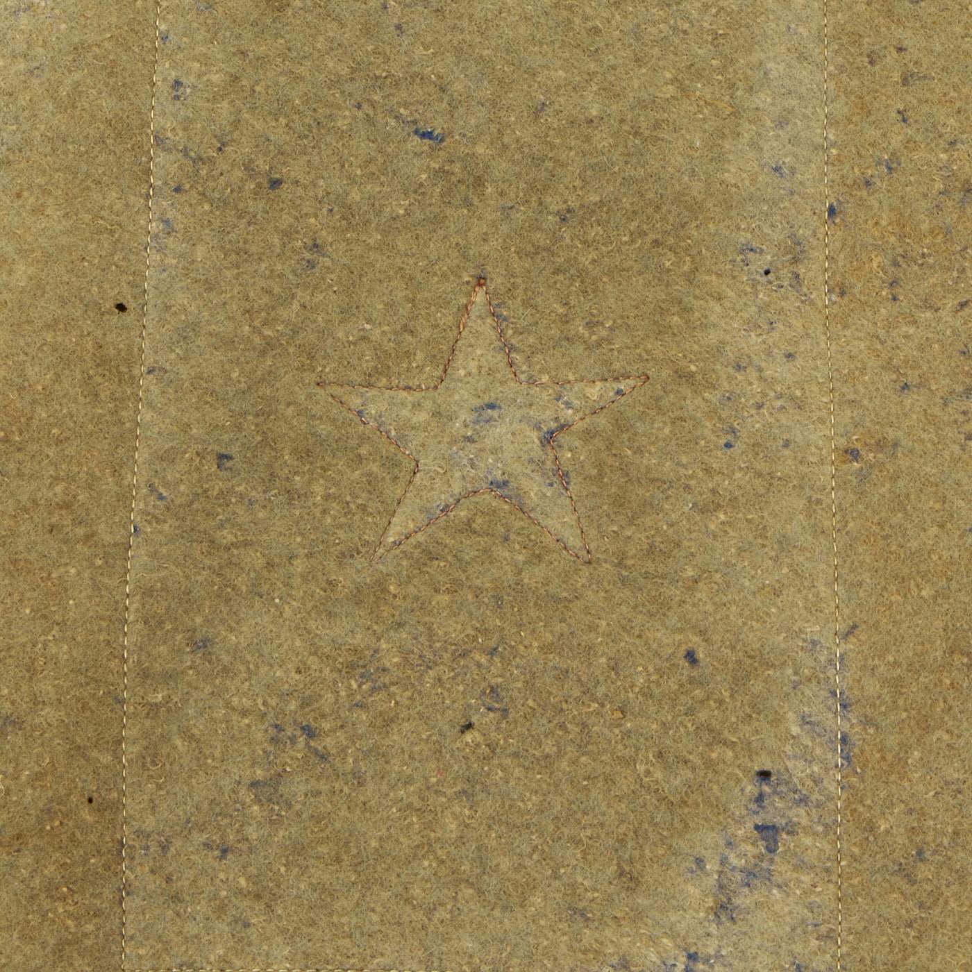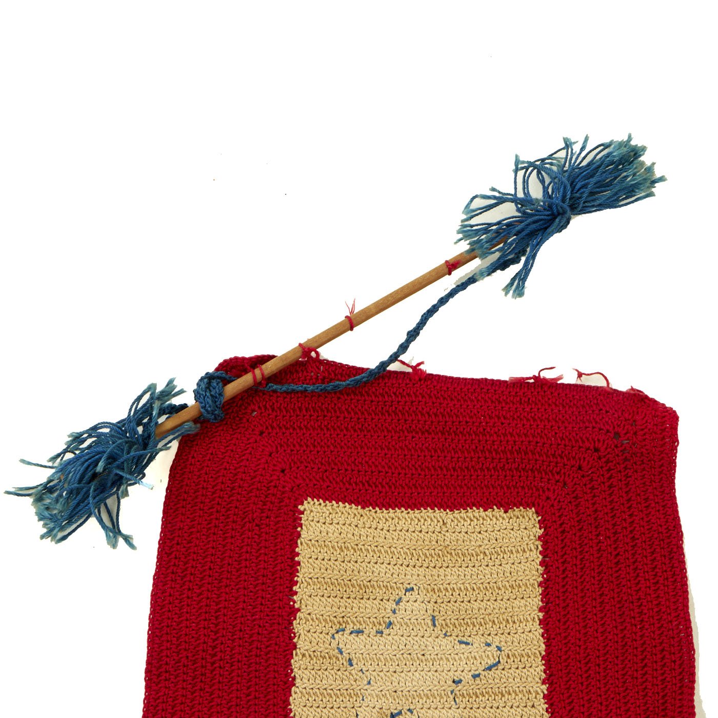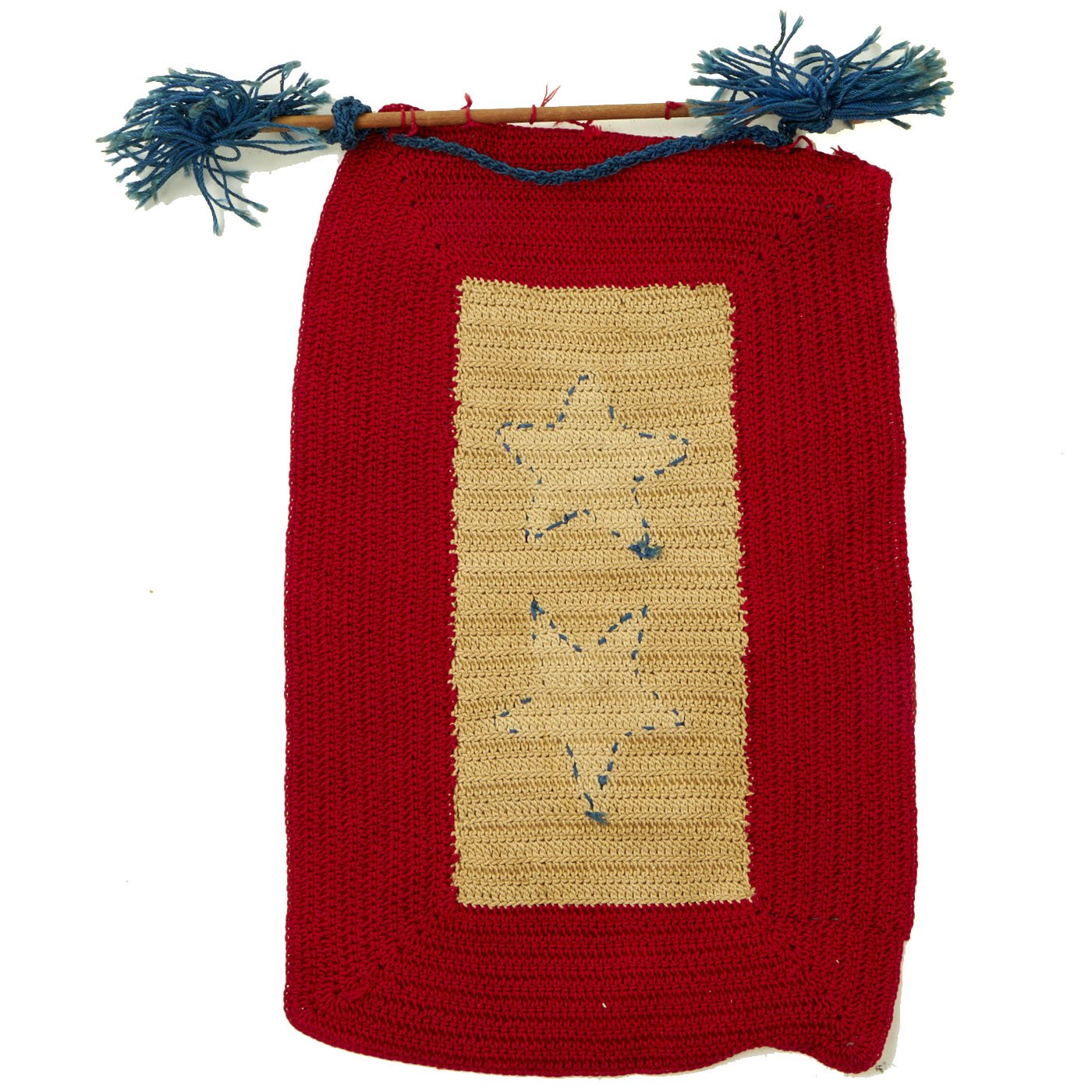 The second example has one star, and interestingly has the colors reversed, so this is more of a "red star" banner. The service flag was brand new for WWI, so there were definitely more variations than seen later. It is made of felt, with a nice fringe on the bottom, and a woven red star in the center. The rest of the banner is made from felt, and originally the background piece was blue, but has faded quite a bit over the years. The reverse is also faded, but still does have traces of the original blue color. It measures 8 1/2"W x 10", and his attached to a hanger pole on the top, which has a very nice tassel. There is also a fringe on the bottom of the flag.