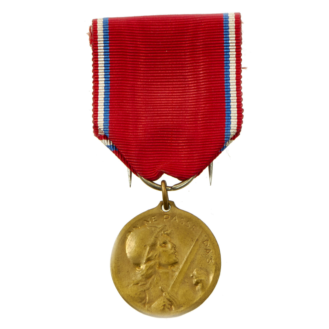 The medal shows a red ribbon with a French flag supporting a bronze badge. The obverse shows the head of the Republic (a symbol of the IIIrd French Republic) and the famous sentence pronounced by Robert Nivelle: “Ils ne passeront pas”, translated as: they will not break through.