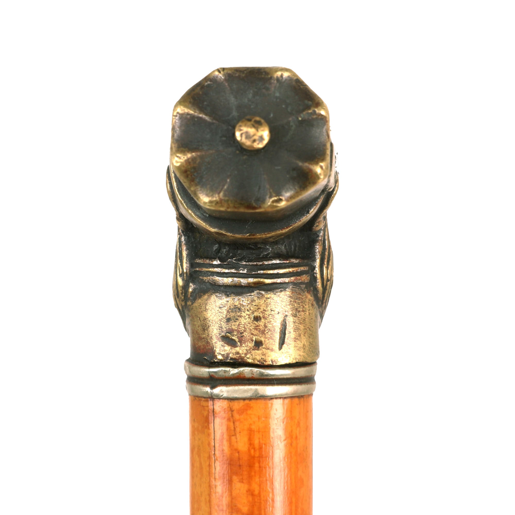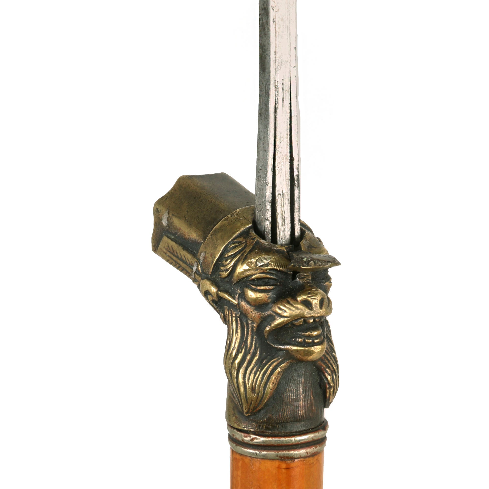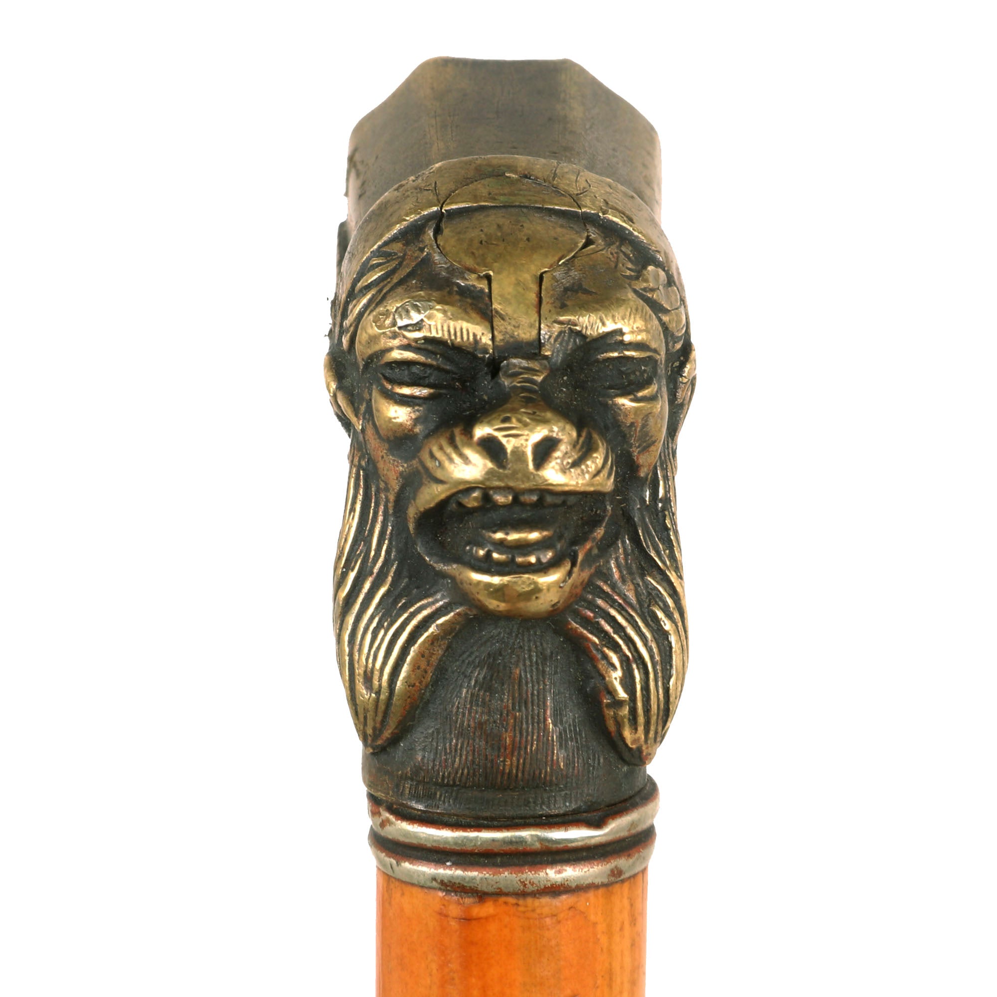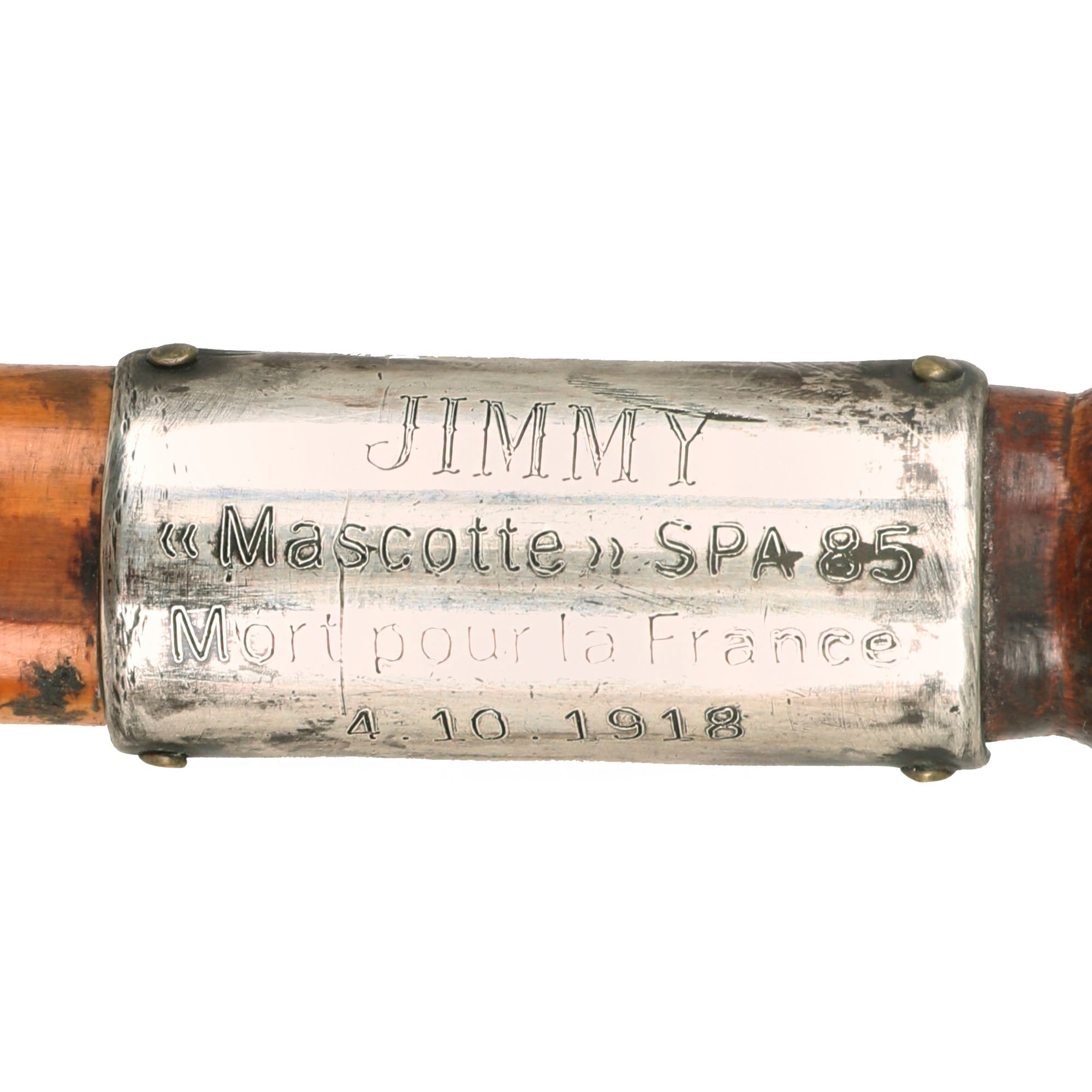 The cane measures roughly 34½“, but with the sword extended fully, it measures approximately 41” total. The small silver plaque on the cane reads JIMMY “MASCOTTE” SPA 85 MORT POUR LA FRANCE 4.10.1918. The head of the cane is brass and sculpted into the shape of a monkey wearing a tall hat, with a very small tab at the forehead that, when opened, allows the user to swing the cane downwards to reveal the sword hidden within. This is a completely unique piece that shows expert craftsmanship. The sword can be retracted by squeezing it at the bottom to let it fall back into the cane recess. The cane comes with a few printed pages of research which should be a great starting point for the next owner!