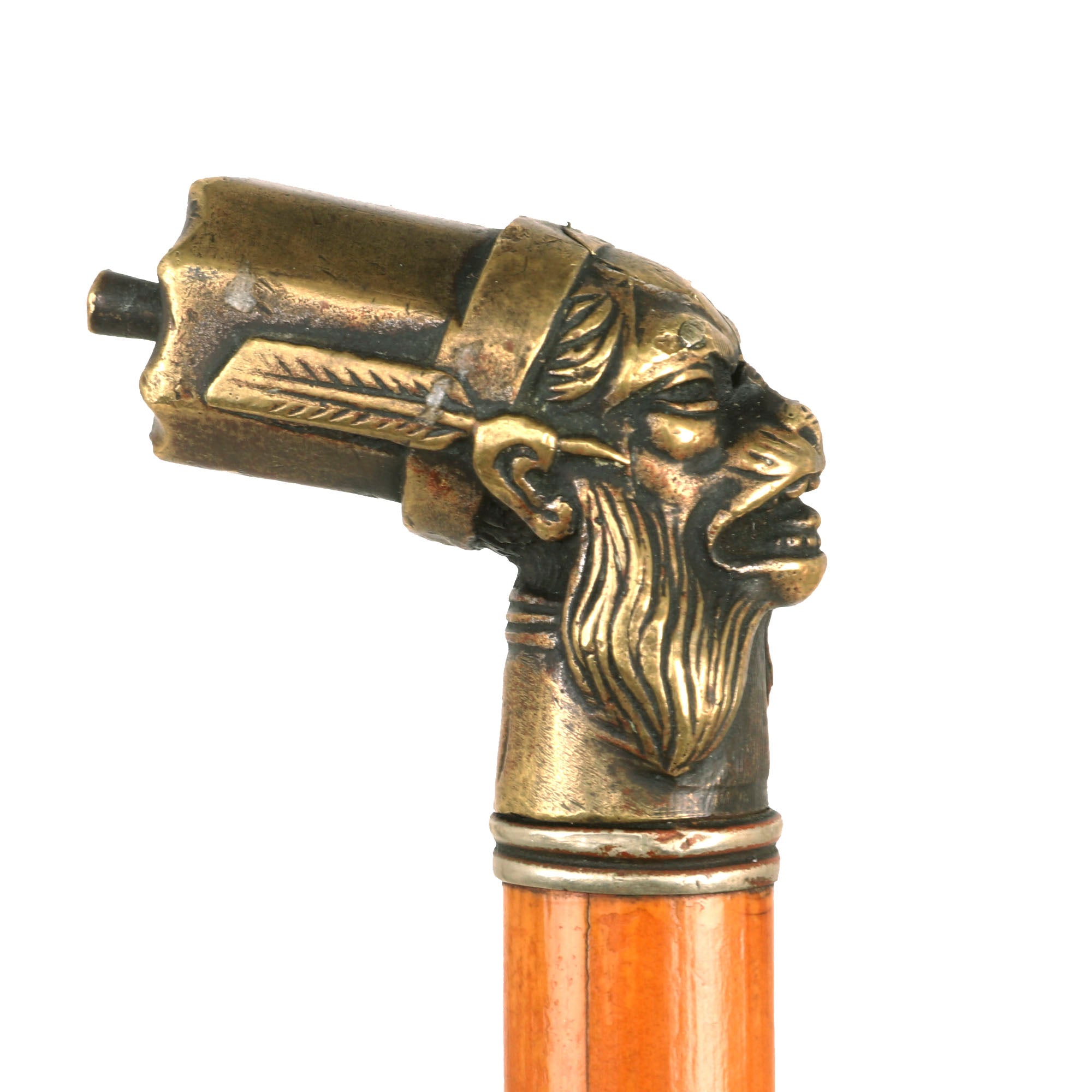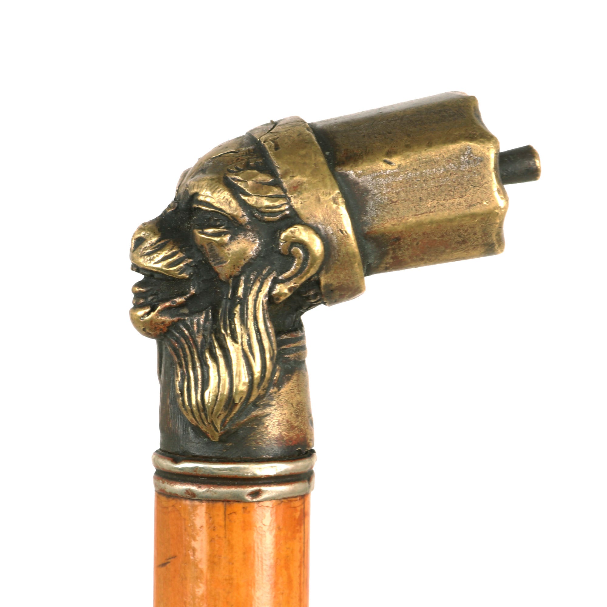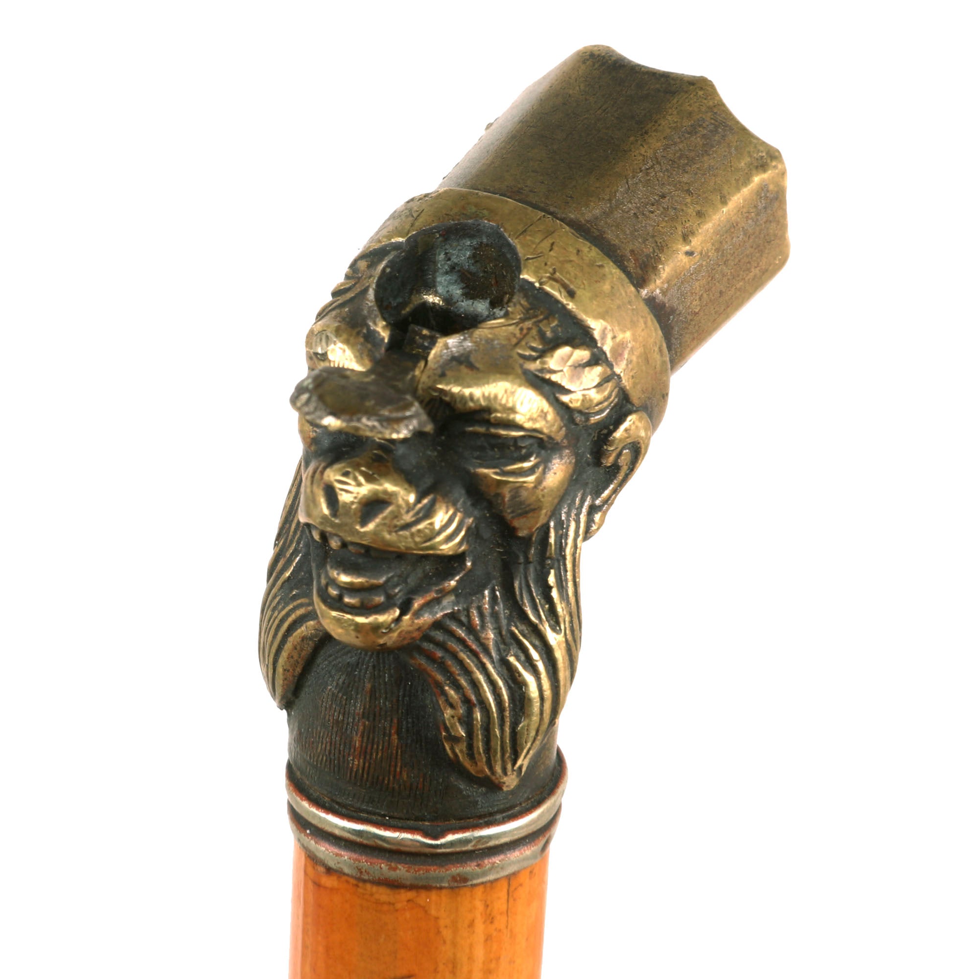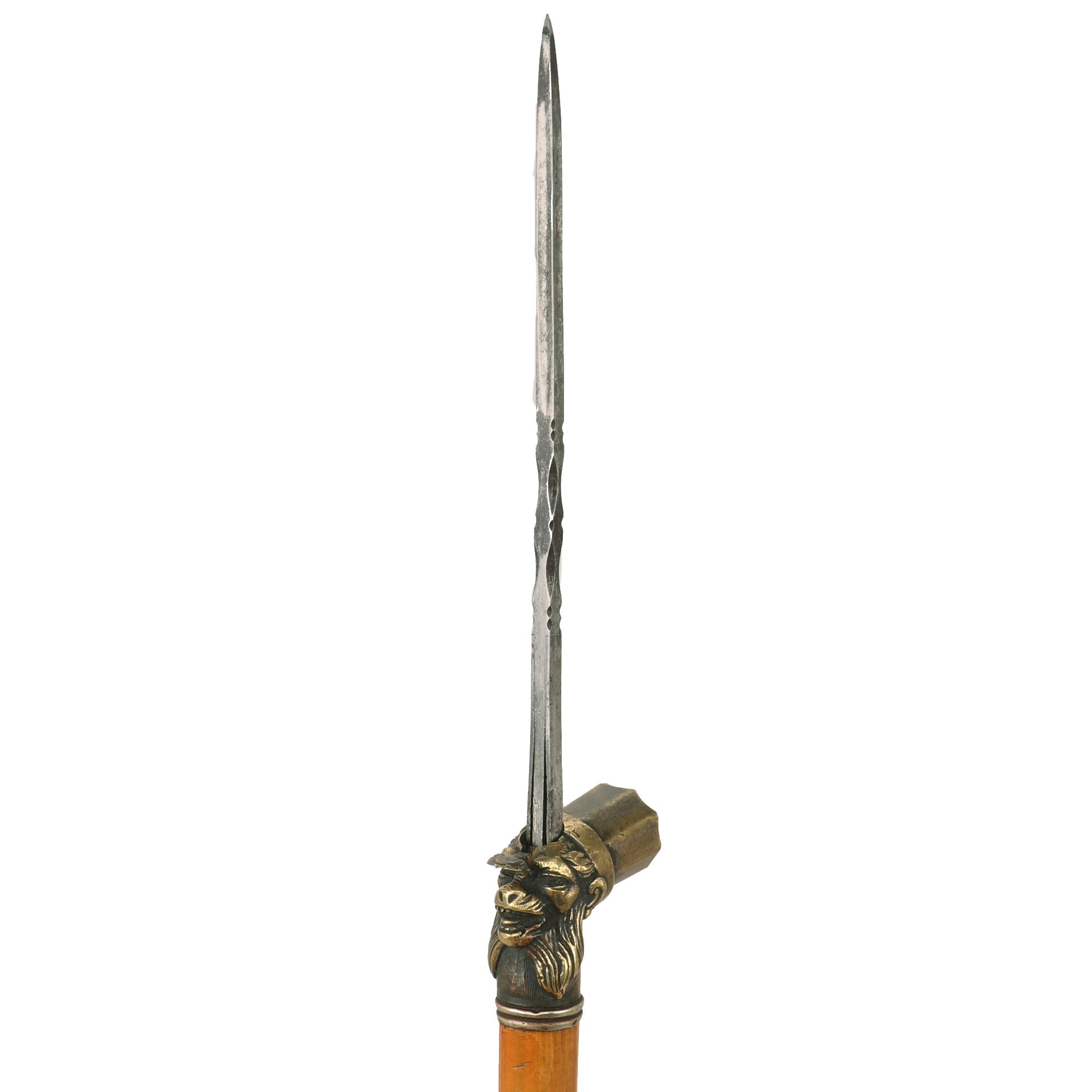 The cane measures roughly 34½“, but with the sword extended fully, it measures approximately 41” total. The small silver plaque on the cane reads JIMMY “MASCOTTE” SPA 85 MORT POUR LA FRANCE 4.10.1918. The head of the cane is brass and sculpted into the shape of a monkey wearing a tall hat, with a very small tab at the forehead that, when opened, allows the user to swing the cane downwards to reveal the sword hidden within. This is a completely unique piece that shows expert craftsmanship. The sword can be retracted by squeezing it at the bottom to let it fall back into the cane recess. The cane comes with a few printed pages of research which should be a great starting point for the next owner!
