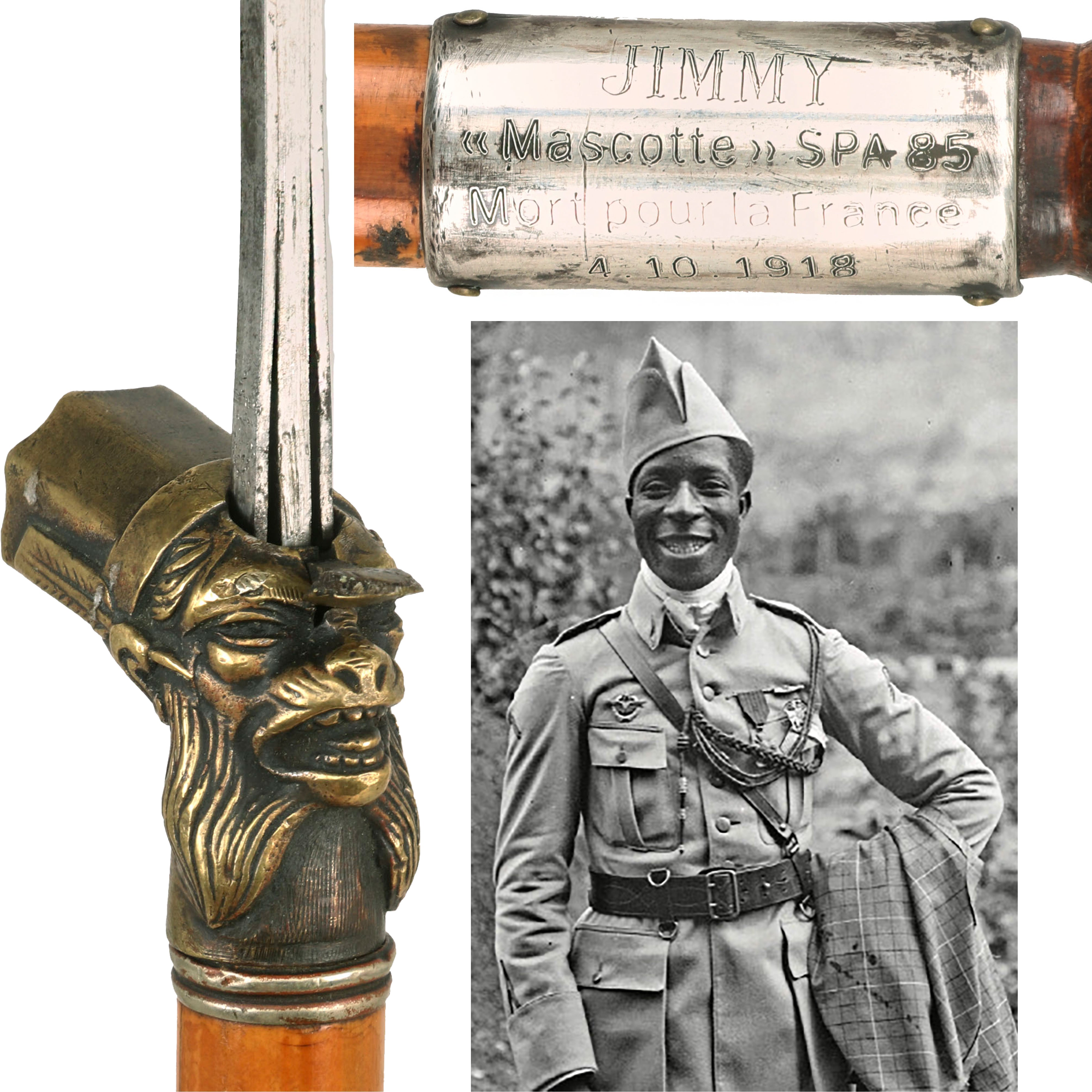 Original Item. One of a Kind. This is one of the most phenomenal pieces of aviation history we have ever had the privilege to offer. This tremendous custom-made sword cane was constructed for Eugene Bullard, the world’s first Black fighter pilot. Bullard was famous for flying with his pet monkey “Jimmy”, the squadron mascot, who passed away on April 10th, 1918. Bullard had this cane made in Jimmy’s honor, the head sculpted to look like Jimmy, with the top of the cane opening up to allow a spear pointed sword to shoot out. There is a silver plaque commemorating Jimmy on the side, an excellent piece of craftsmanship that deserves its own display case and story.