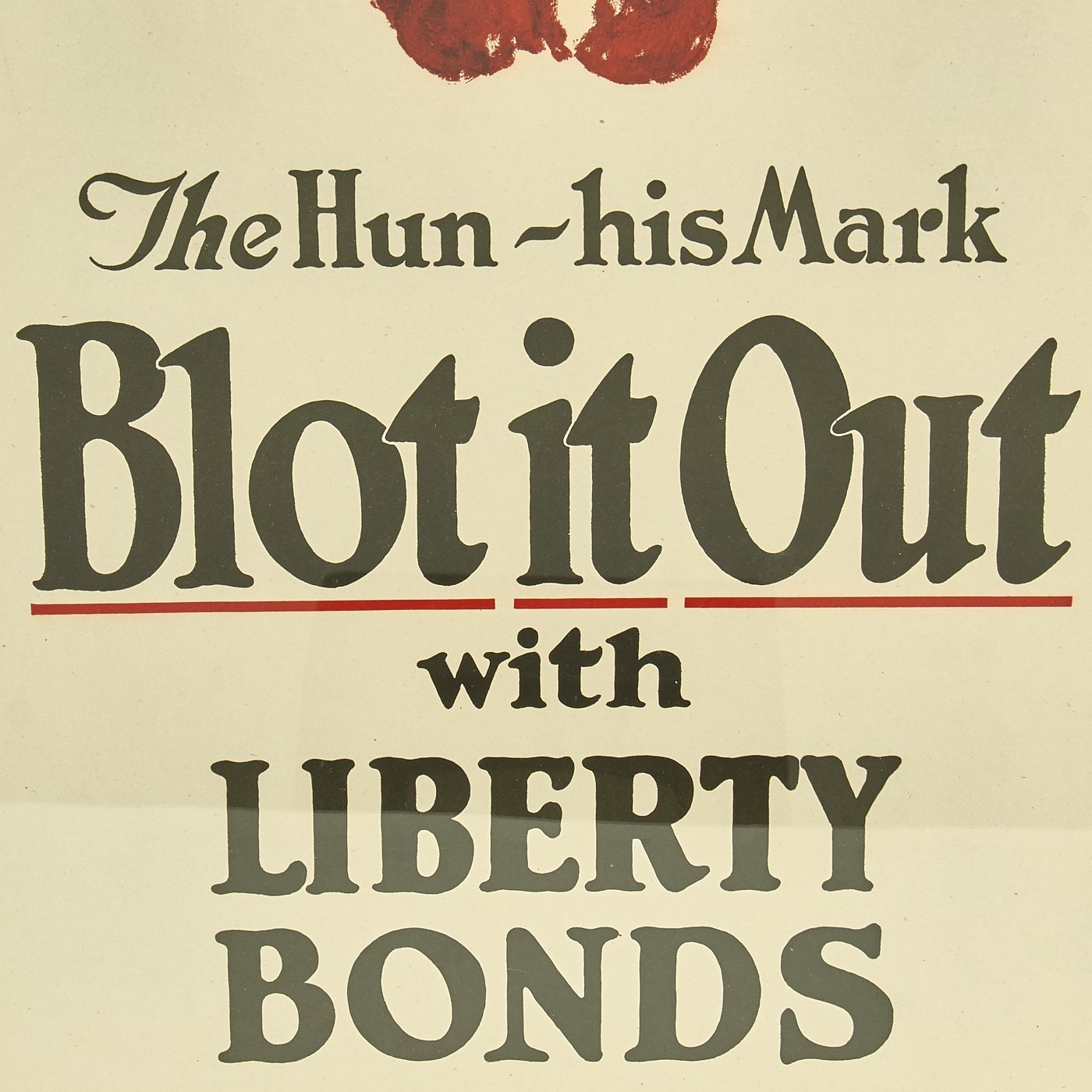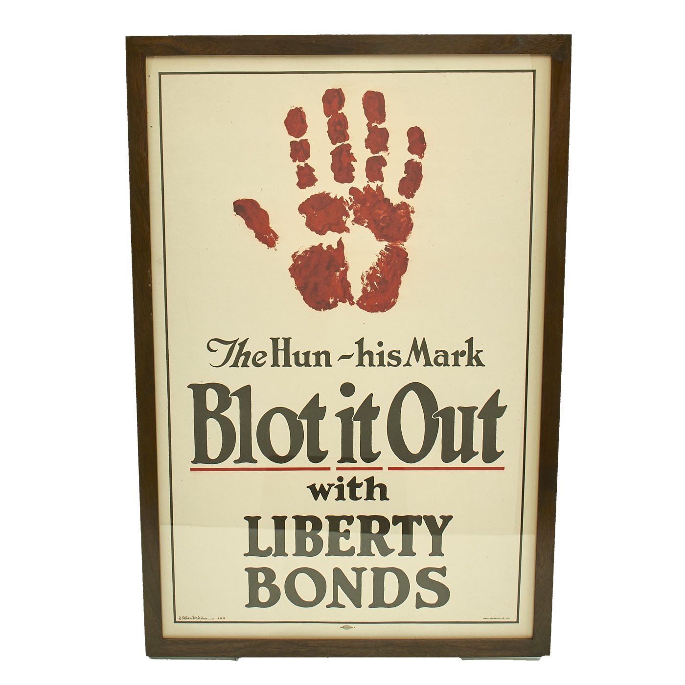 Original Item: Only One Available. The Committee of Public Information commissioned “The Hun, His Mark,” in 1917. This striking poster was designed by Chicago artist James Allen St. John who was best known, during the early part of the twentieth century, as a fantasy illustrator who worked closely with the Tarzan author Edgar Rice Burroughs to make his novels come to life for readers. In this poster, St. John depicts the bloody handprint that symbolized the attack of the German soldier, or “Hun” (a derogatory term). As the poster states, people were told by buy liberty bonds as a way to directly counteract the German threat that could possibly sweep the United States if not contained. This poster signified a shift toward a more gruesome and personal approach to get people to buy the bonds that funded the American war effort. Fear was used as a tool so that people would have something to think about while their husbands and sons were fighting in Europe. The rampant xenophobia and anti-German immigrant sentiment within the United States at the time also caused many German-Americans to feel compelled to contribute to such campaigns as a way to prove their loyalty.