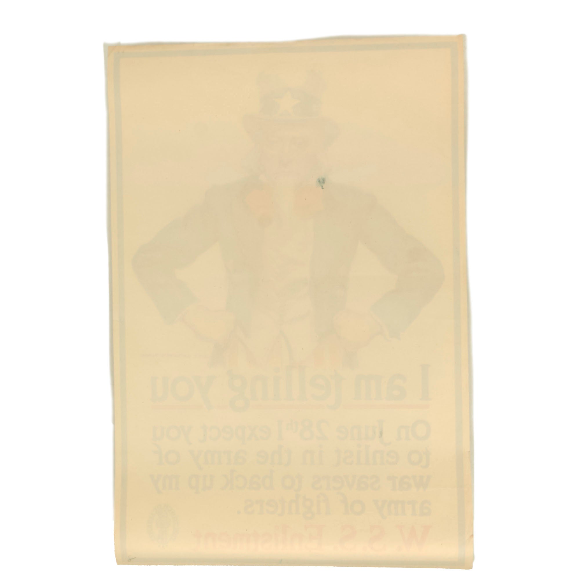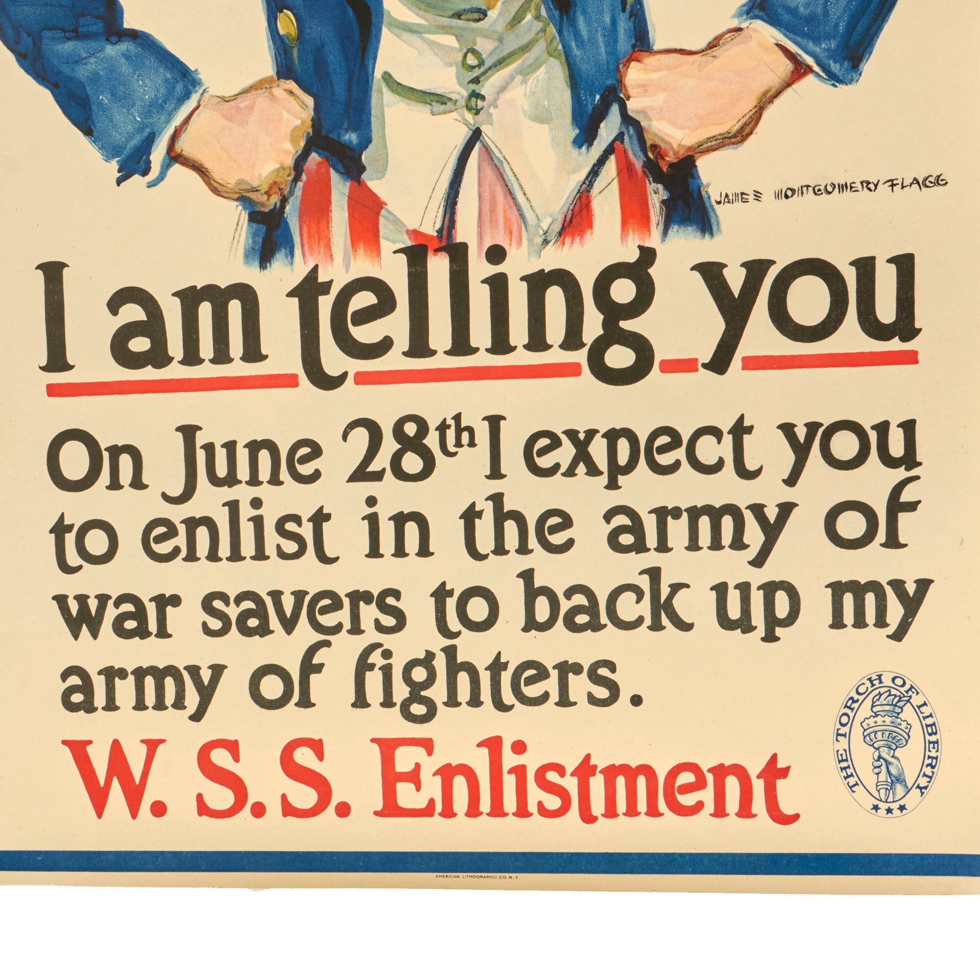 Original Item. Only One Available. Created by James Montgomery Flagg in 1918, this World War I poster is part of one of the most famous poster series in the world. Uncle Sam is depicted here, proclaiming to the American public, "I am telling you, On June 28th I expect you to enlist in the army of war savers to back up my army of fighters". This example was encouraging people to join the War Savings Stamps.