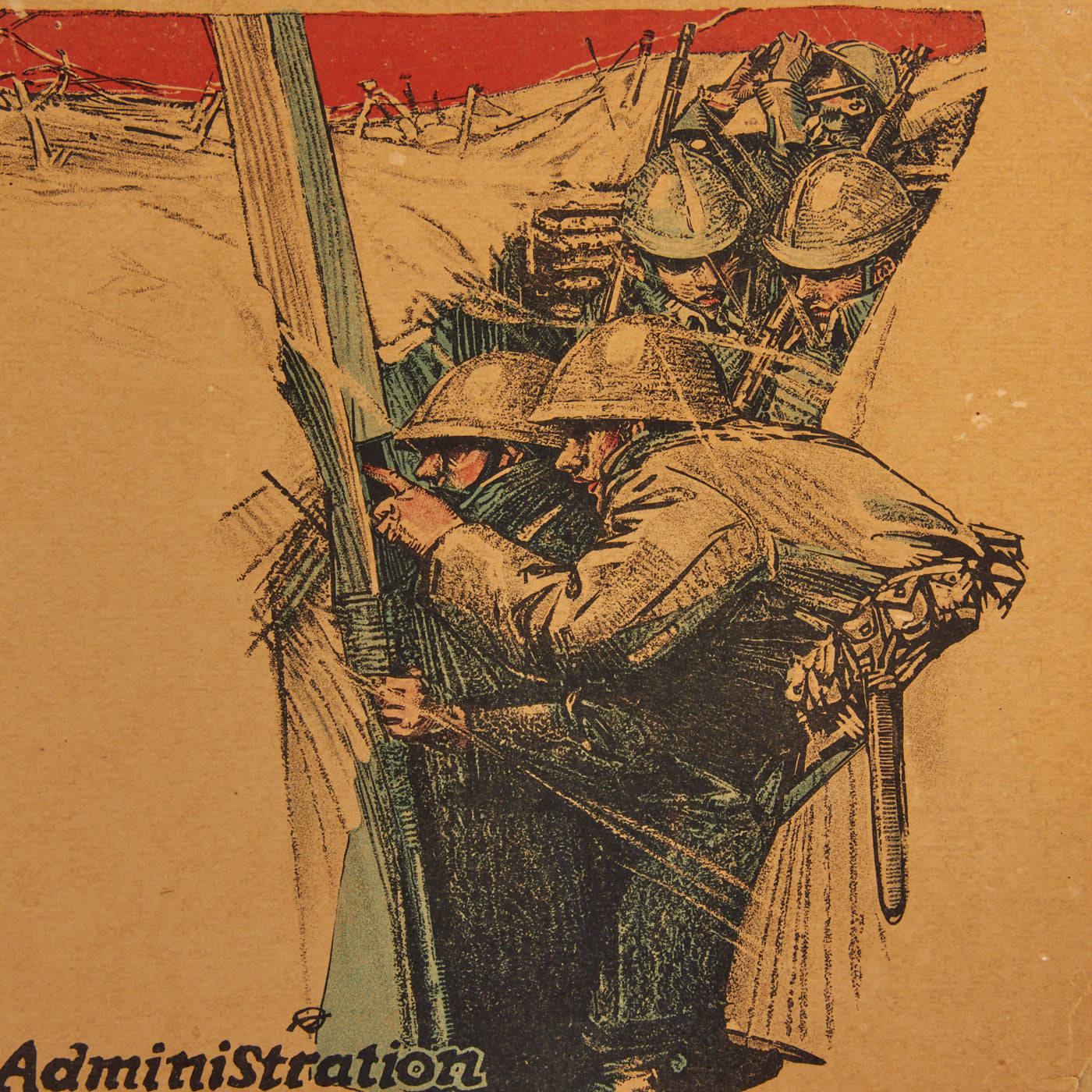 This lovely poster shows a sketch of American Doughboys crouched over in a trench looking through what appears to be a periscope looking out into “No Man’s Land”. The colors used are various shades of blues, oranges and black which all complement each other very well on the light tan background. The main body has the following message:
