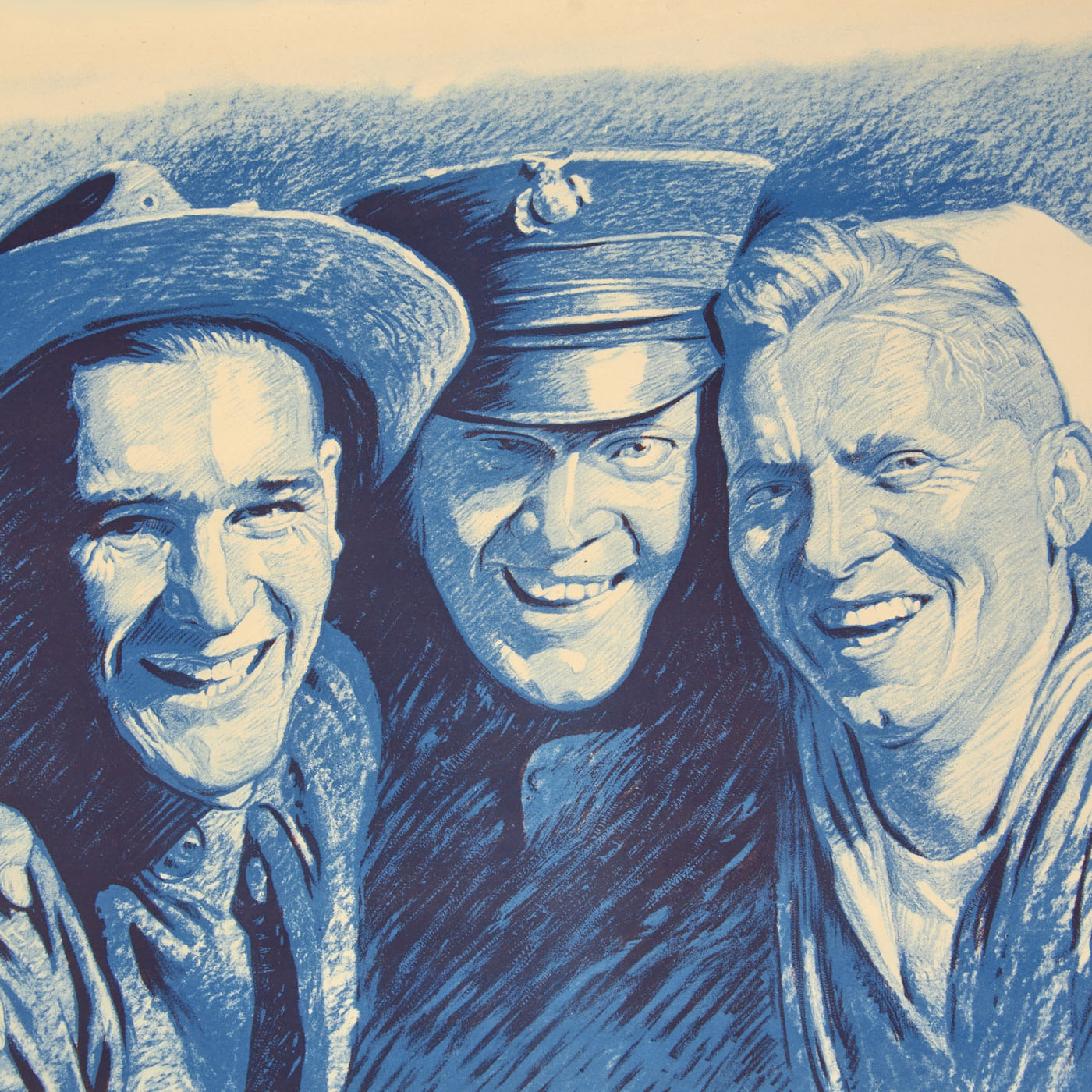 This poster is an example of one of the methods used in advertising this fundraiser. The poster features 3 servicemen; Soldier, Marine and Sailor all smiling with the Marine having his arms around both of his comrades on his flank. Below this image, also in blue, is the following message:
