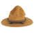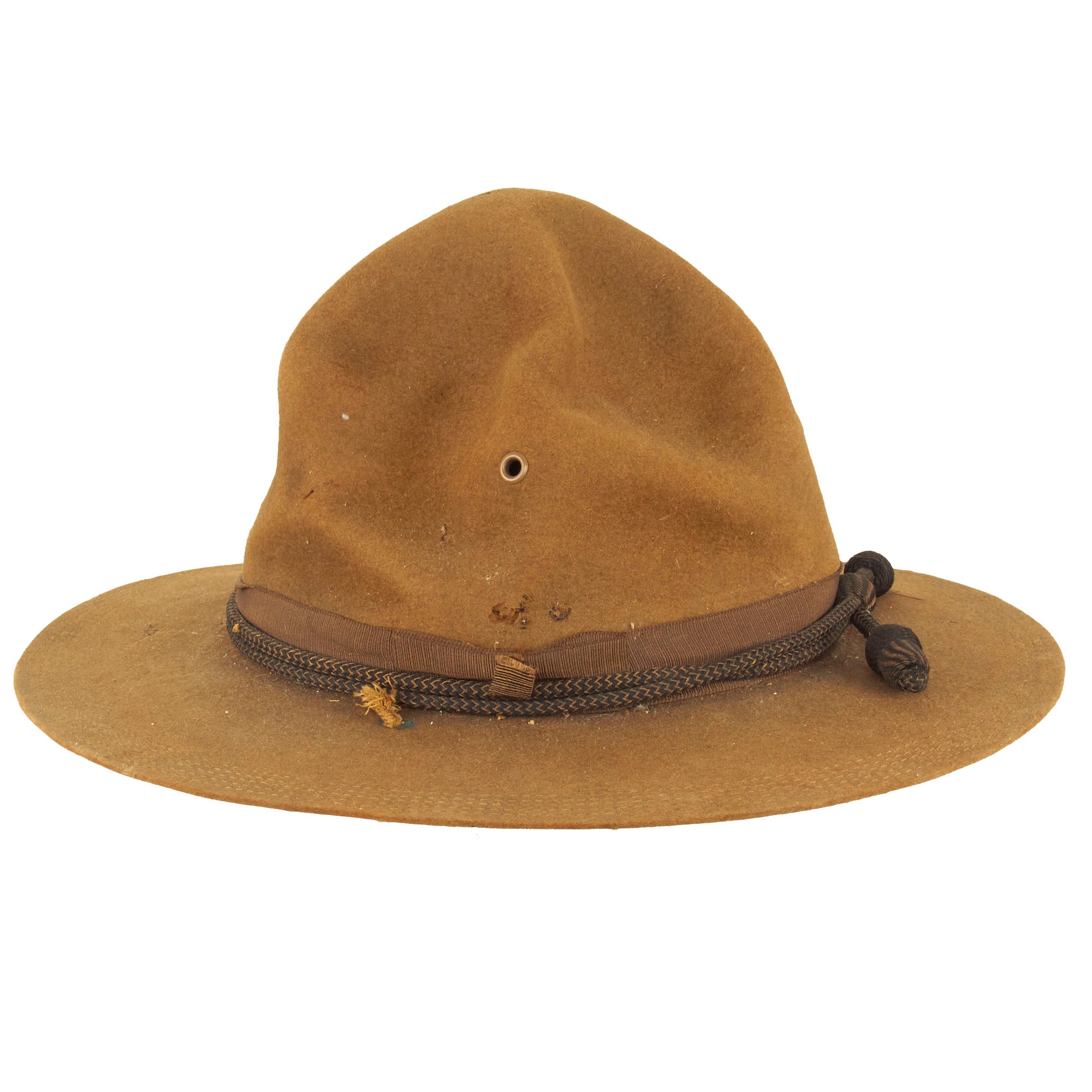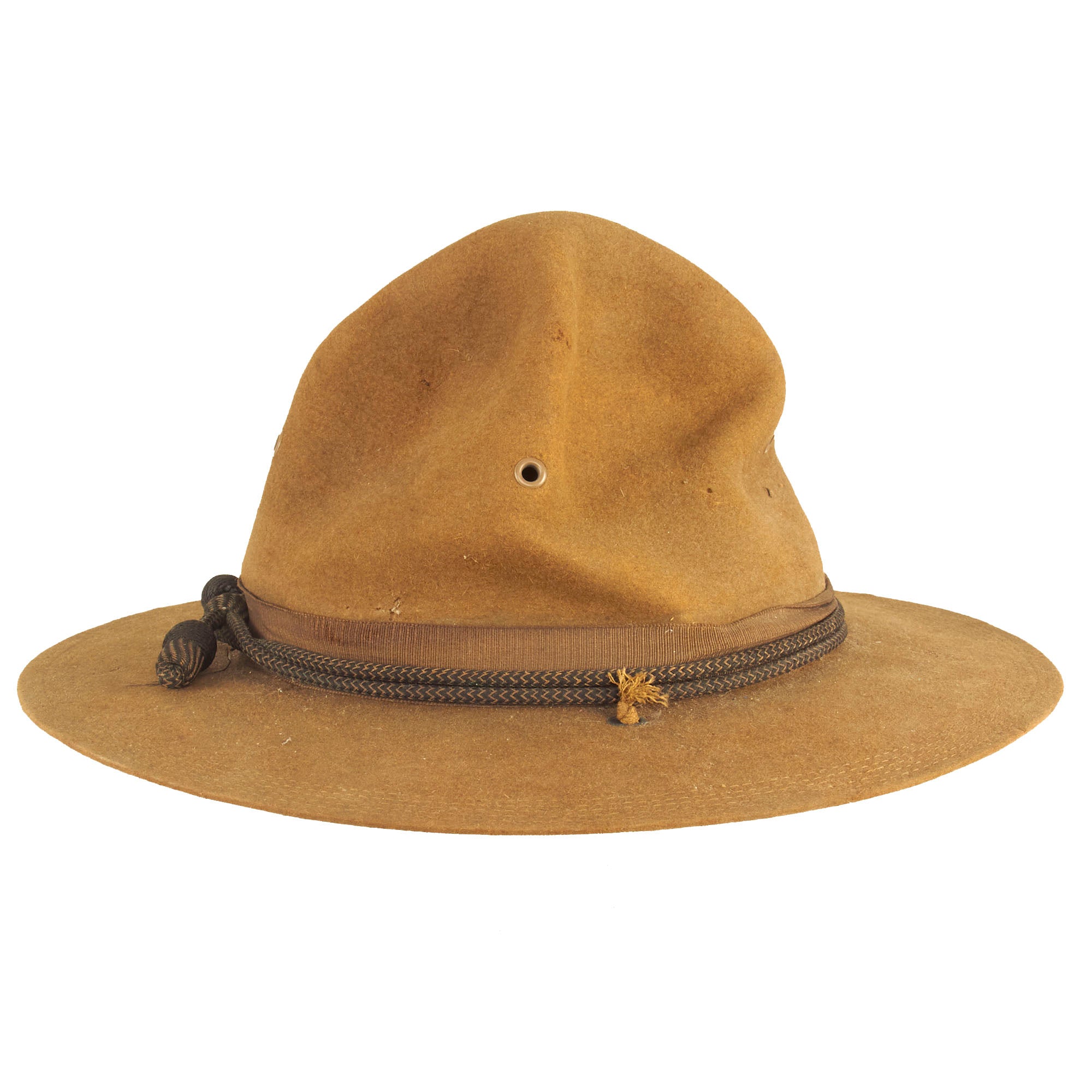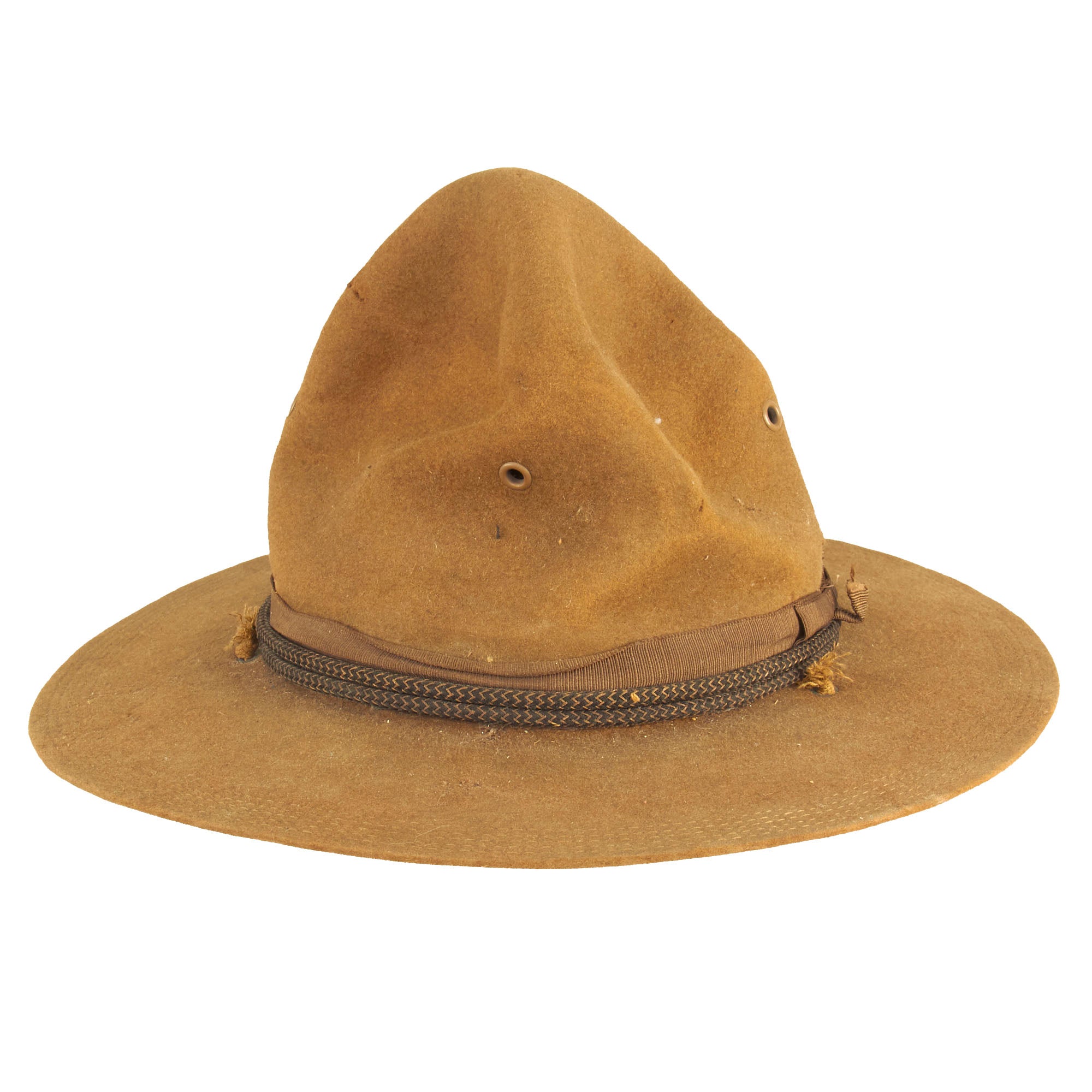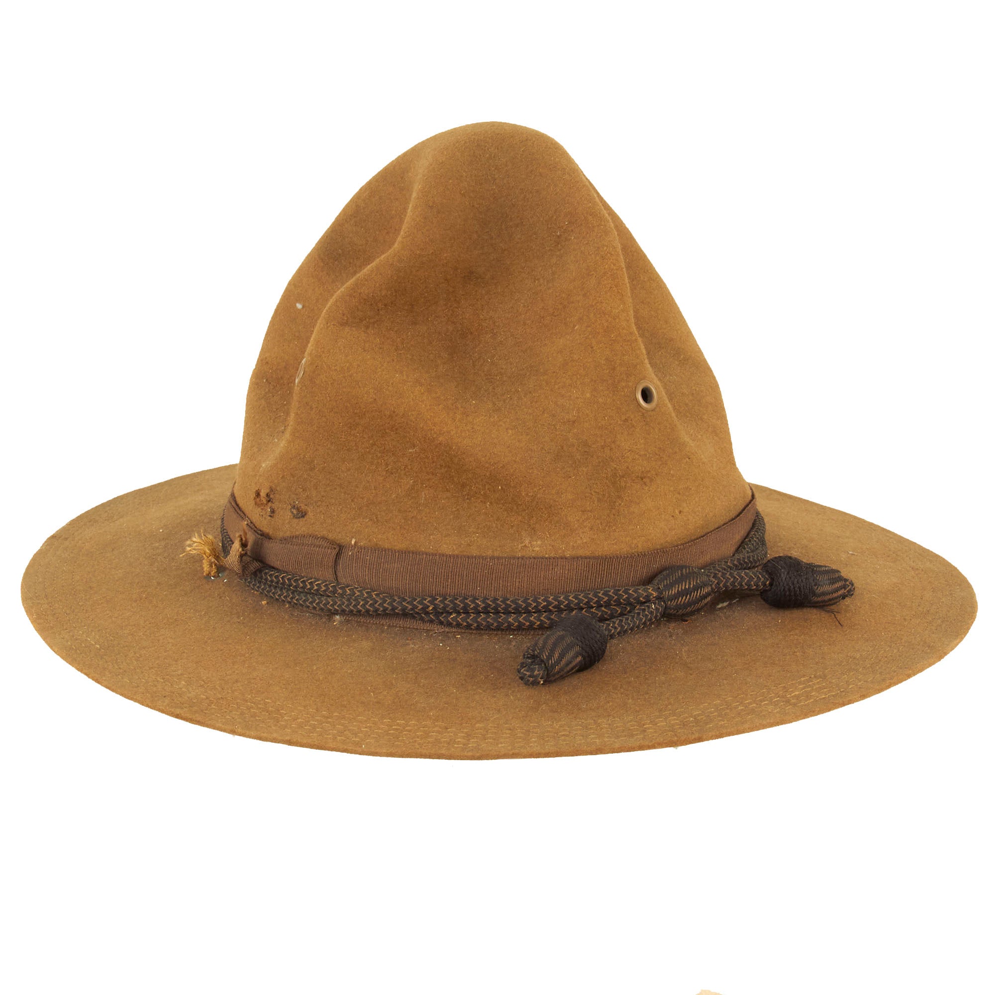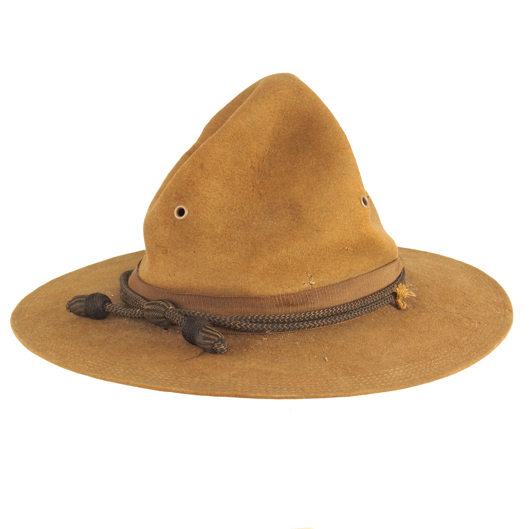 Original Item: Only One Available. The Hat, Service, M1911 (Campaign Hat) was made of OD wool felt with a wide brim and "Montana peak" crown. There were ventilation holes in the crown with grommets, a silk hatband, and a silk and brass braid cord closed by a knot and terminated with a tassel. Inside was a leather sweatband and an attached chin strap. The Army model was dark brown OD in color.