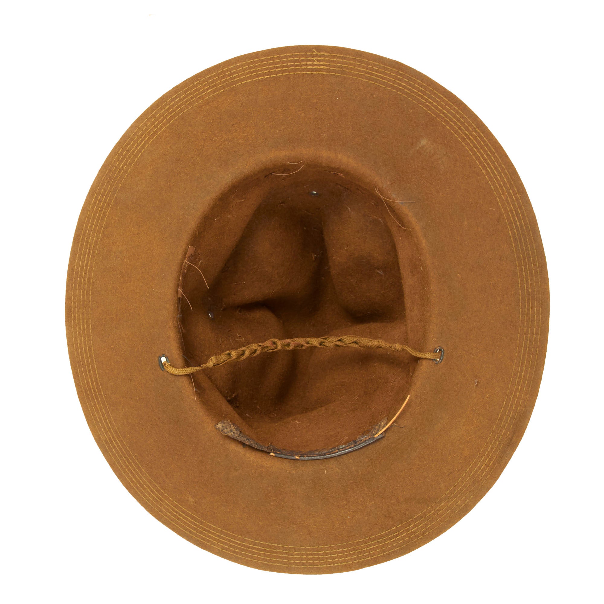 This campaign hat is a private purchase example and does not have the decorative rows of stitching around the brim, often seen with private purchases. There are no manufacturers labels or stamps present nor is there a size stamp we can find.