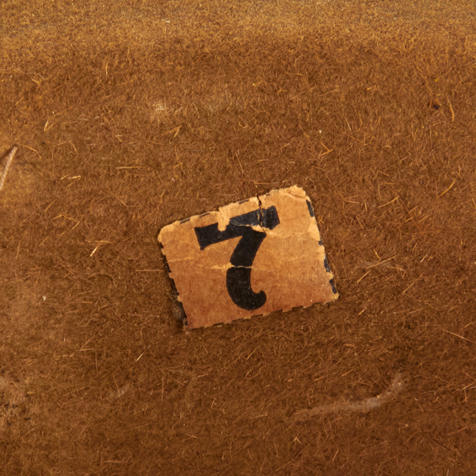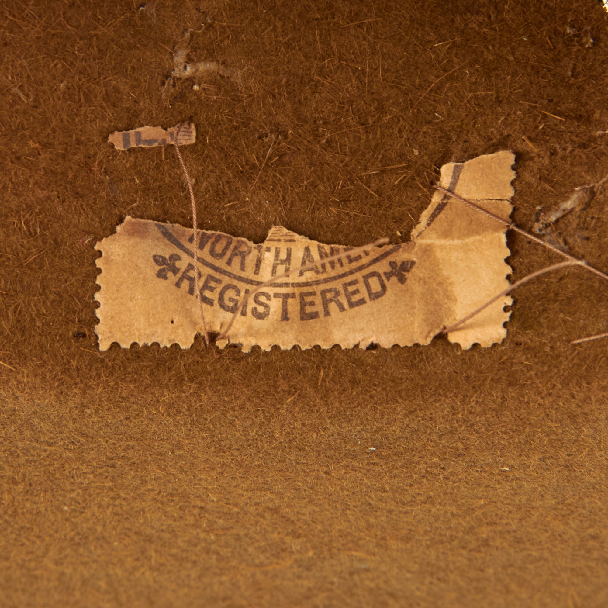 The hat is offered in good condition considering it is well over 100 years old! The fine fur felt is good with some moth nips and tearing peppered throughout. The original crown band ribbon is intact with the original leather chin strap having been replaced with braided cotton string, most likely done for display purposes.