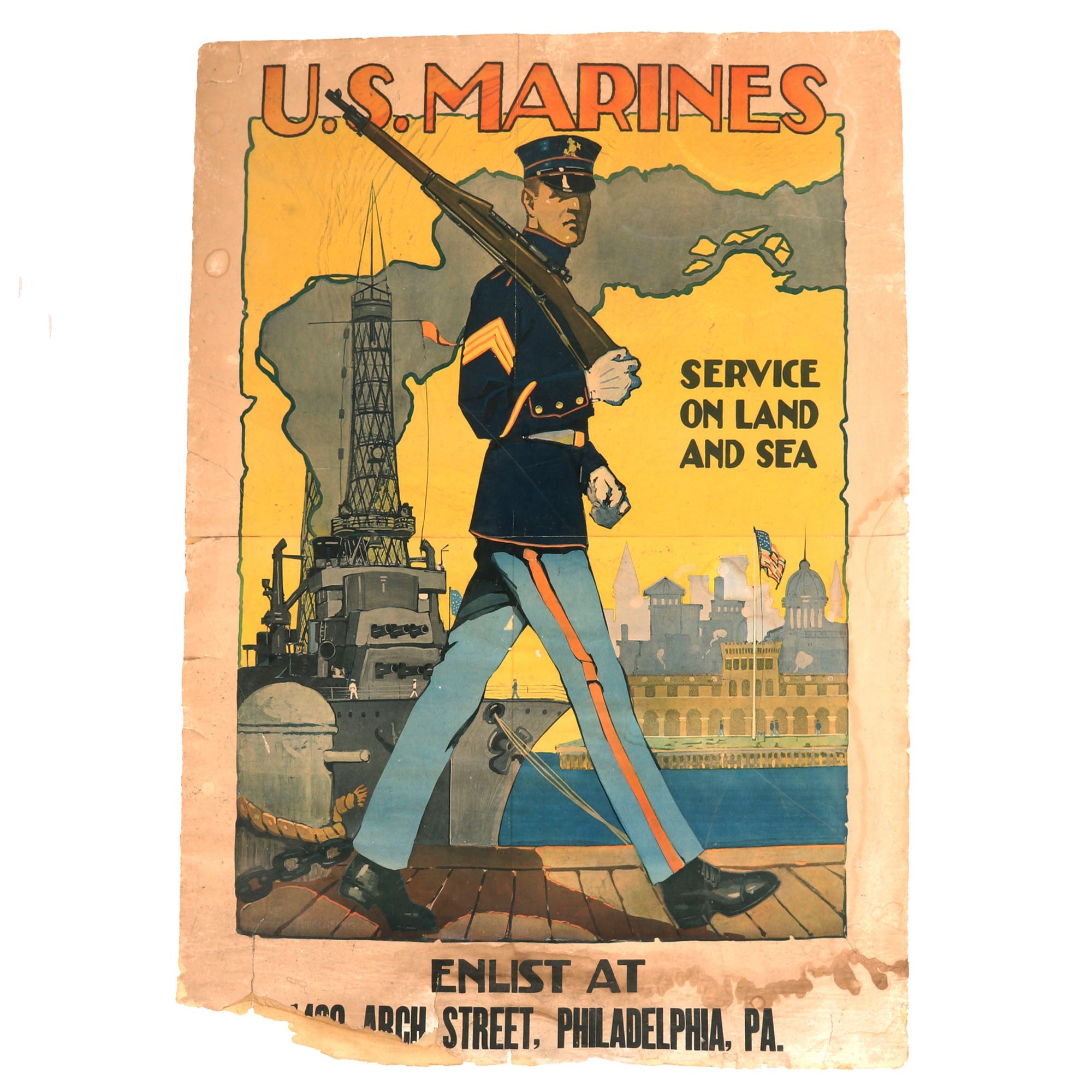 Original Item: Only One Available. This is a very rough example of one of the most popular US Marine Corps recruiting posters. With the founding of the Corps in 1775, the first recruiting drive was held at Tun Tavern in Philadelphia. At the time, the recruiting of volunteers was the responsibility of the various barracks commanders scattered throughout the United States to guard naval installations and man ships. Recruiting posters through to the American Civil War promised prospective recruits of bounties and prizes for service at sea.
